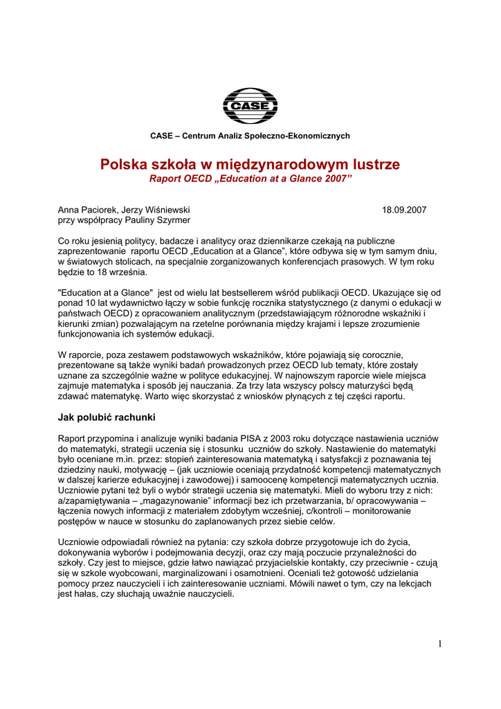 CASE – Centrum Analiz Społeczno-Ekonomicznych Polska szkoła w międzynarodowym lustrze Raport OECD „Education at a Glance 2007” Anna Paciorek, Jerzy Wiśniewski przy współpracy Pauliny Szyrmer 18.09.2007 Co roku jesienią politycy, badacze i analitycy oraz dziennikarze czekają na publiczne zaprezentowanie raportu OECD „Education at a Glance”, które odbywa się w tym samym dniu, w światowych stolicach, na specjalnie zorganizowanych konferencjach prasowych. W tym roku będzie to 18 września. "Education at a Glance" jest od wielu lat bestsellerem wśród publikacji OECD. Ukazujące się od ponad 10 lat wydawnictwo łączy w sobie funkcję rocznika statystycznego (z danymi o edukacji w państwach OECD) z opracowaniem analitycznym (przedstawiającym różnorodne wskaźniki i kierunki zmian) pozwalającym na rzetelne porównania między krajami i lepsze zrozumienie funkcjonowania ich systemów edukacji. W raporcie, poza zestawem podstawowych wskaźników, które pojawiają się corocznie, prezentowane są także wyniki badań prowadzonych przez OECD lub tematy, które zostały uznane za szczególnie ważne w polityce edukacyjnej. W najnowszym raporcie wiele miejsca zajmuje matematyka i sposób jej nauczania. Za trzy lata wszyscy polscy maturzyści będą zdawać matematykę. Warto więc skorzystać z wniosków płynących z tej części raportu. Jak polubić rachunki Raport przypomina i analizuje wyniki badania PISA z 2003 roku dotyczące nastawienia uczniów do matematyki, strategii uczenia się i stosunku uczniów do szkoły. Nastawienie do matematyki było oceniane m.in. przez: stopień zainteresowania matematyką i satysfakcji z poznawania tej dziedziny nauki, motywację – (jak uczniowie oceniają przydatność kompetencji matematycznych w dalszej karierze edukacyjnej i zawodowej) i samoocenę kompetencji matematycznych ucznia. Uczniowie pytani też byli o wybór strategii uczenia się matematyki. Mieli do wyboru trzy z nich: a/zapamiętywania – „magazynowanie” informacji bez ich przetwarzania, b/ opracowywania – łączenia nowych informacji z materiałem zdobytym wcześniej, c/kontroli – monitorowanie postępów w nauce w stosunku do zaplanowanych przez siebie celów. Uczniowie odpowiadali również na pytania: czy szkoła dobrze przygotowuje ich do życia, dokonywania wyborów i podejmowania decyzji, oraz czy mają poczucie przynależności do szkoły. Czy jest to miejsce, gdzie łatwo nawiązać przyjacielskie kontakty, czy przeciwnie - czują się w szkole wyobcowani, marginalizowani i osamotnieni. Oceniali też gotowość udzielania pomocy przez nauczycieli i ich zainteresowanie uczniami. Mówili nawet o tym, czy na lekcjach jest hałas, czy słuchają uważnie nauczycieli. 1 Jak się okazuje polscy uczniowie nie odbiegają od przeciętnej OECD w nastawieniu do matematyki. Natomiast plasują się nieznacznie poniżej średniej w ocenie stosunku do szkoły, szczególnie poczuciu przynależności i gotowości pomocy ze strony nauczycieli. Przy czym poczucie przynależności dodatnio wpływa na wyniki polskich uczniów w matematyce w stopniu znacznie wyższym niż przeciętnie w OECD. Spośród strategii uczenia się w przypadku naszych uczniów najbardziej skuteczna była strategia opracowywania. Co ciekawe - w innych krajach OECD częstsze wybieranie tej strategii nie przekłada się na wzrost wyników. Powiązania nastawienia do matematyki z wynikami badań PISA pokazują, że najsilniejszy wpływ na wyniki mają: przekonanie uczniów, że sobie poradzę z problemami, stres (wpływ negatywny) i samoocena kompetencji matematycznych. W przypadku Polski wszystkie te powiązania są znacząco silniejsze niż średnio w OECD. Jakie wnioski można podpowiedzieć polskim nauczycielom, zainteresowanym tym, by ich uczniowie nie mieli problemów z matematyką? Ważne jest, by, poza rzetelnym "przerobieniem" programu nauczania, przećwiczeniu zadań, zadbać o to, by uczniowie mieli poczucie pewności, zaufania do własnych umiejętności, a zmniejszać ich poczucie zagrożenia i bezradności. Trzeba pokazywać różne strategie uczenia się, a także zadbać o klimat szkoły – gdzie poczucie przynależności, bycia w grupie jest ważniejsze niż dyscyplina. Języki obce zbyt obce dla Polaków Jedna czwarta raportu poświęcona jest organizacji pracy szkoły. I tu polskiego czytelnika czeka spore rozczarowanie, gdyż większość danych statystycznych z naszego kraju była niedostępna dla autorów publikacji. Chociaż w raporcie sprzed roku i dwóch lat były one już publikowane. Dane OECD pochodzą z roku szkolnego 2004/2005. Zakładając, ze niewiele od tego czasu się u nas zmieniło, porównajmy więc najświeższe dane z OECD z o rok starszymi danymi dla Polski. Pierwszy wskaźnik to liczba godzin obowiązkowych lekcji, które mają uczniowie w wieku 7-14 lat. Przeciętna dla krajów OECD wynosi 769 godzin rocznie dla 7 - 8 latków (Polska 564), 814 godzin - dla 9 -11 latków ( Polska 658 godziny) i 898 godzin dla 12 -14 latków (Polska 786 godzin). Można by z tego zestawienia wysnuć wniosek, że polscy uczniowie od najmłodszych lat uczą się za krótko, więc nie mogą mieć takich dobrych rezultatów, jak ich rówieśnicy z krajów OECD. Nic bardziej złudnego. Okazuje się na przykład, ze uczniowie z Finlandii, tak znakomicie wypadający w międzynarodowych badaniach osiągnięć szkolnych, mają jeszcze mniej lekcji, niż Polacy. Podobnie jak Koreańczycy. Prawdopodobnie ważniejsza niż liczba godzin przeznaczonych na naukę jest jakość samego nauczania. Raport wykazuje, ze średnio w krajach OECD dzieci w wieku 9 -11 lat 23 procent lekcji przeznaczają na naukę czytania, pisania i literatury, 16 procent - na matematykę, 7 procent -na wiedzę z zakresu nauk ścisłych i przyrodniczych oraz 7 procent - na naukę języków obcych. Najwięcej czasu, bo jedną piątą lekcji poświęcają na naukę języków obcych 11-letni uczniowie z Luksemburga