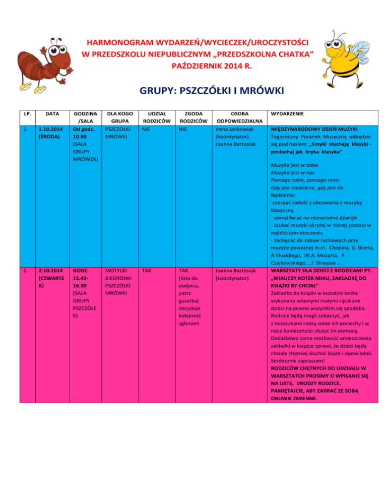 HARMONOGRAM WYDARZEŃ/WYCIECZEK/UROCZYSTOŚCI W PRZEDSZKOLU NIEPUBLICZNYM „PRZEDSZKOLNA CHATKA” PAŹDZIERNIK 2014 R. GRUPY: PSZCZÓŁKI I MRÓWKI LP. 1. 2. DATA 1.10.2014 (ŚRODA) 2.10.2014 (CZWARTE K) GODZINA /SALA Od godz. 10.00 (SALA GRUPY MRÓWEK) GODZ. 15.4516.30 (SALA GRUPY PSZCZÓŁE K) DLA KOGO GRUPA PSZCZÓŁKI MRÓWKI MOTYLKI BIEDRONKI PSZCZÓŁKI MRÓWKI UDZIAŁ RODZICÓW NIE TAK ZGODA RODZICÓW NIE TAK (lista do podpisu, patrz gazetka) decyduje kolejność zgłoszeń OSOBA ODPOWIEDZIALNA Irena Jankowiak (koordynator) Joanna Bartosiak Joanna Bartosiak (koordynator) WYDARZENIE MIĘDZYNARODOWY DZIEŃ MUZYKI Tegoroczny Poranek Muzyczny odbędzie się pod hasłem: „Smyki słuchają klasyki posłuchaj jak bryka klasyka” Muzyka jest w tobie Muzyka jest w nas Pomaga tobie, pomaga mnie Gdy jest niedobrze, gdy jest źle. Będziemy: -czerpać radość z obcowania z muzyką klasyczną - uwrażliwiać na różnorodne dźwięki - szukać muzyki ukrytej w różnej postaci w najbliższym otoczeniu - zachęcać do zabaw ruchowych przy muzyce poważnej m.in. Chopina, G. Bizeta, A Vivaldiego, W.A. Mozarta, P. Czajkowskiego, , J. Straussa … WARSZTATY DLA DZIECI Z RODZICAMI PT. „MIAUCZY KOTEK MIAU, ZAKŁADKĘ DO KSIĄŻKI BY CHCIAŁ” Zakładka do książki w kształcie kotka wykonana własnymi małymi rączkami dzieci na pewno wszystkim się spodoba. Rodzice będą mogli zobaczyć, jak z nożyczkami radzą sobie ich pociechy i w razie konieczności służyć im pomocą. Dodatkowo sama możliwość umieszczenia zakładki w książce sprawi, że dzieci będą chciały chętniej słuchać bajek i opowiadań. Serdecznie zapraszam! RODZICÓW CHĘTNYCH DO UDZIIAŁU W WARSZTATCH PROSIMY O WPISANIE SIĘ NA LISTĘ. DRODZY RODZICE, PAMIĘTAJCIE, ABY ZABRAĆ ZE SOBĄ OBUWIE ZMIENNE. 3. 4. 3.10.2014 (PIĄTEK) GODZ. 12.4513.15 (SALA GRUPY PSZCZÓŁE K) PSZCZÓŁKI NIE TAK (lista do podpisu, patrz gazetka) Monika Litwinow Notatka p. Joanna Bartosiak 3.10.2014 (PIĄTEK) GODZ.13. 30-14.00 (SALA GRUPY MRÓWEK) MRÓWKI NIE TAK (lista do podpisu, patrz gazetka) Monika Litwinow Notatka p. Monika Lewandowska 8.10.2014 (ŚRODA) GODZ. 10.0010.30 (SALA GRUPY PSZCZÓŁE K) PSZCZÓŁKI NIE NIE Joanna Bartosiak (koordynator) 8.10.2014 (ŚRODA) GODZ.10. 30- 11.00 (SALA GRUPY MRÓWEK) GODZ.12. 15-12.45; 13.0013.30 (SALA GRUPY MRÓWKI) GODZ. OD 10.00 (SALA GRUPY PSCZÓŁEK ) MRÓWKI NIE NIE Joanna Bartosiak (koordynator) MRÓWEK NIE NIE Justyna Smolińska (koordynator) METODA DOBREGO STARTU PSZCZÓŁKI NIE NIE Barbara Piotrowska (koordynator) Joanna Bartosiak DZIEŃ ZIEMNIAKA W tym roku w naszym przedszkolu pierwszy raz będziemy obchodzić Dzień Ziemniaka. Udamy się w podróż do Ziemniakolandii. Weźmiemy udział w jesiennym quizie, nie zabraknie również ziemniaczanych zabaw sportowych. Święto dziś ziemniaka mamy Tak więc wszystkich zapraszamy. Na konkursy i zawody Na zagadki i podchody Uśmiech, humor i zabawa To jest najważniejsza sprawa. DRODZY RODZICE, PROSIMY, ABY TEGO DNIA DZIECKO PRZYNIOSŁO DO PRZEDSZKOLA JEDNEGO ZIEMNIAKA ŚREDNIEJ WIELKOŚCI. DZIĘKUJEMY 5. 9.10.2014 (CZWARTE K) 6. 10.10.2014 (PIĄTEK) DOGOTERAPIA- SPOTKANIE Z PIESKIEM Zabawa z psem w przedszkolu jest miłą formą spędzenia czasu. Dzieci uczą się, jak bezpiecznie i odpowiedzialnie postępować z psami, jak je karmić i jak o nie dbać. Będą także miały okazję podziwiać różne "psie sztuczki". TEMAT: Pies wrócił z wakacji. 1. Przywitanie. 2. Przypomnienie zasad bezpiecznego kontaktu z psem. 3. Zabawa z psem - przybijanie piąteczki i tańczenie. 4. Przypomnienie najbardziej ulubionych sztuczek. 5. Gdzie pies mógł być na wakacjach? pocztówka z wakacji. 6. Zabawa z psem - tunele. 7. Pożegnanie. PROSIMY O PODPISANIE ZGODY NA UDZIAŁ W ZAJĘCIACH Z DOGOTERAPII. I SPOTKANIE W RAMACH PROGRAMU PT. „SZACUNEK- JA NA NIEGO ZASŁUGUJĘ I INNYM GO OKAZUJĘ” Podczas pierwszych zajęć dzieci spróbują zdefiniować pojęcie szacunku (to grzeczność połączona z troską o uczucia i dobro drugiej osoby), zwłaszcza do osób starszych. Poprzez zabawy przypomni sobie podstawowa zwroty grzecznościowe a także wzmocni szacunek do samego siebie. 7. 10.10.2014 (PIĄTEK) 10.10.2014 (PIĄTEK) GODZ.13. 00-13.30 (SALA GRUPY PSZCZÓŁE K) GODZ. 13.3014.00 PSZCZÓŁKI NIE NIE Arkadiusz Timm Notatka p. Basia Piotrowska MRÓWKI NIE NIE Arkadiusz Timm Notatka p. Irena Jankowiak 8. 14.10.2014 (WTOREK) GODZ. 15.4516.30 (SALA GRYPY MRÓWEK) MRÓWKI TAK TAK (lista do podpisu, decyduje kolejność zgłoszeń) Irena Jankowiak (koordynator) 9. 15.10.2014 (ŚRODA) GODZ. 11.0011.30 (SALA GRUPY PSZCZÓŁE K) PSZCZÓŁKI NIE NIE Monika Baszyńska (koordynator) 10. 16.10.2014 (CZWARTE K) GODZ. 11.3012.00 (SALA MRÓWKI NIE NIE Monika Baszyńska (koordynator) I SPOTKANIE Z MUZYKĄ ETNICZNĄ PT. "Nutki z dalekiego świata". Podczas najbliższego spotkania dzieci usłyszą m.in. perkusyjny instrument CAISA, wyrabiany metodami ręcznymi przez jedyną osobę na świecie. Długi czas wykonania i nadmiar prac przy jego budowie sprawiły, że dotychczas powstało poniżej 1 tys. egzemplarzy tego niezwykle brzmiącego instrumentu. Ponadto dzieci poznają japońską HOKAME, a jej delikatne dźwięki sprawią, że dzieci skupią uwagę, wyciszą się. Ten japoński instrument jest wykorzystywany w muzykoterapii. Jego muzyka potrafi uspokajać, działa kojąco na psychikę. Wszyscy ożywimy się przy dźwiękach chińskiego FENG ( powietrznego gongu). Instrumentu wykuwanego przez człowieka ręcznie. I tym razem nie zabraknie muzycznej zagadki zaprezentowanej z użyciem niewielkiego instrumentu naśladującego głos pewnego sympatycznego, dobrze znanego i lubianego przez dzieci zwierzątka. W programie również animacje z udziałem dzieci z wykorzystaniem powyższych instrumentów. ZAJĘCIA OTWARTE PT. „W POSZUKIWANIU ZAGINIONYCH GŁOSEK” Zabawy i ćwiczenia rozwijające słuch fonematyczny są nieodłącznym elementem kształtowania gotowości dziec
