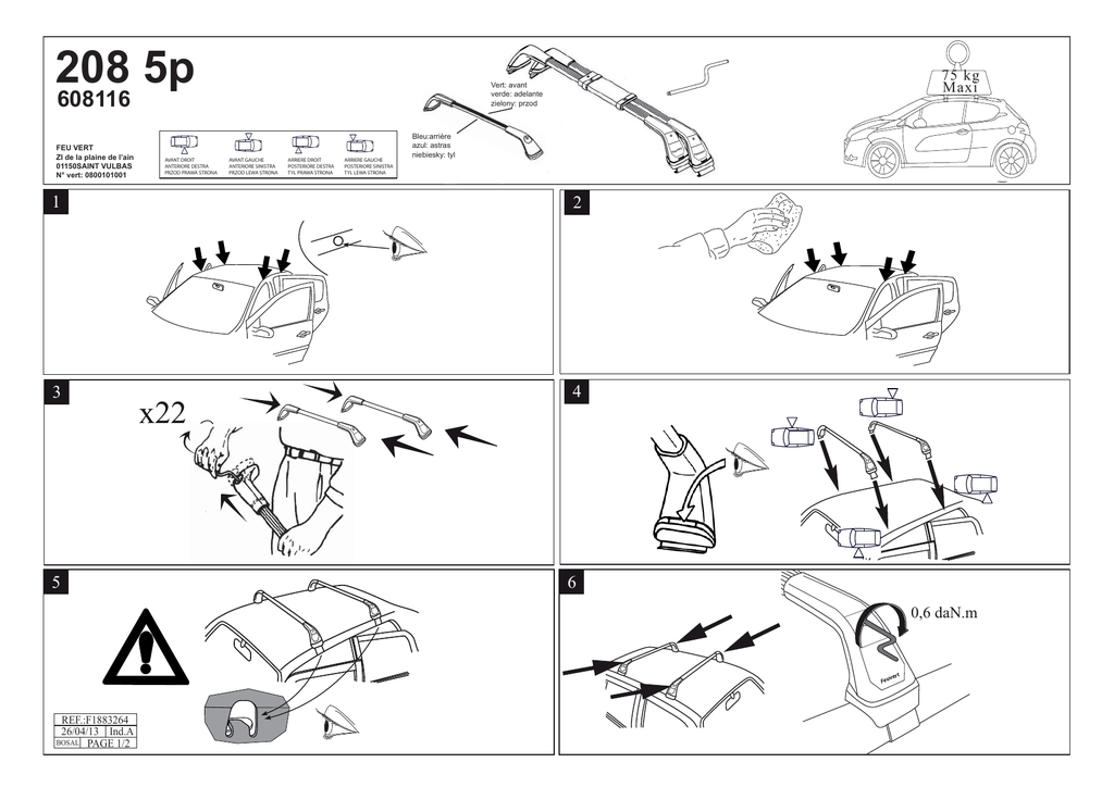 LAGUNA 208 5pIII 608 097 608116 FEU VERT &%56%24 ZI de la plaine de l’ain :)D ELA0LAINED ELgAIN 01150SAINT VULBAS 3!).465,"!3 .²VERT N° vert: 0800101001 !6!.4$2/)4 !.4%2)/2%$%342! 02:/$02!7!342/.! 75 kg Vert: avant verde: adelante zielony: przod !6!.4'!5#(% !.4%2)/2%3).)342! 02:/$,%7!342/.! !22)%2%$2/)4 0/34%2)/2%$%342! 49,02!7!342/.! !22)%2%'!5#(% 0/34%2)/2%3).)342! 49,,%7!342/.! Bleu:arrière azul: astras niebiesky:RE tyl BLEUARRI Maxi. VERTAVANT VERD EAD ELANTE ZIELONYPRZOD VERT &EU 40Maxi Kg VERT &EU AZULATRAS NIEBIESKITYL 1 2 3 4 x22 5 6 0,6 daN.m T VER &EU REF.:F1883264 Réf.:F1883082 26/04/13 ind.AInd.A 20/10/09 BOSAL BOSAL PAGE PAGE 1/2 1/2 Français Sécurité - Prière de bien lire l’instruction de montage avant de commencer. - Veuillez vérifier que tous les articles sont inclus dans la boite. - Suivez l’ordre de numérotation 1,2,3 etc… - Ces barres de toit ne conviennent qu’au véhicule spécifié au recto de cette notice. - Fixer de façon sûre et correcte la charge. - Il est recommandé d’utiliser les accessoires adaptés au transport de la charge considérée (porte-vélo, porte-ski, etc…) - Faire attention à ne pas abîmer les barres de toit (chocs, etc…) et de veiller à un bon entretien des barres. - Nettoyer et sécher les surfaces en contact avec le véhicule avant montage. - Ces barres ont été conçues pour être placées à un endroit précis du véhicule. - La fixation sur le véhicule n’est plus garantie si le positionnement est différent de celui indiqué sur cette notice. - Les dispositifs de fixation doivent être serrés correctement et vérifiés régulièrement au cours des trajets. - L’arrimage des bagages avec des liens élastiques (sandow, tendeurs, etc...) est interdit; sangles conseillées. - Les pattes métalliques de fixation ont reçu un traitement spécial anti-agression de la peinture de votre véhicule ; ce traitement a fait l’objet de recherches approfondies. - N’intercaler aucune garniture supplémentaire (caoutchouc, plastique ou autre) entre la patte de fixation et la carrosserie, la bonne tenue des barres ne serait plus assurée. - Respecter la charge maximum admissible par le véhicule préconisée au recto. - La hauteur de la charge ne doit pas dépasser celle préconisée par le constructeur dans le manuel d’utilisation. - Planches à voile et charges longues: réduire la vitesse, 90 km/heure conseillé. - Pour économie d’énergie, les barres seront enlevées si elles ne sont pas utilisées. - Toute charge transportée sur le pavillon d’un véhicule affecte de manière sensible son comportement en particulier la sensibilité au vent latéral et le comportement en virage et au freinage. Il est conseillé de conduire avec plus de prudence (réduire la vitesse, tenir compte de l’augmentation des distances de freinage) - Important : Suivre correctement les instructions de montage et d’utilisation. Le non respect de cette notice d’utilisation dégage la responsabilité du constructeur. OK NO ESPAÑOL SEGURIDAD - Leer atentamente las instrucciones de montaje antes de comenzar. - Verificar que todos los artículos se encuentran en la caja. - Seguir el orden de numeración 1, 2, 3, etc. - Estas barras de techo sólo sirven para el vehículo especificado en el anverso de estas instrucciones. - Fijar la carga adecuadamente y de forma segura. - Se recomienda utilizar accesorios adaptados al transporte de la carga en cuestión (portabicicletas, portaesquís, etc.) - Prestar atención para no deteriorar las barras de techo (golpes, etc.) y realizar correctamente su mantenimiento. - Antes del montaje, limpiar y secar las superficies en contacto con el vehículo. - Estas barras han sido diseñadas para ser montadas en un lugar preciso del vehículo. - La fijación en el vehículo no está garantizada si la posición es diferente de la indicada en estas instrucciones. - Es imprescindible apretar correctamente los dispositivos de fijación y comprobarlos periódicamente durante el trayecto. - Se prohíbe sujetar el equipaje con elásticos (pulpos, tensores, etc.); se aconseja utilizar correas. - Las patillas metálicas de fijación han recibido un tratamiento especial antiagresión de la pintura de su vehículo; este tratamiento ha sido objeto de minuciosas investigaciones. - No intercalar ninguna guarnición suplementaria (caucho, plástico u otros) entre la patilla de fijación y la carrocería ya que, de lo contrario, no se garantizaría la correcta sujeción de las barras. - Respecte la carga máxima admitida por el vehículo que se indica en el anverso. - La altura de la carga no debe sobrepasar la recomendada por el fabricante en el manual de utilización. - Tablas de vela y cargas largas: reducir la velocidad; se recomienda circular a 90 km/h. - Para ahorrar energía, desmontar las barras si no se utilizan. - Todas las cargas que se transporten en el techo de un vehículo afectan de manera importante en su comportamiento, en especial en la sensibilidad al viento lateral y en el comportamiento en los giros y en la frenada. Se aconseja conducir con mayor prudencia (reducir la velocidad y tener en cuenta el aumento de la distancia para frenar) - Importante: Seguir correctamente las instrucciones de montaje y utilización. El incumplimiento de estas instrucciones de utilización exime de responsabilidad al Fabricante. POLSKI BEZPIECZEŃSTWO - Przed przystąpieniem do pracy należy dokładnie przeczytać instrukcję montażu. - Prosimy o sprawdzenie, czy wszystkie elementy znajdują się w opakowaniu. - Należy sprawdzić je zgodnie z kolejnymi numerami 1, 2, 3 itd. - Listwy dachowe przeznaczone są jedynie do samochodów wymienionych na odwrocie niniejszej instrukcji. - Należy zawsze zamocować ładunek w sposób prawidłowy i pewny. - Zalecane jest korzystanie z akcesoriów odpowiednich dla przewożonego ładunku (bagażnik na rowery, bagażnik na narty itd.). - Należy uważać, aby nie uszkodzić listew d