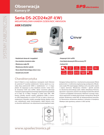 Obserwacja SYSTEMY ZABEZPIECZEŃ Kamery IP Seria DS-2CD24x2F-I(W) MEGAPISKELOWA KAMERA DZIEŃ/NOC HIKVISION Network IP · Rozdzielczość obrazu do 3 megapikseli · Kompresja H.264 i mJPEG · Dwa niezależne strumienie wideo · Zrzut klatek obrazowych JPEG na serwery FTP · Wbudowana czujka PIR · Zasilanie PoE · Wbudowany mikrofon i głośnik · Mocna dioda IR doświetlająca obraz w nocy · Gniazdo karty microSD Charakterystyka Seria Hi Watch to nowe budżetowe rozwiązanie marki Hikvision do systemów IP wysokiej rozdzielczości. Kamery oparte są o wysokiej klasy przetworniki CMOS o rozdzielczości 1,3 i 3 megapiksele. Do dyspozycji są dwa niezależne strumie i dwie metody kompresji H.264 oraz mJPEG. Jakość strumienia głównego można precyzyjnie regulować zmieniając zajętość pasma w przedziale od 32 kbps do 16 Mbps. Dostępne są także tryby CBR i VBR. Kamery potrafią również wysyłać pojedyncze klatki w formacie JPEG bezpośrednio na serwer FTP lub na maila w formie powiadomienia. Wszystkie modele posiadają funkcję detekcji ruchu oraz rozbudowane opcje harmonogramu, dzięki któremu można dowolnie zdefiniować czas aktywowania poszczególnych opcji. www.spselectronics.pl Dostępna funkcja dzień/noc z mechanicznie przesuwanym filtrem podczerwieni, z możliwością regulacji progu przełączenia. Wbudowana czujka PIR wspomagająca detekcję ruchu oraz jedno wyjście i wejście alarmowe. Wbudowany mikrofon i głośnik pozwala na obustronną komunikację audio. Zdalna aktualizacja firmwaru, zgrywanie i wgrywanie ustawień oraz dostęp do dziennika zdarzeń z poziomu przeglądarki internetowej. Możliwość ręcznego rozpoczęcia nagrywania na lokalny dysk twardy w komputerze. Wersja W posiada wbudowany moduł WiFi do bezprzewodowej komunikacji. Nowoczesna, miniaturowa obudowa z uchwytem w komplecie. Obiektyw stało ogniskowy, zasilanie 12 VDC lub PoE. Dane techniczne MODEL DS-2CD2412F-I(W) DS-2CD2432F-I(W) Przetwornik Liczba pikseli Minimalne oświetlenie (czułość) 1/3” Progressive scan CMOS 1280 x 960 (1,3 MP) 2048 x 1536 (3MP) 0,01 / 0,0 lux (F1.2; 50 IRE) 0,07 / 0,0 lux (F1.2; 50 IRE) Stosunek sygnał/szum 50 dB Wbudowany obiektyw 4 mm, F2.0 (dostępny także w wersjach 2,8; 6; 12 mm) Odbicie lustrzane Tak, we wszystkich osiach Bilans bieli Automatyczny Funkcja AGC Automatyczna Funkcja BLC Tak, wybór strefy Elektroniczna migawka 1/25s do 1/100 000s Szeroka dynamika WDR Tak, cyfrowa Ustawienia obrazu Regulacja parametrów: jasność, kontrast, nasycenie Wyostrzenie obrazu Tak, regulowane Redukcja szumów Tak, 3D DNR Funkcja Dzień/Noc Filtr przesuwany mechanicznie Ilość diod IR 1 dioda typu EXIR Długość fali IR 850 nm Zasięg diod Do 10 m Nazwa kamery Tak, 32 znaki Detekcja ruchu 18 x 22 pola detekcji PARAMETRY SIECIOWE Kompresja obrazu H.264 / mJPEG Wielkość strumienia Rozdzielczość 32 kbps ~ 16 Mbps 1280 x 960 Jakość obrazu Ilość klatek 2048 x 1536 6 poziomów, regulacja wielkości strumienia Główny: 25 fps (1280x960 i niższych) Pomocniczy: 25 fps (704x576 i niższych) Ilość jednoczesnych strumieni wideo Główny: 12,5 fps (2048x1536); 25 fps (1920x1080 i niższych) Pomocniczy: 25 fps (704x576 i niższych) 2 Obsługa serwerów FTP Tak, wygrywanie klatek obrazu JPEG w trybie cykliczym (max co 1s) lub z detekcji ruchu Obsługiwane protokoły TCP/IP, HTTP, DHCP, DNS, DDNS, RTP/RTSP, PPPoE, SMTP, NTP, SNMP, HTTPS, FTP, 802.1x, (SPI, SRTP, IPv6 opcjonalnie) Maksymalna ilość użytkowników 6 WEJŚCIA / WYJŚCIA Wejście sieciowe Moduł WiFi - tylko wersje W 10BASE-T/100BASE-TX (RJ45) Standard IEEE802.11 b/g/n, szyfrowanie 64/128-bit WEP, WPA/WPA2, WPS - tylko w modelach z literą (W) Wejście karty SD Tak, microSD do 64 GB Wejścia/wyjścia alarmowe 1 / 1 plus wbudowana czujka PIR Czujka PIR Zasięg 10 m, kąt 80° Komunikacja audio Wbudowany mikrofon i głośnik POZOSTAŁE Temperatura pracy Od -10°C do +60°C, wilgotność <90% Zasilanie 12 VDC, 48 VDC PoE Max 5 W Wymiary (szer. x dł. x wys.) Waga Centrala - ul. Krakowiaków 80/98, 02-255 Warszawa; tel. 22 518 31 50, fax 22 518 31 70, e-mail: [email protected] BH Gdańsk - ul. Drożyny 6, 80-302 Gdańsk; tel. 58 624 83 04, fax 58 668 59 20, e-mail: [email protected] BH Katowice - al. Roździeńskiego 188a, 40-203 Katowice; tel. 32 255 64 27, fax 32 255 64 52, e-mail: [email protected] BH Poznań - ul. Polska 60, 60-595 Poznań; tel. 61 852 19 02, fax 61 825 09 03, e-mail: [email protected] BH Wrocław - pl. Gen. Wróblewskiego 3a, 50-413 Wrocław; tel. 71 348 44 64, fax 71 348 36 35, e-mail: [email protected] Max 5,5 W 66 x 71 x 139 mm 400 g Dystrybutor Pobór mocy