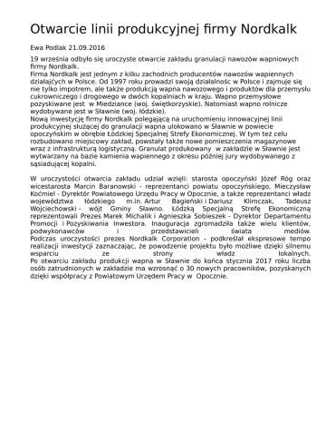 Otwarcie linii produkcyjnej firmy Nordkalk Ewa Podlak 21.09.2016 19 września odbyło się uroczyste otwarcie zakładu granulacji nawozów wapniowych firmy Nordkalk. Firma Nordkalk jest jednym z kilku zachodnich producentów nawozów wapiennych działajćych w Polsce. Od 1997 roku prowadzi swoją działalnośc w Polsce i zajmuje się nie tylko impotrem, ale także produkcją wapna nawozowego i produktów dla przemysłu cukrowniczego i drogowego w dwóch kopalniach w kraju. Wapno przemysłowe pozyskiwane jest w Miedziance (woj. świętkorzyskie). Natomiast wapno rolnicze wydobywane jest w Sławnie (woj. łódzkie). Nową inwestycję firmy Nordkalk polegającą na uruchomieniu innowacyjnej linii produkcyjnej służącej do granulacji wapna ulokowano w Sławnie w powiecie opoczyńskim w obrębie Łódzkiej Specjalnej Strefy Ekonomicznej. W tym też celu rozbudowano miejscowy zakład, powstały także nowe pomieszczenia magazynowe wraz z infrastrukturą logistyczną. Granulat produkowany w zakładzie w Sławnie jest wytwarzany na bazie kamienia wapiennego z okresu później jury wydobywanego z sąsiadującej kopalni. W uroczystości otwarcia zakładu udział wzięli: starosta opoczyński Józef Róg oraz wicestarosta Marcin Baranowski - reprezentanci powiatu opoczyńskiego, Mieczysław Koćmiel - Dyrektór Powiatowego Urzędu Pracy w Opocznie, a także reprezentanci władz województwa łódzkiego m.in. Artur Bagieński i Dariusz Klimczak, Tadeusz Wojciechowski - wójt Gminy Sławno. Łódzką Specjalną Strefę Ekonomiczną reprezentowali Prezes Marek Michalik i Agnieszka Sobieszek - Dyrektor Departamentu Promocji i Pozyskiwania Inwestora. Inauguracja zgromadziła także wielu klientów, podwykonawców i przedstawicieli świata mediów. Podczas uroczystości prezes Nordkalk Corporation - podkreślał ekspresowe tempo realizacji inwestycji zaznaczając, że powodzenie projektu było możliwe dzięki silnemu wsparciu ze strony władz lokalnych. Po otwarciu zakładu produkcji wapna w Sławnie do końca stycznia 2017 roku liczba osób zatrudnionych w zakładzie ma wzrosnąć o 30 nowych pracowników, pozyskanych dzięki współpracy z Powiatowym Urzędem Pracy w Opocznie.