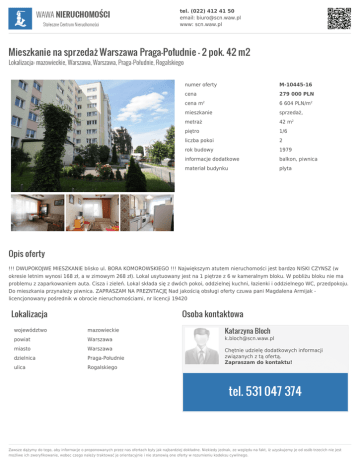 tel. (022) 412 41 50 email: [email protected] www: scn.waw.pl Mieszkanie na sprzedaż Warszawa Praga-Południe - 2 pok. 42 m2 Lokalizacja: mazowieckie, Warszawa, Warszawa, Praga-Południe, Rogalskiego numer oferty M-10445-16 cena 279 000 PLN cena m 6 604 PLN/m2 mieszkanie sprzedaż, metraż 42 m2 piętro 1/6 liczba pokoi 2 rok budowy 1979 informacje dodatkowe balkon, piwnica materiał budynku płyta 2 Opis oferty !!! DWUPOKOJWE MIESZKANIE blisko ul. BORA KOMOROWSKIEGO !!! Największym atutem nieruchomości jest bardzo NISKI CZYNSZ (w okresie letnim wynosi 168 zł, a w zimowym 268 zł). Lokal usytuowany jest na 1 piętrze z 6 w kameralnym bloku. W pobliżu bloku nie ma problemu z zaparkowaniem auta. Cisza i zieleń. Lokal składa się z dwóch pokoi, oddzielnej kuchni, łazienki i oddzielnego WC, przedpokoju. Do mieszkania przynależy piwnica. ZAPRASZAM NA PREZNTACJĘ Nad jakością obsługi oferty czuwa pani Magdalena Armijak licencjonowany pośrednik w obrocie nieruchomościami, nr licencji 19420 Lokalizacja Osoba kontaktowa Katarzyna Bloch województwo mazowieckie powiat Warszawa [email protected] miasto Warszawa dzielnica Praga-Południe ulica Rogalskiego Chętnie udzielę dodatkowych informacji związanych z tą ofertą. Zapraszam do kontaktu! tel. 531 047 374 Zawsze dążymy do tego, aby informacje o proponowanych przez nas ofertach były jak najbardziej dokładne. Niekiedy jednak, ze względu na fakt, iż uzyskujemy je od osób trzecich nie jest możliwe ich zweryfikowanie, wobec czego należy traktować je orientacyjnie i nie stanowią one oferty w rozumieniu kodeksu cywilnego.