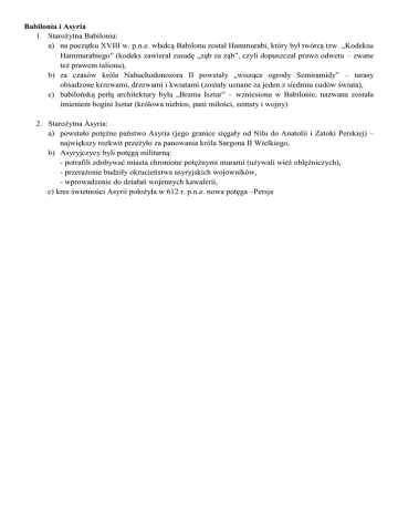 Babilonia i Asyria 1. Starożytna Babilonia: a) na początku XVIII w. p.n.e. władcą Babilonu został Hammurabi, który był twórcą tzw. „Kodeksu Hammurabiego” (kodeks zawierał zasadę „ząb za ząb”, czyli dopuszczał prawo odwetu – zwane też prawem talionu), b) za czasów króla Nabuchodonozora II powstały „wiszące ogrody Semiramidy” – tarasy obsadzone krzewami, drzewami i kwiatami (zostały uznane za jeden z siedmiu cudów świata), c) babilońską perłą architektury była „Brama Isztar” – wzniesiona w Babilonie, nazwana została imieniem bogini Isztar (królowa niebios, pani miłości, zemsty i wojny) 2. Starożytna Asyria: a) powstało potężne państwo Asyria (jego granice sięgały od Nilu do Anatolii i Zatoki Perskiej) – największy rozkwit przeżyło za panowania króla Sargona II Wielkiego, b) Asyryjczycy byli potęgą militarną: - potrafili zdobywać miasta chronione potężnymi murami (używali wież oblężniczych), - przerażenie budziły okrucieństwa asyryjskich wojowników, - wprowadzenie do działań wojennych kawalerii, c) kres świetności Asyrii położyła w 612 r. p.n.e. nowa potęga –Persja