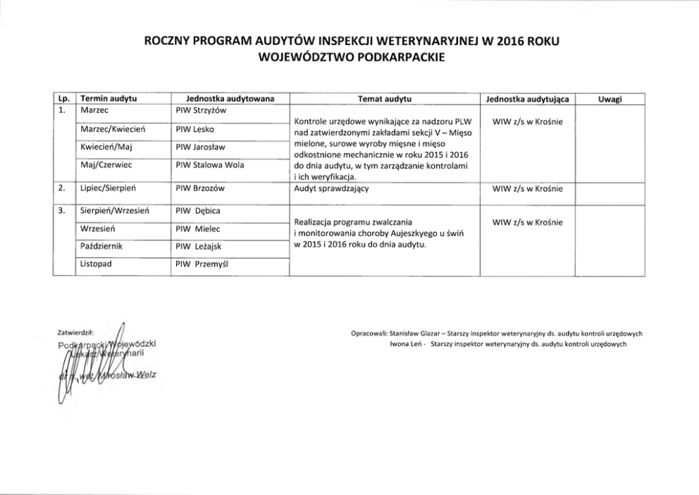 ROCZNY PROGRAM AUDYTÓW INSPEKCJI WETERYNARYJNEJ W 2016 ROKU WOJEWÓDZTWO PODKARPACKIE Lp. Term in audytu 1. Marzec PIW Strzyżów Marzec/Kwiecień PIW Lesko Kwiecień/Maj PIW Jarosław Maj/Czerwiec PIW Stalowa Wola 2. Lipiec/Sierpień PIW Brzozów 3. Sierpień/Wrzesień PIW Dębica Wrzesień PIW Mielec Październik PIW Leżajsk Listopad PIW Przemyśl jewódzki Jednostka audytow ana Tem at audytu Jednostka audytująca Kontrole urzędowe wynikające za nadzoru PLW nad zatwierdzonymi zakładami sekcji V - Mięso mielone, surowe wyroby mięsne i mięso odkostnione mechanicznie w roku 2015 i 2016 do dnia audytu, w tym zarządzanie kontrolami i ich weryfikacja. Audyt sprawdzający WIW z/s w Krośnie Realizacja programu zwalczania i monitorowania choroby Aujeszkyego u świń w 2015 i 2016 roku do dnia audytu. WIW z/s w Krośnie Uwagi WIW z/s w Krośnie Opracowali: Stanisław Glazar - Starszy inspektor weterynaryjny ds. audytu kontroli urzędowych Iwona Leń - Starszy inspektor weterynaryjny ds. audytu kontroli urzędowych