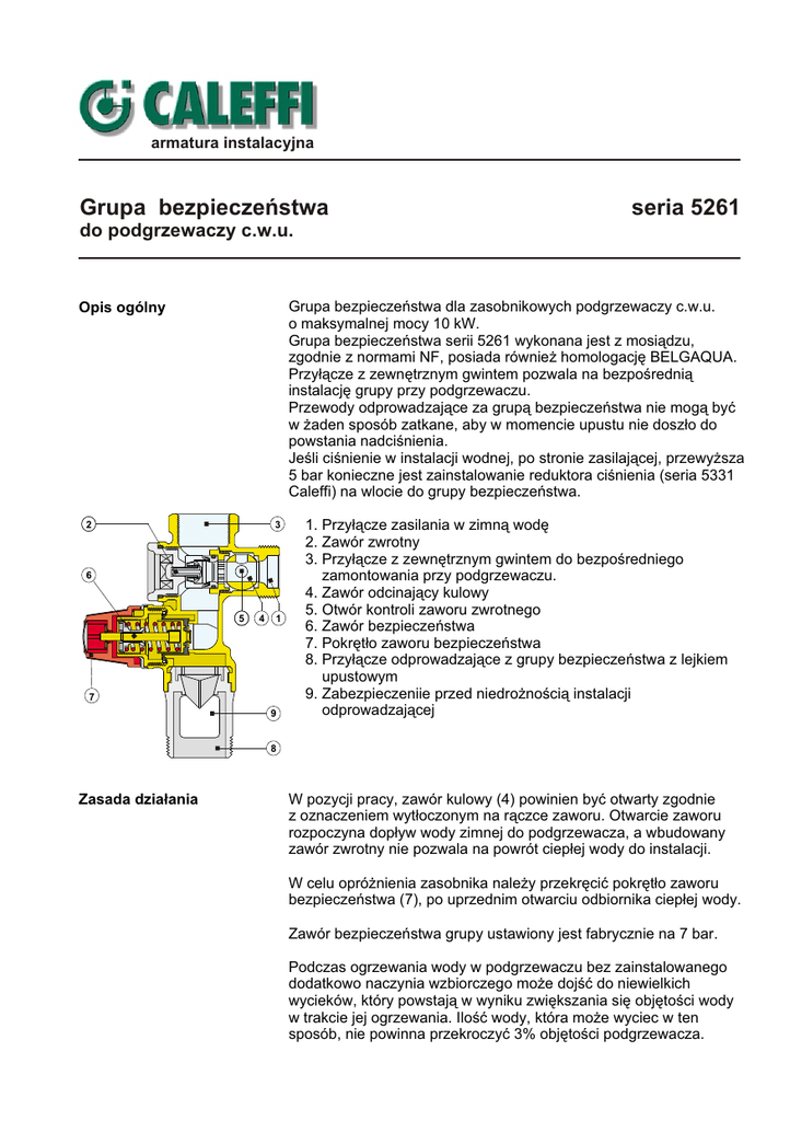 armatura instalacyjna Grupa bezpieczeñstwa seria 5261 do podgrzewaczy c.w.u. Grupa bezpieczeñstwa dla zasobnikowych podgrzewaczy c.w.u. o maksymalnej mocy 10 kW. Grupa bezpieczeñstwa serii 5261 wykonana jest z mosi¹dzu, zgodnie z normami NF, posiada równie¿ homologacjê BELGAQUA. Przy³¹cze z zewnêtrznym gwintem pozwala na bezpoœredni¹ instalacjê grupy przy podgrzewaczu. Przewody odprowadzaj¹ce za grup¹ bezpieczeñstwa nie mog¹ byæ w ¿aden sposób zatkane, aby w momencie upustu nie dosz³o do powstania nadciœnienia. Jeœli ciœnienie w instalacji wodnej, po stronie zasilaj¹cej, przewy¿sza 5 bar konieczne jest zainstalowanie reduktora ciœnienia (seria 5331 Caleffi) na wlocie do grupy bezpieczeñstwa. Opis ogólny 2 3 6 5 4 1 7 9 1. Przy³¹cze zasilania w zimn¹ wodê 2. Zawór zwrotny 3. Przy³¹cze z zewnêtrznym gwintem do bezpoœredniego zamontowania przy podgrzewaczu. 4. Zawór odcinaj¹cy kulowy 5. Otwór kontroli zaworu zwrotnego 6. Zawór bezpieczeñstwa 7. Pokrêt³o zaworu bezpieczeñstwa 8. Przy³¹cze odprowadzaj¹ce z grupy bezpieczeñstwa z lejkiem upustowym 9. Zabezpieczeniie przed niedro¿noœci¹ instalacji odprowadzaj¹cej 8 Zasada dzia³ania W pozycji pracy, zawór kulowy (4) powinien byæ otwarty zgodnie z oznaczeniem wyt³oczonym na r¹czce zaworu. Otwarcie zaworu rozpoczyna dop³yw wody zimnej do podgrzewacza, a wbudowany zawór zwrotny nie pozwala na powrót ciep³ej wody do instalacji. W celu opró¿nienia zasobnika nale¿y przekrêciæ pokrêt³o zaworu bezpieczeñstwa (7), po uprzednim otwarciu odbiornika ciep³ej wody. Zawór bezpieczeñstwa grupy ustawiony jest fabrycznie na 7 bar. Podczas ogrzewania wody w podgrzewaczu bez zainstalowanego dodatkowo naczynia wzbiorczego mo¿e dojœæ do niewielkich wycieków, który powstaj¹ w wyniku zwiêkszania siê objêtoœci wody w trakcie jej ogrzewania. Iloœæ wody, która mo¿e wyciec w ten sposób, nie powinna przekroczyæ 3% objêtoœci podgrzewacza. Uwagi i zalecenia 1. Przed monta¿em grupy zaleca siê oczyszczenie przewodów (w przypadku wymiany grupy nale¿y oczyœciæ równie¿ sam podgrzewacz). 2. Przy przeprowadzaniu kontroli poprawnego dzia³ania zaworu zwrotnego konieczne jest, po otwarciu zaworu odcinaj¹cego, odkrêcenie zaœlepki (5) po³o¿onej po przeciwnej stronie zaworu. 3. W celu poprawnego funkcjonowania grupy zaleca siê przynajmniej raz na miesi¹c uaktywniæ za pomoc¹ pokrêt³a (7) zawór bezpieczeñstwa. 4. Unikniêcie strat z powodu wzrostu objêtoœci wody po jej podgrzaniu oraz ewentualnego odk³adania siê kamienia w grupie bezpieczeñstwa jest mo¿liwe dziêki zainstalowaniu odpowiednio dobranego naczynia wzbiorczego. Dane techniczne 120°C Maksymalna temperatura pracy: 10 bar Maksymalne ciœnienie pracy: 10 kW Maksymalna moc podgrzewacza (dla grupy 3/4”): 7 bar Ciœnienie otwarcia zaworu bezpieczñstwa: Natê¿enie przep³ywu przy 8,4 bar dla wody >600 l/h (120% ciœnienia otwarcia): dla pary >220 kg/h gwint zewnêtrzny 3/4” Przy³¹cze do podgrzewacza i instalacji: gwint zewnêtrzny 1” Przy³¹cze przewodu upustowego: