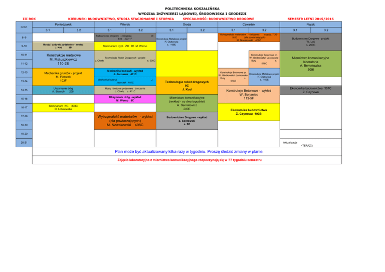 POLITECHNIKA KOSZALIŃSKA WYDZIAŁ INŻYNIERII LĄDOWEJ, ŚRODOWISKA I GEODEZJI III ROK KIERUNEK: BUDOWNICTWO, STUDIA STACJONARNE I STOPNIA Poniedziałek SPECJALNOŚĆ: BUDOWNICTWO DROGOWE Środa Wtorek SEMESTR LETNI 2015/2016 Czwartek Piątek GODZ. 3.1 3.2 8−9 9-10 10-11 11-12 12-13 13-14 14-15 Mosty i budowle podziemne - wykład J. Kud 3B Konstrukcje metalowe M. Matuszkiewicz 110-2E Mechanika gruntów - projekt M. Pietrzak 103F Utrzymanie dróg A. Staruch 208I 17-18 18-19 3.2 3.1 3.2 W. Konstrukcje Metalowe projekt R. Orzłowska s. 109E Seminarium dypl. ZiK 2C M. Werno s. 305C Mechanika budowli - wykład J. Jacoszek 401C Mechanika budowli Jacoszek 401C J. Mosty i budowle podziemne - ćwiczenia Ł. Chudy s. 401C Seminarium KG 303C D. Leśniewska Wytrzymałość materiałów - wykład (dla powtarzających) M. Nowakowski 408C 3.1 3.2 Wytrzymałość materiałów - ćwiczenia w godz. 7.309.00 (dla powtarzających) M. Nowakowski 408C Konstrukcje Betonowe pr. W. Głodkowska\ LaskowskaBury s. 518C Technologia Robót Drogowych - projekt Ł. Chudy Utrzymanie dróg - wykład M. Werno 9C 15-16 16-17 3.1 Budownictwo drogowe - ćwiczenia Łoś 203-1F Technologia robót drogowych 9C J. Kud Miernictwo komunikacyjne (wykład - co dwa tygodnie) A. Bernatowicz 209E 3.1 3.2 Budownictwo Drogowe - projekt W. Łoś s..209C Miernictwo komunikacyjne laboratoria A. Bernatowicz 309I Konstrukcje Betonowe pr. Konstrukcje Metalowe projekt W. Głodkowska\ LaskowskaR. Orzłowska Bury s. s. 109E 518C Konstrukcje Betonowe - wykład W. Borjaniec 113-5F Ekonomika budownictwa 301C Z. Ceynowa Ekonomika budownictwa Z. Ceynowa 103B Budownictwo Drogowe - wykład p. Sontowski s. 9C 19-20 20-21 Aktualizacja =TERAZ() Plan może być aktualizowany kilka razy w tygodniu. Proszę śledzić zmiany w planie. Zajęcia laboratoryjne z miernictwa komunikacyjnego rozpoczynają się w ?? tygodniu semestru