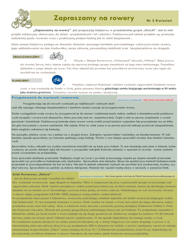 Zapraszamy na rowery Nr 3 Kwiecień „Zapraszamy na rowery” jest propozycją inicjatywy w przedszkolnej grupie „Motylki”. Jest to mini projekt edukacyjny skierowany do dzieci przedszkolnych i ich rodziców. Podstawowymi celami projektu są: promocja codziennej jazdy rowerem wraz z praktyczną podpowiedzią jak to robić bezpiecznie . Istota naszej inicjatywy polega na ukazaniu dzieciom szerszego kontekstu powszechnego wykorzystywania roweru, jego oddziaływania na stan środowiska, nasze zdrowie, powszechną mobilność oraz bezpieczeństwo na drogach. ZREALIZOWALIŚMY: Wizytę w Sklepie Rowerowym „Welocyped” (dawniej „Wiking”) Sklep prowadzi również Serwis, który chętnie zajmie się naprawą każdego sprzętu niezależnie od jego stanu technicznego. Poznaliśmy dokładnie z czego składa się rower. Pan Artur objaśnił jak powinien być prawidłowo serwisowany rower aby nigdy nie zawiódł nas na wycieczkach. PLANUJEMY: Wspólne z chętnymi Rodzicami i dziećmi wycieczki węgrowskimi ścieżkami rowerowymi, w tym wycieczkę do Zamku w Liwie, gdzie poznamy historię gotyckiego zamku książęcego wzniesionego w XV wieku jako strażnica graniczna . Zwiedzimy również muzeum na zamku i zbrojownię. Przygotowanie do wycieczki rowerowej. opracowano na podstawie: http://www.narowerze.pttk.pl/ Przygotowując się do nowych wycieczek po najbliższych i dalszych okolicach dla naszego własnego bezpieczeństwa i komfortu musimy zacząć od przygotowania roweru. Zanim wyciągniecie swoje rowery by przygotować je do sezonu i codziennej jazdy należy zadbać o skompletowanie podstawowych narzędzi i rowerowych akcesoriów, które pozwolą nam na majsterkowanie. Część z nich na pewno znajdziecie w swoich garażach i komórkach. Podstawową kontrolę stanu roweru warto zrobić przed każdym wyjazdem lub przynajmniej raz na kilka dni gdy korzystacie z roweru codziennie. Nie zajmie Wam to wiele czasu a na pewno pozwoli uniknąć przykrych niespodzianek, które mogłyby zakończyć się kontuzją. Na początku unieśmy rower raz z jednej raz z drugiej strony. Zakręćmy ręcznie kołem i naciśnijmy na klamkę hamulca. W taki banalny sposób sprawdzimy czy hamulce spełniają swoją funkcję. Warto w tym miejscu sprawdzić również stan klocków hamulcowych. Sprawdźmy śruby, nakrętki czy szybko-zamykacze (motylki) nie są luźne przy kołach. To one dociskają osie piast w hakach. Luźne wystarczy po prostu dokręcić ręką lub kluczem w przypadku nakrętek Kontrola ciśnienia w oponach to również ważne zadanie przed wyruszeniem na przejażdżkę. Czas sprawdzić działanie przerzutek. Najlepiej wsiąść na rower i po kolei przerzucając stopień po stopniu manetki przerzutek sprawdzić czy prawidłowo funkcjonuje cały mechanizm. Sprawdźcie stan łańcucha. Skoro nie spadał przy kontroli funkcjonowania przerzutek to prawdopodobnie nie był za luźny. Nie jest to jednak zależność. Łańcuch nie powinien być zardzewiały, brudny, czy zbyt sztywny. Sprawdźcie czy pedały są dobrze dokręcone. Możecie też wpuścić trochę smaru w aerozolu w pancerze linek. Szlak Rowerowy „Natura” opracowano na podstawie: http://www.gpsies.com/map.do?fileId=fzemrpuqnmuiyzua&language=pl - jest on skierowany przede wszystkim do miłośników wycieczek rowerowych, jego długość to niespełna 10km, a rozpoczyna się przy wypożyczalni sprzętu turystycznego nad węgrowskim zalewem. Szlak wiedzie początkowo wałem przeciwpowodziowym, na który możemy dostać się zjeżdżając stromym zjazdem tuż za mostem na ul. Żeromskiego z prawej strony (jadąc od strony zalewu). Wjeżdżający na wał rowerzysta wkracza w obszar objęty programem NATURA 2000, będącym ostoją ptaków wodno-błotnych. Po przejechaniu nieco ponad 2 kilometrów, rowerzysta podróżujący szlakiem dojeżdża do ścieżki rowerowej biegnącej wzdłuż Alei Solidarności. W tym momencie skręcamy w prawo. Szlak wiedzie na zamek w Liwie, lecz zanim do niego dotrzemy, należy przejechać przez most nad rzeką. Most, a właściwie mosty dawniej wyznaczały granicę pomiędzy Królestwem Polskim a Wielkim Księstwem Litewskim. Obecnie jest granicą geograficzną oddzielającą Mazowsze od Podlasia. Po przejechaniu niespełna 4 kilometrów szlaku, po lewej stronie w Liwie znajduje się się droga gruntowa (ul. Zamkowa) wiodąca ku zamkowi. Po 50 metrach tej trasy czeka nas stromy zjazd i kilkaset metrów pedałowania. W ten sposób dojeżdżamy do samego zamku w Liwie. Po zwiedzeniu muzeum-zbrojowni na zamku, ponownie kierujemy się w stronę Węgrowa, tym razem skręcając w prawo w ul. Nowomiejską, która jest główną ulicą Liwa; po przejechaniu 600 m skręcamy na rondzie w prawo i podążamy wprost do zakrętu oznaczonego drogowskazem „Zalew” szosą wiodącą do Kryp. Po 1,5 kilometrach przejeżdżamy przez Krypy dojeżdżając do skrzyżowania, na którym skręcamy w prawo i kierujemy się nad zalew, gdzie kończymy naszą przejażdżkę.