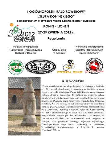 I OGÓLNOPOLSKI RAJD ROWEROWY „SŁUPA KONIŃSKIEGO” pod patronatem Prezydenta Miasta Konina Józefa Nowickiego KONIN - LICHEŃ 27-29 KWIETNIA 2012 r. Regulamin Polskie Towarzystwo Turystyczno - Krajoznawcze Oddział w Koninie Cr@zy Bike w Koninie Konińskie Towarzystwo Sportów Rekreacyjnych Sport Club Konin SlUP KONInSKI Wczesnośredniowieczny słup drogowy z inskrypcją łacińską z 1151 r. został ufundowany i ustawiony w Koninie zapewne przez wojewodę książęcego Piotra Włostowica na oznaczenie połowy drogi z Kruszwicy do Kalisza na ważnym szlaku handlowym i państwowym oraz jako oznaka drogowego miru książęcego. Pierwszy zapis historyczny (Kronika Jana Długosza z połowy XV w.) notuje, że był umiejscowiony na cmentarzu kościoła pw. św. Krzyża w pobliżu konińskiego zamku (obecnie plac Zamkowy, dawniej zwanym Rynkiem Garncarskim). W 1828 r. przeniesiono go na koszt miasta na teren cmentarza przy kościele farnym pw. Św. Bartłomieja - w miejsce, na którym stoi do dziś. Jest to najstarszy znak drogowy w Europie, poza granicami dawnego imperium rzymskiego. Prawdopodobnie słup został wykonany z piaskowca brzezińskiego wydobywanego w Brzeźnie k. Konina. Wysokość: 252 cm. Treść Inskrypcji Konińskiej + ANNO AB INCARNAT(ione) D(omi)NI N(ost)RI M.C.L. PRIMO + IN CALIS HIC MEDIV(m) D(e) CRVSPVICI FORE PVNCT(um) INDICAT ISTA VIE FORMULA IVSTITIE + QVA(m) FIERI PETR(us) IVSSIT COMES HIC PALATIN(us) HOCQ(ue) SOLLERT(er) DIMIDIAVIT IT(er) + EIVS VT ESSE MEMOR DIGNETVR Q(u)ISQ(ue) VIATOR CV(m) PRECE P(ro)PICIV(m) SOLLICITANDO DEV(m) Transkrypcja oraz tłumaczenie (wg Marian Plezia z uwzględnieniem propozycji Z. Kozłowskiej - Budkowej): + Roku od Wcielenia Pana naszego 1151 + Pokazuje ta wskazówka prawości drogi, że tu jest środek[drogi] do Kalisza z Kruszwicy + Kazał ją tutaj ustawić Piotr, komes pałacowy i w ten sposób roztropnie przepołowił podróż + Aby raczył o nim pamiętać każdy podróżnik kołacząc modlitwą do łaskawego Boga. M.C.L. PRIMO czytamy millesimo centesimo quinquagesimo primo (tysiąc sto pięćdziesiątego pierwszego). • PATRONAT HONOROWY Poseł na Sejm RP - Tomasz Piotr Nowak Prezydent Miasta Konina /patron Rajdu/ - Józef Nowicki Starosta Powiatu Konińskiego - Małgorzata Waszak Wójt Gminy Kazimierz Biskupi - Janusz Puszkarek Burmistrz Miasta i Gminy Ślesin - Mariusz Zaborowski Prezes Oddziału PTTK w Koninie - Andrzej Łącki Prezes KTSR „Sport Club Konin” - Andrzej F. Skrzypiński Dyrektor WORD w Koninie - Piotr Korytkowski • ORGANIZATORZY - Oddział PTTK w Koninie http://konin.pttk.pl - Konińskie Towarzystwo Sportów Rekreacyjnych „Sport Club Konin” - Sekcja Turystyki Rowerowej „CIKLO” Klubu Turystycznego PTTK w Koninie - Cr@zy Bike w Koninie • WSPÓŁORGANIZATORZY - Urząd Marszałkowski Województwa Wielkopolskiego w Poznaniu - Starostwo Powiatowe w Koninie - Urząd Miejski w Koninie - Urząd Gminy w Kazimierzu Biskupim - Urząd Miasta i Gminy w Ślesinie - Wojewódzki Ośrodek Ruchu Drogowego w Koninie - Lokalna Organizacja Turystyczna „Marina” - Gmina Spółdzielnia w Koninie • KOMITET ORGANIZACYJNY Komandor Rajdu - Rafał Wawrzyniak 502 382163 Z-ca Komandora - Władysław Wojtulewicz Z-ca Komandora - Andrzej „Skrzypa” Skrzypiński Kwatermistrz - Kamil Strajch Skarbnik - Piotr Pęcherski [email protected] Sekretariat - Anna Szwankowska - Joanna Chrzanowska Kierownicy Trasy - Władysław Puszczyk - Bogdan Rachuba - Dorota Markiewicz - Marian Wojciechowski Kierownicy Imprez - Tomasz Pałasz - Joanna Kucal Opieka Medyczna - Weronika Rybczyńska Opieka Techniczna - Zbigniew Szczypkowski • CEL RAJDU - popularyzacja turystyki rowerowej - czynny wypoczynek na świeżym powietrzu - promowanie pięknych turystycznie rejonów województwa wielkopolskiego, a szczególnie powiatu konińskiego oraz walorów historycznych miasta Konina - integracja środowiska turystyki rowerowej - nawiązanie nowych znajomości między uczestnikami • TERMIN I MIEJSCE BAZOWE RAJDU Rajd odbędzie się w dniach 27-29 kwietnia 2012 r. w domu noclegowym „LEW” i u państwa Wiśniewskich w Licheniu Starym ul. Gosławicka 19 i 42a bez względu na pogodę. • WPISOWE I ZGŁOSZENIA Zgłoszenia należy kierować do Oddziału PTTK 62510 Konin ul. Kolejowa 11 na załączonych kartach zgłoszenia wraz z potwierdzeniem wpłaty na konto bankowe Bank BZ WBK S.A. O/Konin 41 1090 1199 0000 0000 1900 2829 z dopiskiem „SŁUP KONIŃSKI” - w terminie (ilość miejsc ograniczona) do 26.03.2012 r. /to data ostatecznego zgłoszenia/ lub osobiście po uzgodnieniu telef. 605479769 Andrzejowi Piaseckiemu w czwartki 1845 - 2015. Wpisowe: - członkowie PTTK - 95 PLN (ważna legitymacja do wglądu) - pozostali uczestnicy - 105 PLN • ŚWIADCZENIA ORGANIZATORÓW - 2 noclegi w pokojach z pościelą, - znaczek rajdowy oraz upominki, - materiały krajoznawcze, - ubezpieczenie na czas trwania Rajdu uczestników nie będących członkami PTTK, - posiłek turystyczny (piątek: kolacja; sobota: obiad i kolacja), - potwierdzenie punktów na KOT, - konkursy sportowe i krajoznawcze z atrakcyjnymi nagrodami, - ciekawa trasa z nie mniej ciekawymi obiektami do zwiedzania i fachową obsługą przewodników, - spędzenie godzin wieczorowo nocnych przy ognisku i na parkiecie. • OBOWIĄZKI UCZESTNIKÓW - posiadanie dowodu tożsamości; legitymacji PTTK oraz dowodu wpłaty wpisowego, - posiadanie sprawnego roweru, - przestrzeganie zasad BHP; p. poż. oraz zasad Karty Turysty, - przestrzeganie Regulaminu Rajdu oraz postanowień kierownictwa Rajdu, - przestrzeganie ciszy nocnej w godz. 2300 do 600 - posiadanie karty rowerowej (dot. uczestników do 18 roku życia). • POSTANOWIENIA KOŃCOWE - Rajd nie posiada charakteru komercyjnego i jest organizowany według zasad „non profit”. - Młodzież do lat 18 może wziąć udział tylko pod opieką osoby dorosłej. - Organizatorzy Rajdu nie biorą odpowiedzialności za szkody wyrządzone przez uczestnik