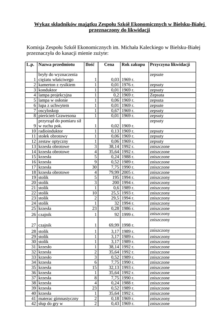 Wykaz składników majątku Zespołu Szkół Ekonomicznych w Bielsku-Białej przeznaczony do likwidacji Komisja Zespołu Szkół Ekonomicznych im. Michała Kaleckiego w Bielsku-Białej przeznaczyła do kasacji mienie zużyte: L.p. Nazwa przedmiotu Ilość Cena Rok zakupu 1 1 1 1 1 1 1 1 0,03 0,01 0,01 0,2 0,06 0,01 0,67 0,01 1969 r. 1976 r. 1969 r. 1969 r. 1969 r. 1969 r. 1969 r. 1969 r. 9 10 11 12 13 14 15 16 17 18 19 20 21 22 23 24 25 26 bryły do wyznaczenia ciężatu właściwego kamerton z rysikiem konduktor lampa projekcyjna lampa w osłonie lupa z uchwytem oscyloskop pierścień Grawesona przyrząd do pomiaru sił w ruchu pok. radioinduktor stołek obrotowy zestaw optyczny krzesła obrotowe krzesła obrotowe krzesła krzesła krzesła krzesła obrotowe stolik stolik stolik stolik stolik stolik krzesła czajnik 1 1 1 1 3 4 5 9 30 4 5 3 1 10 2 1 23 1 0,02 0,13 0,06 0,06 38,14 35,64 0,24 0,52 7,75 79,99 195 200 0,6 25,5 29,5 32 0,28 92 1969 r. 1969 r. 1969 r. 1969 r. 1992 r. 1992 r. 1988 r. 1989 r. 1990 r. 2005 r. 1994 r. 1994 r. 1989 r. 1993 r. 1994 r. 1994 r. 1986 r. 1999 r. 27 28 29 30 31 32 33 34 35 36 37 38 39 40 41 42 czajnik stolik stolik stolik krzesło krzesła krzesło krzesła krzesła krzesła krzesła krzesła krzesła krzesła materac gimnastyczny słup do gry w 1 1 1 1 1 2 3 6 15 1 8 4 23 1 2 2 69,99 3,17 3,17 3,17 38,14 35,64 0,52 7,75 32,13 35,64 7,75 0,24 0,52 35,64 0,18 0,43 1998 r. 1989 r. 1989 r. 1989 r. 1992 r. 1992 r. 1989 r. 1990 r. 1993 r. 1992 r. 1990 r. 1988 r. 1989 r. 1992 r. 1969 r. 1969 r. 1 2 3 4 5 6 7 8 Przyczyna likwidacji zepsute zepsuty zepsuty Zepsuta zepsuta zepsute zepsuty zepsuty zepsuty zepsuty zepsuty zepsuty zniszczone zniszczone zniszczone zniszczone zniszczone zniszczone zniszczony zniszczony zniszczony zniszczony zniszczony zniszczony zniszczone zniszczony zniszczony zniszczony zniszczony zniszczony zniszczone zniszczone zniszczone zniszczone zniszczone zniszczone zniszczone zniszczone zniszczone zniszczone zniszczony zniszczone 43 44 45 46 47 48 49 50 51 52 53 54 55 56 57 58 59 60 61 62 koszykówkę stół do tenisa stołowego desymetr mikrometr magazynek do rzutnika mikroskop obiektywy odmiany węgla kamiennego zestaw do elektrolizy Licencja na program arkusz org. Licencja na program plan lekcji Licencja na program sekretariat Licencja na program świadectwa program antywir 12.05.514844 program antywir 12.066154 program dotacje unijne i atlas polski program płace program płace-księg. program sekretariat uczniowski program sekretariat uczniowski program sekretariat uczniowski program kadry 2000 1 1 1 1 1 0,41 0,01 0,02 3,8 0,1 1986 r. 1969 r. 1969 r. 1994 r. 1969 r. 1 1 0,02 1969 r. 0,03 1969 r. 1 597,8 2003 r. zniszczony zniszczony zniszczony zniszczony zepsuty zepsute zepsuty nieaktualny nieaktualny 1 847,9 2003 r. 1 300 2003 r. 1 610 2003 r. 1 439,2 2000 r. nieaktualny nieaktualny nieaktualny nieaktualny 1 259,86 2001 r. 1 1 1 255 2005 r. 2000 1998 r. 1330 1994 r. 1 1000 1997 r. 1 150 1998 r. nieaktualny nieaktualny nieaktualny nieaktualny nieaktualny nieaktualny 1 1 380 1998 r. 800 1997 r. nieaktualny Dyrektor Zespołu Szkół Ekonomicznych mgr Maria Marczyk