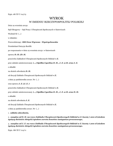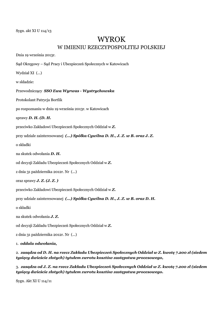 Sygn. akt XI U 114/13 WYROK W IMIENIU RZECZYPOSPOLITEJ POLSKIEJ Dnia 19 września 2013r. Sąd Okręgowy – Sąd Pracy i Ubezpieczeń Społecznych w Katowicach Wydział XI (...) w składzie: Przewodniczący SSO Ewa Wyrwas - Wystrychowska Protokolant Patrycja Bortlik po rozpoznaniu w dniu 19 września 2013r. w Katowicach sprawy D. H. (D. H. przeciwko Zakładowi Ubezpieczeń Społecznych Oddział w Z. przy udziale zainteresowanej (...) Spółka Cywilna D. H., J. Z. w B. oraz J. Z. o składki na skutek odwołania D. H. od decyzji Zakładu Ubezpieczeń Społecznych Oddział w Z. z dnia 31 października 2012r. Nr (...) oraz sprawy J. Z. (J. Z. ) przeciwko Zakładowi Ubezpieczeń Społecznych Oddział w Z. przy udziale zainteresowanej (...) Spółka Cywilna D. H., J. Z. w B. oraz D. H. o składki na skutek odwołania J. Z. od decyzji Zakładu Ubezpieczeń Społecznych Oddział w Z. z dnia 31 października 2012r. Nr (...) 1. oddala odwołania, 2. zasądza od D. H. na rzecz Zakładu Ubezpieczeń Społecznych Oddział w Z. kwotę 7.200 zł (siedem tysięcy dwieście złotych) tytułem zwrotu kosztów zastępstwa procesowego, 3. zasądza od J. Z. na rzecz Zakładu Ubezpieczeń Społecznych Oddział w Z. kwotę 7.200 zł (siedem tysięcy dwieście złotych) tytułem zwrotu kosztów zastępstwa procesowego. Sygn. Akt XI U 114/11 UZASADNIENIE Decyzją z dnia 31.10.2012 r. nr (...) Zakład Ubezpieczeń Społecznych Oddział w Z. orzekł, że odwołująca J. Z. jako wspólnik spółki cywilnej, działającej pod nazwą (...) D. H., J. Z. odpowiada całym swoim majątkiem solidarnie ze wspólnikiem tejże spółki cywilnej (...) za należności z tytułu składek na fundusze obsługiwane przez ZUS, obciążające płatnika składek spółkę cywilną działającą pod nazwą (...) D. H., J. Z. w wysokości : na ubezpieczenia społeczne za okres 06/2008, 02/2009, (...), od 09/2009 do 10/2009, od 01/2010 do 01/2011, od 02/2012 do 08/2012 z tytułu składek w kwocie 385 744,07 zł i z tytułu odsetek w kwocie 87 695 zł, na ubezpieczenie zdrowotne za okres 04/2009,09/2009, od 04/2010 do 08/2010, (...), od 02/2012 do 08/2012 z tytułu składek w kwocie 77 857,34 zł i z tytułu odsetek w kwocie 13 088 zł, na Fundusz Pracy i Fundusz Gwarantowanych Świadczeń Pracowniczych za okres od 03/2007 do 05/2007, (...), (...), od 05/2010 do 01/2011, od 04/2011 do 08/2011, od 10/2011 do 08/2012 z tytułu składek 36 582,33 zł i z tytułu odsetek w kwocie 7018 zł. W odwołaniu od tej decyzji J. Z. wnosiła o zmianę zaskarżonej decyzji i orzeczenie, że nie jest odpowiedzialna za zaległości płatnika składek (...) D. H., (...) spółka cywilna oraz o zasądzenie kosztów postępowania według norm przepisanych. W uzasadnieniu odwołująca zarzuciła, że wydanie decyzji było przedwczesne, albowiem zaległe należności są sukcesywnie spłacane przez płatnika składek - spółkę cywilną i należy uznać, że dotychczasowe działania podjęte przez ZUS w celu wyegzekwowania zaległych należności są skuteczne. Ponadto, zarzuciła, że wysokość zaległości składkowych została zawyżona i nie zostały uwzględnione dokonane przed wydaniem zaskarżonej decyzji wpłaty wspólników z dnia 17.10.2012 r. oraz wpłaty dokonane przez wspólników po wydaniu zaskarżonej decyzji w dniach 14.11.2012 r. i 17.12.2012 r. W odpowiedzi na odwołanie organ rentowy wnosił o oddalenie odwołania i zasądzenie zwrotu kosztów zastępstwa procesowego według norm przepisanych . Organ rentowy wywodził, jak w zaskarżonej decyzji a ponadto, wskazał, że na gruncie art. 115 ustawy Ordynacja podatkowa i aktualnego orzecznictwa sądów nie ma żadnych przesłanek, których spełnienie skutkuje odpowiedzialnością lub uwolnieniem wspólnika spółki cywilnej od odpowiedzialności za zaległości składkowe tej spółki , w tym również przesłanki bezskuteczności egzekucji i dlatego zarzut o przedwczesności decyzji jest bezzasadny. Podniósł również , że rozliczenie konta płatnika składek zostało dokonane prawidłowo, zgodnie z obowiązującymi przepisami i zadłużenie na dzień wydania zaskarżonej decyzji zostało pomniejszone o wpłaty wspólników z dnia 17.10.2012 r. Natomiast rozliczenie dokonane na dzień wydania zaskarżonej decyzji nie ujmuje wpłat dokonanych po dacie wydania i doręczenia stronom zaskarżonej decyzji, albowiem wpłaty te zmniejszyły obecny stan zaległości odwołującej , jednak oceny prawidłowości zaskarżonej decyzji należy dokonać według stanu , który istniał w dacie wydania zaskarżonej decyzji. Organ rentowy wskazał , że drugą decyzją z tej samej daty orzekł o odpowiedzialności za przedmiotowe zaległości składkowe również drugiego wspólnika tej spółki (...), która również wniosła odwołanie. Drugą decyzją z dnia 31.10.2012 r. nr (...) Zakład Ubezpieczeń Społecznych Oddział w Z. orzekł, że odwołująca D. H. jako wspólnik spółki cywilnej, działającej pod nazwą (...) D. H., J. Z. odpowiada całym swoim majątkiem solidarnie ze wspólnikiem tejże spółki cywilnej (...) za należności z tytułu składek na fundusze obsługiwane przez ZUS, obciążające płatnika składek spółkę cywilną działającą pod nazwą (...) D. H., J. Z. w wysokości : na ubezpieczenia społeczne za okres 06/2008, 02/2009, (...), od 09/2009 do 10/2009, od 01/2010 do 01/2011, od 02/2012 do 08/2012 z tytułu składek w kwocie 385 744,07 zł i z tytułu odsetek w kwocie 87 695 zł, na ubezpieczenie zdrowotne za okres 04/2009,09/2009, od 04/2010 do 08/2010, (...), od 02/2012 do 08/2012 z tytułu składek w kwocie 77 857,34 zł i z tytułu odsetek w kwocie 13 088 zł, na Fundusz Pracy i Fundusz Gwarantowanych Świadczeń Pracowniczych za okres od 03/2007 do 05/2007, (...), (...), od 05/2010 do 01/2011, od 04/2011 do 08/2011, od 10/2011 do 08/2012 z tytułu składek 36 582,33 zł i z tytułu odsetek w kwocie 7018 zł. W odwołaniu od tej decyzji D. H. wnosiła o zmian