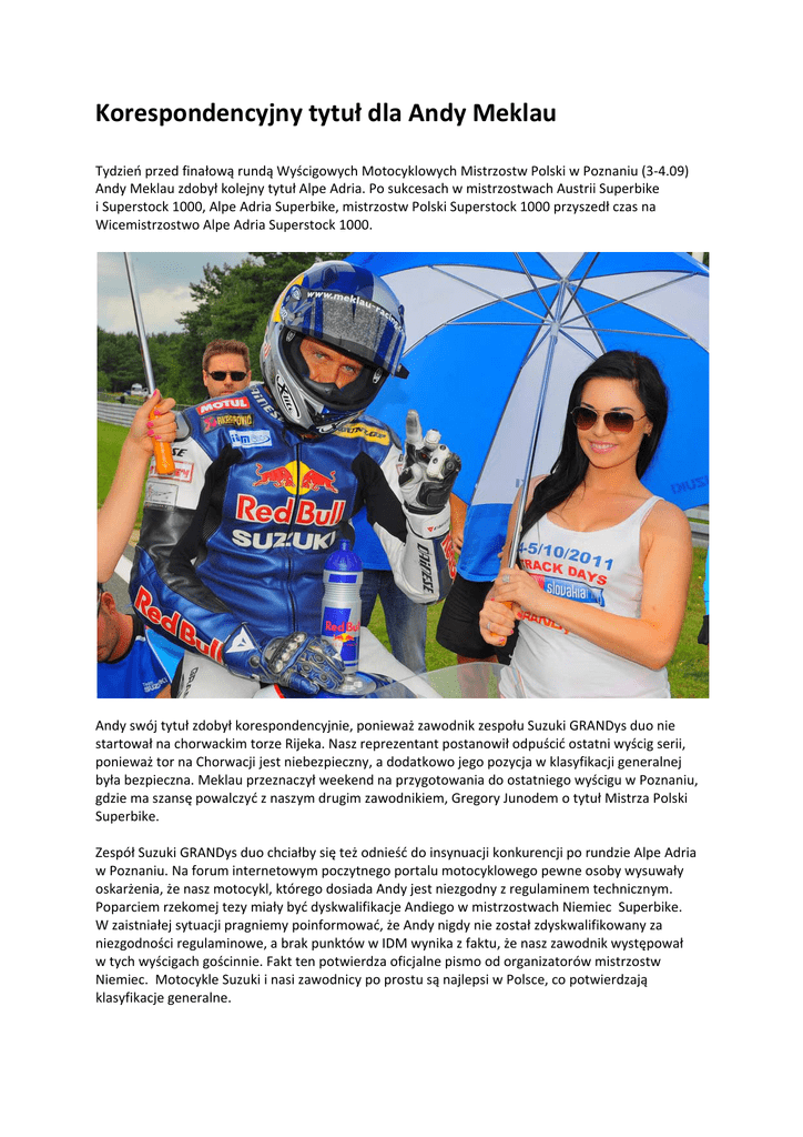 Korespondencyjny tytuł dla Andy Meklau Tydzień przed finałową rundą Wyścigowych Motocyklowych Mistrzostw Polski w Poznaniu (3‐4.09) Andy Meklau zdobył kolejny tytuł Alpe Adria. Po sukcesach w mistrzostwach Austrii Superbike i Superstock 1000, Alpe Adria Superbike, mistrzostw Polski Superstock 1000 przyszedł czas na Wicemistrzostwo Alpe Adria Superstock 1000. Andy swój tytuł zdobył korespondencyjnie, ponieważ zawodnik zespołu Suzuki GRANDys duo nie startował na chorwackim torze Rijeka. Nasz reprezentant postanowił odpuścić ostatni wyścig serii, ponieważ tor na Chorwacji jest niebezpieczny, a dodatkowo jego pozycja w klasyfikacji generalnej była bezpieczna. Meklau przeznaczył weekend na przygotowania do ostatniego wyścigu w Poznaniu, gdzie ma szansę powalczyć z naszym drugim zawodnikiem, Gregory Junodem o tytuł Mistrza Polski Superbike. Zespół Suzuki GRANDys duo chciałby się też odnieść do insynuacji konkurencji po rundzie Alpe Adria w Poznaniu. Na forum internetowym poczytnego portalu motocyklowego pewne osoby wysuwały oskarżenia, że nasz motocykl, którego dosiada Andy jest niezgodny z regulaminem technicznym. Poparciem rzekomej tezy miały być dyskwalifikacje Andiego w mistrzostwach Niemiec Superbike. W zaistniałej sytuacji pragniemy poinformować, że Andy nigdy nie został zdyskwalifikowany za niezgodności regulaminowe, a brak punktów w IDM wynika z faktu, że nasz zawodnik występował w tych wyścigach gościnnie. Fakt ten potwierdza oficjalne pismo od organizatorów mistrzostw Niemiec. Motocykle Suzuki i nasi zawodnicy po prostu są najlepsi w Polsce, co potwierdzają klasyfikacje generalne. Jacek Grandys, manager Suzuki GRANDys duo: Odpuściliśmy start w Rijece, bo nie było sensu ryzykować zdrowia na tym dziurawym torze. Sytuacja w tabeli była też dość jasna. Szykujemy się na Poznań, gdzie chcemy przypieczętować kolejne tytuły i potwierdzić naszą dominację w Polsce. Śmieszą mnie insynuacje pewnego zespołu, który zebrał od nas srogie lanie w tym roku, że nasz motocykl jest nieregulaminowy. Gdy oni wygrywali w pierwszej rundzie na nieregulaminowym motocyklu nawet się nie odezwaliśmy, ponieważ sport jest najważniejszy. Smutne, że niektórzy nie potrafią uznać porażki i rozsiewają kłamliwe plotki. Ostatnio słyszałem, że nawet nasze Superbike są „rozwiercone”. Pomówienie tak prymitywne i desperackie, jak prymitywna jest ta metoda „ulepszania” motocykla świadczy tylko o jego autorze. Z radością czekam na ostatnie wyścigi w Poznaniu, żeby po raz kolejny zobaczyć kwaśne miny tych, którzy nas pomawiają. Mam nadzieję, że wyjaśnienia IDM zakończą nagonkę w Internecie. W przeciwnym razie będziemy występować do administratorów portali o ujawnienie IP i kierować sprawy o zniesławienie na drogę prawną.