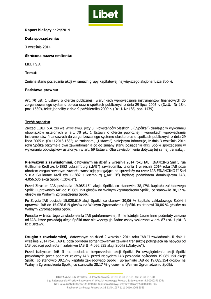 Raport bieżący nr 24/2014 Data sporządzenia: 3 września 2014 Skrócona nazwa emitenta: LIBET S.A. Temat: Zmiana stanu posiadania akcji w ramach grupy kapitałowej największego akcjonariusza Spółki. Podstawa prawna: Art. 70 ust. 1 ustawy o ofercie publicznej i warunkach wprowadzania instrumentów finansowych do zorganizowanego systemu obrotu oraz o spółkach publicznych z dnia 29 lipca 2005 r. (Dz.U. Nr 184, poz. 1539), tekst jednolity z dnia 9 października 2009 r. (Dz.U. Nr 185, poz. 1439). Treść raportu: Zarząd LIBET S.A. z/s we Wrocławiu, przy ul. Powstańców Śląskich 5 („Spółka”) działając w wykonaniu obowiązków ustalonych w art. 70 pkt 1 Ustawy o ofercie publicznej i warunkach wprowadzania instrumentów finansowych do zorganizowanego systemu obrotu oraz o spółkach publicznych z dnia 29 lipca 2005 r. (Dz.U.2013.1382; ze zmianami, „Ustawa”) niniejszym informuje, iż dnia 3 września 2014 roku Spółka otrzymała dwa zawiadomienia co do zmiany stanu posiadania akcji Spółki sporządzone w wykonaniu obowiązków ustalonych w art. 69 Ustawy. Oba zawiadomienia dotyczą tej samej transakcji. Pierwszym z zawiadomień, datowanym na dzień 2 września 2014 roku IAB FINANCING Sarl 5 rue Guillaume Kroll z/s L-1882 Luksemburg („IAB”) zawiadomiła, iż dnia 1 września 2014 roku IAB poza obrotem zorganizowanym zawarła transakcję polegającą na sprzedaży na rzecz IAB FINANCING II Sarl 5 rue Guillaume Kroll z/s L-1882 Luksemburg („IAB II”) będącej podmiotem dominującym IAB, 4.056.535 akcji Spółki („Zbycie”). Przed Zbyciem IAB posiadała 19.085.154 akcje Spółki, co stanowiło 38,17% kapitału zakładowego Spółki i uprawniało IAB do 19.085.154 głosów na Walnym Zgromadzeniu Spółki, co stanowiło 38,17 % głosów na Walnym Zgromadzeniu Spółki. Po Zbyciu IAB posiada 15.028.619 akcji Spółki, co stanowi 30,06 % kapitału zakładowego Spółki i uprawnia IAB do 15.028.619 głosów na Walnym Zgromadzeniu Spółki, co stanowi 30,06 % głosów na Walnym Zgromadzeniu Spółki. Ponadto w treści tego zawiadomienia IAB poinformowała, iż nie istnieją żadne inne podmioty zależne od IAB, które posiadają akcje Spółki oraz nie występują żadne osoby wskazane w art. 87 ust. 1 pkt. 3 lit c Ustawy. Drugim z zawiadomień, datowanym na dzień 2 września 2014 roku IAB II zawiadamia, iż dnia 1 września 2014 roku IAB II poza obrotem zorganizowanym zawarła transakcję polegająca na nabyciu od IAB będącej podmiotem zależnym IAB II, 4.056.535 akcji Spółki („Nabycie”). Przed Nabyciem IAB II nie posiadała bezpośrednio akcji Spółki. Po uwzględnieniu akcji Spółki posiadanych przez podmiot zależny IAB, przed Nabyciem IAB posiadała pośrednio 19.085.154 akcje Spółki, co stanowiło 38,17% kapitału zakładowego Spółki i uprawniało IAB do 19.085.154 głosów na Walnym Zgromadzeniu Spółki, co stanowiło 38,17 % głosów na Walnym Zgromadzeniu Spółki. LIBET S.A. 53-332 Wrocław, ul. Powstańców Śl. 5; tel.: 71 33 51 101, fax: 71 33 51 100 Sąd Rejonowy dla Wrocław Fabrycznej VI Wydział Krajowego Rejestru Sądowego nr KRS 0000373276; NIP: 5252422424; Regon 141349437; Kapitał zakładowy, w tym wpłacony 500.000,00 PLN Rachunek bankowy: Pekao S.A. 33 1240 1037 1111 0010 3061 6553 Po Nabyciu IAB II posiada bezpośrednio 4.056.535 akcji Spółki, co stanowi 8,11 % kapitału zakładowego Spółki i uprawnia IAB II do 4.056.535 głosów na Walnym Zgromadzeniu Spółki, co stanowi 8,11 % głosów na Walnym Zgromadzeniu Spółki. Nadto w tym zawiadomieniu IAB II wskazuje, iż jedynym podmiotem zależnym od IAB II jest IAB. Po uwzględnieniu akcji Spółki posiadanych przez IAB, po Nabyciu IAB II posiada pośrednio i bezpośrednio 19.085.154 akcje Spółki, co stanowi 38,17% kapitału zakładowego Spółki i uprawnia do 19.085.154 głosów na Walnym Zgromadzeniu Spółki, co stanowi 38,17 % głosów na Walnym Zgromadzeniu Spółki. Ponadto IAB II poinformowała w treści tego zawiadomienia, iż nie występują żadne osoby wskazane w art. 87 ust. 1 pkt. 3 lit c Ustawy. Zarząd Spółki wskazuje, iż opisana wyżej transakcja ma charakter techniczny i jej dokonanie nie wywołuje żadnych zmian w funkcjonowaniu Spółki. Transakcja ta stanowi kolejny krok w procedurze przejęcia przez kadrę menadżerską kontroli nad Spółką. Szerzej o wdrożeniu takiej procedury, Spółka informowała w raporcie bieżącym z numer 08/2014 z 23/04/2014 oraz raporcie bieżącym numer 21/2014 z 20/08/2014. Thomas Lehmann – Prezes Zarządu Ireneusz Gronostaj – Członek Zarządu LIBET S.A. 53-332 Wrocław, ul. Powstańców Śl. 5; tel.: 71 33 51 101, fax: 71 33 51 100 Sąd Rejonowy dla Wrocław Fabrycznej VI Wydział Krajowego Rejestru Sądowego nr KRS 0000373276; NIP: 5252422424; Regon 141349437; Kapitał zakładowy, w tym wpłacony 500.000,00 PLN Rachunek bankowy: Pekao S.A. 33 1240 1037 1111 0010 3061 6553