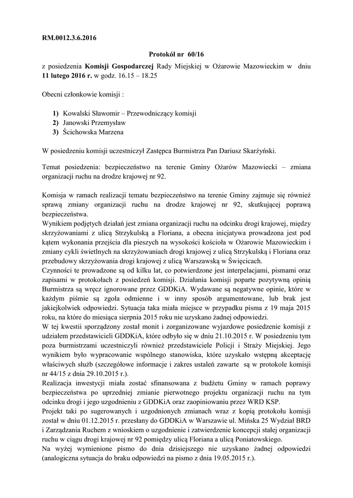 RM.0012.3.6.2016 Protokół nr 60/16 z posiedzenia Komisji Gospodarczej Rady Miejskiej w Ożarowie Mazowieckim w dniu 11 lutego 2016 r. w godz. 16.15 – 18.25 Obecni członkowie komisji : 1) Kowalski Sławomir – Przewodniczący komisji 2) Janowski Przemysław 3) Ścichowska Marzena W posiedzeniu komisji uczestniczył Zastępca Burmistrza Pan Dariusz Skarżyński. Temat posiedzenia: bezpieczeństwo na terenie Gminy Ożarów Mazowiecki – zmiana organizacji ruchu na drodze krajowej nr 92. Komisja w ramach realizacji tematu bezpieczeństwo na terenie Gminy zajmuje się również sprawą zmiany organizacji ruchu na drodze krajowej nr 92, skutkującej poprawą bezpieczeństwa. Wynikiem podjętych działań jest zmiana organizacji ruchu na odcinku drogi krajowej, między skrzyżowaniami z ulicą Strzykulską a Floriana, a obecna inicjatywa prowadzona jest pod kątem wykonania przejścia dla pieszych na wysokości kościoła w Ożarowie Mazowieckim i zmiany cykli świetlnych na skrzyżowaniach drogi krajowej z ulicą Strzykulską i Floriana oraz przebudowy skrzyżowania drogi krajowej z ulicą Warszawską w Święcicach. Czynności te prowadzone są od kilku lat, co potwierdzone jest interpelacjami, pismami oraz zapisami w protokołach z posiedzeń komisji. Działania komisji poparte pozytywną opinią Burmistrza są wręcz ignorowane przez GDDKiA. Wydawane są negatywne opinie, które w każdym piśmie są zgoła odmienne i w inny sposób argumentowane, lub brak jest jakiejkolwiek odpowiedzi. Sytuacja taka miała miejsce w przypadku pisma z 19 maja 2015 roku, na które do miesiąca sierpnia 2015 roku nie uzyskano żadnej odpowiedzi. W tej kwestii sporządzony został monit i zorganizowane wyjazdowe posiedzenie komisji z udziałem przedstawicieli GDDKiA, które odbyło się w dniu 21.10.2015 r. W posiedzeniu tym poza burmistrzami uczestniczyli również przedstawiciele Policji i Straży Miejskiej. Jego wynikiem było wypracowanie wspólnego stanowiska, które uzyskało wstępną akceptację właściwych służb (szczegółowe informacje i zakres ustaleń zawarte są w protokole komisji nr 44/15 z dnia 29.10.2015 r.). Realizacja inwestycji miała zostać sfinansowana z budżetu Gminy w ramach poprawy bezpieczeństwa po uprzedniej zmianie pierwotnego projektu organizacji ruchu na tym odcinku drogi i jego uzgodnieniu z GDDKiA oraz zaopiniowaniu przez WRD KSP. Projekt taki po sugerowanych i uzgodnionych zmianach wraz z kopią protokołu komisji został w dniu 01.12.2015 r. przesłany do GDDKiA w Warszawie ul. Mińska 25 Wydział BRD i Zarządzania Ruchem z wnioskiem o uzgodnienie i zatwierdzenie koncepcji stałej organizacji ruchu w ciągu drogi krajowej nr 92 pomiędzy ulicą Floriana a ulicą Poniatowskiego. Na wyżej wymienione pismo do dnia dzisiejszego nie uzyskano żadnej odpowiedzi (analogiczna sytuacja do braku odpowiedzi na pismo z dnia 19.05.2015 r.). Jak ustalono, w miesiącu styczniu 2016 r. Wiceburmistrz Pan Dariusz Skarżyński kontaktował się telefonicznie z P. Sekulskim – Dyrektorem GDDKiA i wnioskował o zatwierdzenie przesłanego projektu organizacji ruchu z uwzględnioną lokalizacją przejścia dla pieszych i pisemną odpowiedź na pismo z dnia 01.12.2015 r. Do chwili obecnej odpowiedź taka do Urzędu nie wpłynęła. Biorąc pod uwagę powyższe, komisja wnioskuje do Burmistrza o niezwłoczne wystosowanie monitu do GDDKiA o jednoznaczne stanowisko co do pisma z 01.12.2015 r. oraz zapisów z protokołu nr 44/15 Komisji Gospodarczej, co umożliwi Gminie podjęcie dalszych działań w powyższej sprawie. Należy rozważyć zorganizowanie wyjazdowego posiedzenia komisji w GDDKiA w Warszawie z udziałem jej przedstawiciela, który obecny był na wyjazdowym posiedzeniu komisji w dniu 29.10.2015 r. Dla ułatwienia podjęcia stanowiska przez GDDKiA komisja przypomina wszystkie aspekty o które wnioskowała w protokole nr 44/15 i oczekuje decyzji w odniesieniu do niżej wymienionych punktów: 1) Zatwierdzenia i uzgodnienia projektu organizacji ruchu na drodze krajowej nr 92 pomiędzy ulicami Floriana i Poniatowskiego z uwzględnionym przejściem dla pieszych; 2) Uzupełnienie barier oddzielających jezdnię od chodnika na tym odcinku drogi; 3) Zmiana cykli sygnalizacji świetlnej na skrzyżowaniu drogi krajowej nr 92 z ulicą Strzykulską – Konotopską. Zmiana ta polegałaby na uwzględnieniu w ramach cyklu czerwonego światła dla obydwu kierunków ruchu kołowego drogi krajowej nr 92 przemiennego cyklu zielonego światła dla ruchu kołowego z ulic prostopadłych do drogi krajowej tj. (zielone światło dla wyjeżdżających z ulicy Strzykulskiej – czerwone dla wyjeżdżających z ulicy Konotopskiej, następnie czerwone dla Strzykulskiej a zielone dla Konotopskiej); 4) Zmiana cykli sygnalizacji świetlnej na skrzyżowaniu drogi krajowej nr 92 z ulicą Floriana - Strażacka. Zmiana ta polegałaby na uwzględnieniu w ramach cyklu czerwonego światła dla obydwu kierunków ruchu kołowego drogi krajowej nr 92 przemiennego cyklu zielonego światła dla ruchu kołowego z ulic prostopadłych do drogi krajowej tj. (zielone światło dla wyjeżdżających z ulicy Floriana – czerwone dla wyjeżdżających z ulicy Strażackiej a następnie czerwone dla Floriana a zielone dla Strażackiej); 5) Cofnięcie w kierunku południowym wyznaczonego przejścia dla pieszych w ulicy Strażackiej w rejonie skrzyżowania z drogą krajową nr 92; 6) Przebudowa skrzyżowania drogi krajowej nr 92 z ulicą Warszawską w Święcicach z montażem sygnalizacji świetlnej z warunkowym skrętem w lewo (skrzyżowanie drogi krajowej nr 92 z drogą wojewódzką nr 700). Jako priorytetową sprawę komisja traktuje stanowisko ujęte w pkt 1 a dotyczące zatwierdzenia projektu zmiany organizacji ruchu i wykonania przejścia dla pieszych w Ożarowie Mazowieckim na wysokości kościoła. Rozwiązania te będą służyły poprawie bezpieczeństwa i udrożnieniu ruchu kołowego tak dla drogi krajowej jak i dróg