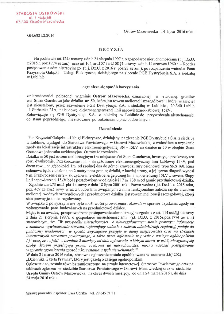 STAROSTA OSTROWSKI ul. 3 Maja 68 07-300 Ostrów Mazowiecka Ostrów Mazowiecka 14 lipca 2016 roku GN.6821.2.2016 DECYZJA Na podstawie art.l24a ustawy z dnia 21 sierpnia 1997 r. o gospodarce nieruchomościami (t. j. Dz.U. z 2015 r. poz.1774 ze zm.) oraz art.104, art.107 i art.108 §1 ustawy z dnia 14 czerwca 1960 r. -Kodeks postępowania administracyjnego (t. j. Dz.U. z 2016 r. poz.23 ze zm.), po rozpatrzeniu wniosku Pana Krzysztofa Gałązki - Usługi Elektryczne, działającego na zlecenie PGE Dystrybucja S.A. z siedzibą w Lublinie ogranicza się sposób korzystania z nieruchomości położonej w gminie Ostrów Mazowiecka, oznaczonej w ewidencji gruntów wsi Stara Osuchowa jako działka nr 50, która jest rowem melioracji szczegółowej i której właściciel jest nieustalony, przez zezwolenie PGE Dystrybucja S.A. z siedzibą w Lublinie , 20-340 Lublin ul. Garbarska 21 A, na budowę elektroenergetycznej linii napowietrzno-kablowej 15kV. Zobowiązuje się PGE Dystrybucja S.A. z siedzibą w Lublinie do przywrócenia nieruchomości do stanu poprzedniego, niezwłocznie po zakończeniu prac budowlanych. Uzasadnienie Pan Krzysztof Gałązka - Usługi Elektryczne, działający na zlecenie PGE Dystrybucja S.A. z siedzibą w Lublinie, wystąpił do Starostwa Powiatowego w Ostrowi Mazowieckiej z wnioskiem o uzyskanie zgody na lokalizację infrastruktury elektroenergetycznej SN - 15kV na działce nr 50 w obrębie Stara Osuchowa jednostka ewidencyjna Ostrów Mazowiecka. Działka nr 50 jest rowem melioracyjnym i w miejscowości Stara Osuchowa, inwestycja przekroczy ten rów, dwukrotnie. Przekroczenie nrl - skrzyżowanie elektroenergetycznej linii kablowej 15kV, pod dnem rowu, na głębokości lm od rzędnej dna do gómej krawędzi rury osłonowej typu SRS 160. Rura osłonowa będzie ułożona po 2 metiy poza granicę działki, z każdej strony, a jej łączna długość wynosi 9 m. Przekroczenie nr 2 - skrzyżowanie elektroenergetycznej linii napowietrznej 15kV z rowem. Słupy linii napowietrznej 15kV będą posadowione w odległości 17 m i 38 m od granic przedmiotowej działki. Zgodnie z art.73 ust.l pkt 1 ustawy z dnia 18 lipca 2001 roku Prawo wodne ( j.t. Dz.U. z 2015 roku, poz. 469 ze zm.) rowy wraz z budowlami związanymi z nimi funkcjonalnie zalicza się do urządzeń melioracji wodnych szczegółowych i przedmiotowa działka jest rowem melioracji szczegółowej, której stan prawny jest nieuregulowany. W związku z powyższym nie było możliwości prowadzenia rokowań w sprawie uzyskania zgody na wykonywanie prac budowlanych na przedmiotowej działce. Mając to na uwadze, przeprowadzono postępowanie administracyjne zgodnie z art. 114 ust.3j>4 ustawy z dnia 21 sierpnia 1997r. o gospodarce nieruchomościami (j.t. Dz.U. z 2015r.poz.1774 ze zm.) stanowiącym, że: ”W przypadku nieruchomości o nieuregulowanym stanie prawnym informację o zamiarze wywłaszczenia starosta, wykonujący zadanie z zakresu administracji rządowej, podaje do publicznej wiadomości w sposób zwyczajowo przyjęty w danej miejscowości oraz na stronach internetowych starostwa powiatowego, a także przez ogłoszenie w prasie o zasięgu ogólnopolskim ( ) ” oraz, że : „jeśli w terminie 2 miesięcy od dnia ogłoszenia, o którym mowa w ust.3, nie zgłoszą się osoby, którym przysługują prawa rzeczowe do nieruchomości, można wszcząć postępowanie w sprawie ograniczenia sposobu korzystania z tych nieruchomości ”. W dniu 21 marca 2016 roku, stosowne ogłoszenie zostało opublikowane w numerze 55(4202) „Dziennika Gazeta Prawna”, który jest gazetą o zasięgu ogólnopolskim. Ogłoszenie to, zostało również zamieszczone na stronie internetowej Starostwa Powiatowego oraz na tablicach ogłoszeń w siedzibie Starostwa Powiatowego w Ostrowi Mazowieckiej oraz w siedzibie Urzędu Gminy Ostrów Mazowiecka, na okres dwóch miesięcy, od dnia 24 marca 2016 r. do dnia 24 maja 2016 roku. Sprawę prowadzi inspektor Ewa Górska tel. 29 645 71 31 W związku z tym, że w terminie dwóch miesięcy od dnia podania do publicznej wiadomości ogłoszenia 0 zamiarze ograniczenia sposobu korzystania z przedmiotowej nieruchomości w celu budowy linii elektroenergetycznej 15kV, nie zgłosiły się osoby któiym przysługują prawa rzeczowe do nieruchomości, w dniu 30 maja 2016 r. zostało wszczęte postępowanie w tej sprawie. Informacja o tym fakcie została zamieszczona na stronie internetowej Starostwa Powiatowego oraz podana do publicznej wiadomości poprzez wywieszenie na tablicach ogłoszeń w siedzibie Starostwa Powiatowego w Ostrowi Mazowieckiej oraz Urzędu Gminy Ostrów Mazowiecka w terminie od dnia 2 czerwca 2016 r. do dnia 16 czerwca 2016 r. Wniosek Pana Krzysztofa Gałązki - Usługi Elektryczne, działającego na zlecenie PGE Dystrybucja S.A. z siedzibą w Lublinie, o wydanie decyzji w sprawie ograniczenia sposobu korzystania z przedmiotowej nieruchomości w celu budowy elektroenergetycznej linii napowietrzno-kablowej 15kV, jest uzasadniony w treści art. 124 ustawy o gospodarce nieruchomościami, stanowiącym, że Starosta, wykonujący zadania z zakresu administracji rządowej, może ograniczyć w drodze decyzji, sposób korzystania z nieruchomości przez udzielenie zezwolenia na zakładanie i przeprowadzanie na nieruchomości () przewodów i urządzeń,, służących do przesyłania lub dystrybucji płynów, pary, gazów 1energii elektrycznej (). Ograniczenie to następuje zgodnie z planem miejscowym, a w przypadku braku planu, zgodnie z decyzją o ustaleniu lokalizacji inwestycji celu publicznego. ” Urząd Gminy Ostrów Mazowiecka, pismem z dnia 30.06.2016r. potwierdził, zgodność przedmiotowej inwestycji z ustaleniami obowiązującego miejscowego planu zagospodarowania przestrzennego gminy Ostrów Mazowiecka. Wobec powyższego należało orzec jak w sentencji. Od niniejszej decyzji służy stronom odwołanie do Wojewody Mazowieckiego za pośrednictwem Starosty Ostrowskiego w terminie 14 dni od daty dor