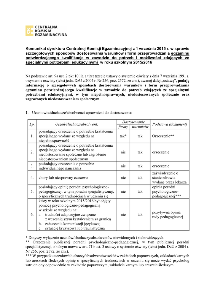 Komunikat dyrektora Centralnej Komisji Egzaminacyjnej z 1 września 2015 r. w sprawie szczegółowych sposobów dostosowania warunków i form przeprowadzania egzaminu potwierdzającego kwalifikacje w zawodzie do potrzeb i możliwości zdających ze specjalnymi potrzebami edukacyjnymi w roku szkolnym 2015/2016 Na podstawie art. 9a ust. 2 pkt 10 lit. a tiret trzecie ustawy o systemie oświaty z dnia 7 września 1991 r. o systemie oświaty (tekst jedn. DzU z 2004 r. Nr 256, poz. 2572, ze zm.), zwanej dalej „ustawą”, podaję informację o szczegółowych sposobach dostosowania warunków i form przeprowadzania egzaminu potwierdzającego kwalifikacje w zawodzie do potrzeb zdających ze specjalnymi potrzebami edukacyjnymi, w tym niepełnosprawnych, niedostosowanych społecznie oraz zagrożonych niedostosowaniem społecznym. 1. Uczniowie/słuchacze/absolwenci uprawnieni do dostosowania: Lp. 1. 2. 3. 4. 5. 6. Uczeń/słuchacz/absolwent: posiadający orzeczenie o potrzebie kształcenia specjalnego wydane ze względu na niepełnosprawność posiadający orzeczenie o potrzebie kształcenia specjalnego wydane ze względu na niedostosowanie społeczne lub zagrożenie niedostosowaniem społecznym posiadający orzeczenie o potrzebie indywidualnego nauczania chory lub niesprawny czasowo posiadający opinię poradni psychologicznopedagogicznej, w tym poradni specjalistycznej, o specyficznych trudnościach w uczeniu się który w roku szkolnym 2015/2016 był objęty pomocą psychologiczno-pedagogiczną w szkole ze względu na: a. trudności adaptacyjne związane z wcześniejszym kształceniem za granicą b. zaburzenia komunikacji językowej c. sytuację kryzysową lub traumatyczną Dostosowanie Podstawa (dokument) formy warunków tak* tak Orzeczenie** nie tak orzeczenie nie tak orzeczenie nie tak nie tak nie tak zaświadczenie o stanie zdrowia wydane przez lekarza opinia poradni psychologicznopedagogicznej*** pozytywna opinia rady pedagogicznej * Dotyczy wyłącznie uczniów/słuchaczy/absolwentów niewidomych i słabowidzących. ** Orzeczenie publicznej poradni psychologiczno-pedagogicznej, w tym publicznej poradni specjalistycznej, o którym mowa w art. 71b ust. 3 ustawy o systemie oświaty (tekst jedn. DzU z 2004 r. Nr 256, poz. 2572, ze zm.). *** W przypadku uczniów/słuchaczy/absolwentów szkół w zakładach poprawczych, zakładach karnych lub aresztach śledczych opinię o specyficznych trudnościach w uczeniu się może wydać psycholog zatrudniony odpowiednio w zakładzie poprawczym, zakładzie karnym lub areszcie śledczym. 2. Osoby, które ukończyły kwalifikacyjny kurs zawodowy lub osoby, które spełniają warunki określone w przepisach w sprawie egzaminów eksternistycznych uprawnieni do dostosowania: Dostosowanie Lp Osoby Podstawa (dokument) formy warunków 1. 2. - niewidome, słabowidzące, - niesłyszące, słabosłyszące, - z niepełnosprawnością ruchową, w tym z afazją, - z niepełnosprawnością intelektualną w stopniu lekkim, - z autyzmem, w tym z zespołem Aspergera posiadające opinię poradni psychologicznopedagogicznej, w tym poradni specjalistycznej, o specyficznych trudnościach w uczeniu się, w tym: z dysleksją, dysgrafią, dysortografią, dyskalkulią chore lub niesprawne czasowo tak* tak zaświadczenie potwierdzające występowanie danej dysfunkcji wydane przez lekarza nie tak opinia poradni psychologicznopedagogicznej zaświadczenie o stanie zdrowia wydane przez lekarza * Dotyczy wyłącznie osób, które ukończyły kwalifikacyjny kurs zawodowy lub osób, które spełniają warunki określone w przepisach w sprawie egzaminów eksternistycznych niewidomych i słabowidzących. 3. nie tak 3. Zaświadczenie o stanie zdrowia, o którym mowa w pkt. 1.4. i 2.3., lub zaświadczenie potwierdzające występowaniu danej dysfunkcji, o którym mowa w pkt. 2.1., zdający dołącza do: – deklaracji – w przypadku ucznia/absolwenta/osoby, która ukończyła kwalifikacyjny kurs zawodowy, – wniosku o dopuszczenie do egzaminu zawodowego – w przypadku osoby dorosłej, która ukończyła praktyczną naukę zawodu dla dorosłych lub przyuczenie do pracy dla dorosłych, – wniosku o dopuszczenie do eksternistycznego egzaminu zawodowego – w przypadku osoby przystępującej do eksternistycznego egzaminu zawodowego. W szczególnych przypadkach zaświadczenie może być przedłożone w terminie późniejszym, niezwłocznie po jego otrzymaniu. 4. Opinię poradni psychologiczno-pedagogicznej, w tym poradni specjalistycznej, o specyficznych trudnościach w uczeniu się, o której mowa w pkt. 1.5., uczeń/słuchacz/absolwent składa dyrektorowi szkoły wraz z deklaracją dotyczącą przystąpienia do egzaminu. 5. Opinia rady pedagogicznej, o której mowa w pkt. 1.6., jest wydawana na wniosek: a. nauczyciela lub specjalisty wykonującego w szkole zadania z zakresu pomocy psychologicznopedagogicznej, prowadzących zajęcia z uczniem/słuchaczem w szkole, po uzyskaniu zgody rodziców/prawnych opiekunów albo pełnoletniego ucznia/słuchacza, lub b. rodziców/prawnych opiekunów albo pełnoletniego ucznia/słuchacza. 6. Dla uczniów/słuchaczy/absolwentów wymienionych w pkt. 1.2.–1.6. nie przygotowuje się odrębnych arkuszy egzaminacyjnych. 7. Rada pedagogiczna, spośród możliwych sposobów dostosowania warunków przeprowadzania egzaminu zawodowego, wskazanych w Tabeli 1., wskazuje sposób lub sposoby dostosowania warunków przeprowadzania egzaminu zawodowego dla danego ucznia/słuchacza/absolwenta. 8. Sposób lub sposoby dostosowania warunków przeprowadzenia egzaminu zawodowego do potrzeb i możliwości osób, które ukończyły kwalifikacyjny kurs zawodowy, lub osób, które spełniają warunki określone w przepisach w sprawie egzaminów eksternistycznych, wskazuje dyrektor komisji okręgowej lub upoważniona przez niego osoba, wybierając spośród możliwych sposobów dostosowania warunków przeprowadzania egzaminów określonych w Tabeli 1. 9. Dostosowując warunki i for