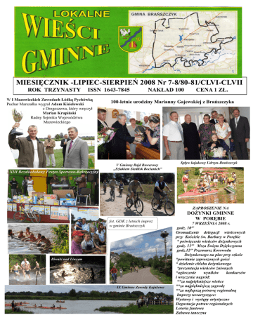 MIESIĘCZNIK -LIPIEC-SIERPIEŃ 2008 Nr 7-8/80-81/CLVI-CLVII ROK TRZYNASTY ISSN 1643-7845 W I Mazowieckich Zawodach Łódką Pychówką Puchar Marszałka wygrał Adam Kisielewski z Drogoszewa, który wręczył Marian Krupiński Radny Sejmiku Województwa Mazowieckiego XIII Bezalkoholowy Festyn Sportowo-Rekreacyjny NAKŁAD 100 CENA 1 ZŁ. 100-letnie urodziny Marianny Gajewskiej z Brańszczyka V Gminny Rajd Rowerowy „Szlakiem Siedlisk Bocianich” Spływ kajakowy Udrzyn-Brańszczyk ZAPROSZENIE NA fot. GDK z letnich imprez w gminie Brańszczyk Biwaki nad Liwcem IX Gminne Zawody Kajakowe DOŻYNKI GMINNE W PORĘBIE 7 WRZEŚNIA 2008 r. godz. 10³º Gromadzenie delegacji wieńcowych przy Kościele św. Barbary w Porębie * poświęcenie wieńców dożynkowych godz. 11ºº Msza Święta Dziękczynna godz.12³º Przemarsz Korowodu Dożynkowego na plac przy szkole *powitanie zaproszonych gości * dzielenie chleba dożynkowego *prezentacja wieńców żniwnych *ogłoszenie wyników konkursów i wręczenie nagród: **za najpiękniejsze wieńce **za najpiękniejszą zagrodę **za najlepszą potrawę regionalną Imprezy towarzyszące: Wystawy i występy artystyczne Degustacja potraw regionalnych Loteria fantowa Zabawa taneczna Stulatka w Brańszczyku Pani Marianna Bronisława Gajewska rod. Danis w dniu 15 sierpnia br. obchodziła swoje setne urodziny. Z tej okazji w kaplicy u Księży Orionistów w Domu Emeryta w Brańszczyku odprawiono uroczystą Mszę Świętą. Pani Marianna urodziła się w Święto Wniebowzięcia Maryi Panny, dlatego też dostała takie imię. Całe swoje życie mieszkała w Brańszczyku. Ma 2 córki, 3 wnuków i 6 prawnuków. Od lat jest wdową. Jubilatka co niedziela przychodzi do tej właśnie kaplicy. Jest bardzo zaprzyjaźniona z księdzem Józefem Wojciechowskim, który odprawił Mszę Świętą. Ksiądz dyrektor podkreślił dużą siłę woli życia Jubilatki, zapewniając jednocześnie, że to żarliwa modlitwa daje jej tę właśnie siłę. Pani Marianna, jak powiedziała jej córka Zofia Danuta Gajewska, jest osobą bardzo schorowaną. Od 10 lat jest niewidoma, a choruje od 50 roku życia. Na światłość umysłu na pewno wpłynął fakt, że do czasu kiedy widziała bardzo dużo czytała, a teraz z pełną świadomością odmawia modlitwy. Wójt Gminy Mieczysław Pękul składając życzenia powiedział m.in..: „Człowiek bierze udział w różnych uroczystościach i wiele razy słyszy życzenia 100 lat życia, jednak spełniają się one bardzo rzadko. Trzeba sobie bowiem na to zapracować godnym życiem. Trzeba znaleźć uznanie wśród ludzi i u Boga, który pozwala szczęśliwie dożyć 100 lat…”. Życzył również Szanownej Jubilatce, corocznych spotkań na uroczystościach urodzinowych. Życzenia jubilatce złożyła rodzina oraz przedstawiciele władz gminy i powiatu: Wójt Gminy Mieczysław Pękul, Zastępca Wójta Andrzej Łapiński, Przewodniczący Rady Gminy Sławomir Gałązka, Kierownik USC Teresa Kasprowicz, Sołtys wsi Tadeusz Bednarski. Władze powiatu reprezentował radny Jerzy Jubilatka otrzymała listy gratulacyjne, upominki Żukowski. Do życzeń i kwiaty. Po uroczystym nabożeństwie uczestnicy dołączył się również spotkali się na wspólnym przyjęciu, gdzie wznieśli ks. kan. Paweł Stachecki i toast za zdrowie jubilatki, zjedli obiad oraz pyszny ks. kan. Eugeniusz Jachna. urodzinowy tort. Licznie przybyli również sąsiedzi i znajomi od których Szanowna jubilatka, bardzo wzruszona dziękowała jubilatka usłyszała wiele ciepłych słów. każdej osobie przybyłej na jej urodziny. Życzymy Pani dużo zdrowia. Teresa Kasprowicz „Lokalne Wieści Gminne” Nr 7-8/80-81/2008 s. 2 Życzenia dla Jubilatki Pani Marianny Gajewskiej z Brańszczyka Gratulacje i serdeczne życzenia wielu lat w zdrowiu i radości Drogiej Jubilatce Pani Mariannie Gajewskiej składa Redakcja „LWG” „Lokalne Wieści Gminne” Nr 7-8/80-81/ 2008 s. 3 Zakończenie roku szkolnego 2007/2008 20 czerwca 2008r. w PSP im. Piotra Kulasińskiego w Trzciance pożegnano rok szkolny 2007/2008, który obfitował w wiele wydarzeń. Do chlubnej historii naszej szkoły przeszła uroczystość związana z obchodami 60-lecia szkoły, organizacja X Gminnych Biegów Przełajowych z udziałem mistrza olimpijskiego Roberta Korzeniowskiego, jak też organizacja akcji charytatywnej „Pomoc dla Michałka”. Podziękowaniem, które otrzymaliśmy od Rodziców chorego dziecka dzielimy się z każdym dobroczyńcą. Nasza placówka była inicjatorem wielu konkursów gminnych: IV Przeglądu Piosenki Żołnierskiej, III Gminnego Konkursu Języka Angielskiego, II Gminnego Turnieju z zakresu Profilaktyki, II Gminnego Konkursu na najładniejszą palmę wielkanocną. Zachęca uczniów do aktywności twórczej, kształci i rozwija uczniowskie umiejętności, przygotowuje do życia w społeczeństwie, dba o poziom nauczania na miarę możliwości każdego ucznia. Uczniowie naszej szkoły mogą się poszczycić wielorakimi osiągnięciami w konkursach na szczeblu gminnym, powiatowym i ogólnopolskim. Jest to efekt ich pracy nie tylko na lekcjach, ale także na zajęciach pozalekcyjnych pod kierunkiem zaangażowanych nauczycieli. Odnotowali swoje sukcesy także w sporcie. Zakończenie roku szkolnego to szczególna okazja, by podziękować uczniom, najlepszym wręczyć świadectwa z wyróżnieniem, dyplomy, nagrody książkowe za wyniki w nauce, sporcie, 100% frekwencję oraz godne reprezentowanie szkoły na zewnątrz. A także przekazać podziękowania Nauczycielom i Rodzicom, którzy z zaangażowaniem dzielą szkolne sukcesy i niedole życia szkolnego, czynnie włączają się w organizację uroczystości. Pamiętają o tym, że tylko współpraca szkoły i rodziny może być gwarancją prawidłowego wychowania. Tylko wspólne działanie pomoże osiągnąć najlepsze efekty. Podziękowanie dla Nauczycieli za całoroczny trud włożony w nauczanie i wychowanie uczniów przekazał obecny na u
