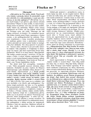 2012-12-23 strona 1/2 Fiszka nr 7 Okruszki „Gdy patrzę na Twe niebo, dzieło Twych pal ców, księżyc i gwiazdy, któreś Ty utwierdził: czym jest człowiek, że o nim pamiętasz, i czym syn czło wieczy, że się nim zajmujesz?” (Ps 8,56). Czy ta- kie myśli krążą Ci po głowie, gdy idziesz ulicami Jerozolimy? Mijasz te same zaułki, te same kramy. Drogę znasz na pamięć, tyle razy już tędy szedłeś. Tylko ludzie się zmieniają. Mijasz coraz więcej młodszych od Ciebie, nie ma jednak wśród nich ani Twojego syna, ani córki. Dlaczego już tak trudno uwierzyć, że kiedyś i Ty zostaniesz ojcem. Tak blisko Izraela jesteś Panie, pamiętasz o ludzie swoim, a nie pobłogosławiłeś tej rodzinie. Przecież wypełniacie z żoną wszystkie przykazania, ale nadzieja gaśnie wraz z podeszłym wiekiem. Ludzie przestali już nawet pytać kiedy to nastąpi. Chcą być delikatni. Nie chcą sprawić Ci przykrości. Jeszcze ufasz, chociaż to już jest tylko iskierka nadziei. Gdy popadasz w zwątpienie to denerwuje Cię nawet, gdy ktoś wypowiada Twoje imię: Zachariasz. Wiesz co to imię znaczy: Bóg pamięta. Tak trudno czasem przyjąć i uwierzyć, że Pan pamięta o Tobie. A może właśnie zapomniał? Zatopiony w tych rozmyślaniach mijasz kolejny zakręt, stąd widać już Świątynię. Teraz kolej na Twój oddział, czas Twojej kapłańskiej służby. Ten dzień miał być szczególny, wiedziałeś o tym. Tobie przypadał zaszczyt złożenia ofiary kadzenia. Znalazłeś się przy wejściu do Miejsca Najświętszego i gdy składałeś ofiarę ukazał Ci się anioł Pański. Zapowiedział: „(...) Twoja prośba została wysłuchana: żona twoja, Elżbieta, urodzi ci syna i nadasz mu imię Jan. Będzie to dla ciebie radość i wesele, i wielu cieszyć się będzie z jego narodzin. Będzie bowiem wielki w oczach Pana (...)” (Łk 1,1315). Tyle czasu na to czekałeś, tyle Jednak gdy spojrzeć z perspektywy czasu, to może lepiej się stało, że nie mogłeś mówić. Może to była nie tylko kara, ale i pomoc od Boga. Czasem trzeba pomilczeć. Czasem może za dużo mówiłeś. Może niepotrzebnie chwaliłbyś się przed ludźmi, może przekonywałbyś o swojej prawości i o tym, że w końcu Pan przypomniał sobie o Tobie, w końcu wynagrodził Cię. A przecież to nie Twoja zasługa, a On nigdy nie zapomniał. Milcząc mogłeś całkowicie otworzyć się na Boga. Nie musiałeś niczego tłumaczyć ludziom. Mogłeś przygotowywać się na wypowiedzienie najważniejszych słów w Twoim życiu. Anioł odebrał Ci mowę ale zapowiedział też, że gdy wszystko się wypełni, będziesz znowu mówił. Czekałeś na ten czas w ciszy, a słowa, które później wypowiedziałeś, warte były tego czasu milczenia. Benedictus słowa, które do dzisiaj codziennie są wypowiadane: „«Błogosławiony Pan, Bóg Izraela, bo nawie dził lud swój i odkupił, i moc zbawczą nam wzbu dził w domu sługi swego, Dawida (...) że nam użyczy tego, iż z mocy nieprzyjaciół wyrwani, bez lęku służyć Mu będziemy w pobożności i sprawie dliwości przed Nim po wszystkie dni nasze.»” (Łk 1,6875). Anioł zapowiedział w Świątyni, że syn Twój „będzie wielki w oczach Pana”. Sam Bóg nadał mu imię: Jan, co znaczy: Bóg daje łaskę, miłosierdzie. Rola Twojego syna będzie ogromna, W historii ludzkości rozpoczyna się okres zbawienia, okres trwania miłosierdzia Bożego, a Twój syn ma ten przywilej, że zapowiada przyjście Mesjasza. „«A i ty dziecię, prorokiem Najwyższego zwać się będziesz, bo pójdziesz przed Panem przygotować mu drogi; Jego ludowi dasz poznać zbawienie, [co się dokona] przez odpuszczenie mu grzechów, dzięki litości serdecznej Boga naszego. Przez nią nawiedzi nas Słońce Wschodzące z wysoka, by zajaśnieć tym, co w mroku i cieniu śmierci miesz kają, aby nasze kroki zwrócić na drogę pokoju»” (Łk 1,7679). Pan już jest blisko, oczekiwanie za- razy myślałeś o tej chwili, gdy pobiegniesz i będziesz mógł pochwalić się tym, co Cię spotkało. Pan przypomniał sobie o Tobie, pamiętał. Tyle lat w niepewności, czasami w zwątpieniu, rozpaczy... W końcu z Twojej rodziny zdjęta została hańba. kończyło się, teraz pozostało już tylko wypełnić Znowu będziesz mógł iść z podniesioną głową. przesłanie Jana: „(...) Głos wołającego na pusty Tylko czy to na pewno się zdarzy? Powracają wąt- ni: Przygotujcie drogę Panu, prostujcie ścieżki pliwości, które pielęgnowałeś w sobie tyle lat... dla Niego! Każda dolina zostanie wypełniona, Nie powiesz więc nikomu o swoim szczęściu. Za każda góra i pagórek zrównane, drogi kręte staną ten brak wiary anioł ukarał Cię odebraniem mowy. się prostymi, a drogi wyboiste gładkimi! I wszyscy Nie pobiegniesz z dobrą nowiną do znajomych. ludzie ujrzą zbawienie Boże.” (Łk 3,46). Nikomu o niej nie opowiesz. Będziesz milczał aż Aleksander Kamiński do dnia, kiedy wypełnią się słowa przekazane przez anioła. 2012-12-23 strona 2/2 Kamienie w ogródku Fiszka nr 7 Czekolada bez cukru, mleko bez tłuszczu, kawa bez kofeiny. Na co dzień mamy do czynienia z różnymi produktami celowo pozbawianymi swojego charakterystycznego i ważnego składnika. Jaka jest zawartość mięsa w kupowanej przez nas szynce? Czym tak naprawdę jest tzw. produkt seropodobny albo aromat identyczny z naturalnym? Może czasem lepiej tego nie wiedzieć... Jednak pomimo tego, iż przedświąteczny czas sprzyja tematom kulinarnym, bynajmniej nie branży spożywczej poświęcona będzie moja dzisiejsza refleksja. Kończy się okres Adwentu. Adwent, z łac. adventus – przyjście. My chrześcijanie nie mamy żadnych wątpliwości o czyje przyjście chodzi. Czyżby? „Władze w Szwecji pozwoliły, aby szkoły zabie rały dzieci i młodzież na nabożeństwa adwentowe pod warunkiem, że nie będzie na nich wymieniane słowo «Jezus». Według nadzorujących szwedzkie szkolnictwo, nauczanie 