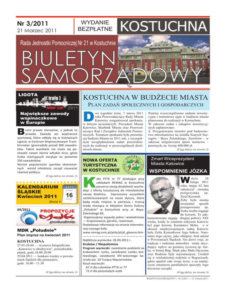 Nr 3/2011 21 Marzec 2011 LIGOTA WYDANIE BEZPŁATNE KOSTUCHNA W BUDŻECIE MIASTA PLAN ZADAŃ SPOŁECZNYCH I GOSPODARCZYCH Największe zawody wspinaczkowe w Europie B rzmi prawie nierealnie, a jednak to prawda. Zawody we wspinaczce sportowej, które odbyły się w Katowicach Ligocie, w Centrum Wspinaczkowym Transformator zgromadziły ponad 300 zawodników. Takim wynikiem nie może się pochwalid nawet słynne włoskie Arco, gdzie liczba startujących oscyluje na poziomie 250 zawodników. Wzrost popularności sportów ekstremalnych wśród młodzieży zaczęli zauważad również politycy. (Ciąg dalszy na stronie 2) KALENDARIUM ŚLĄSKIE Kwiecień 2011 Strona 4 04/2011 PROPOZYCJE MDK „Południe” Plan imprez na kwiecień 2011 KOSTUCHNA 27.01-26.04 — wystawa fotograficzna „Katowice w obiektywie”, poniedziałekpiątek, godz.10.00-20.00 29.04.2011 — konkurs wiedzy o powstaniach śląskich dla gimnazjów, godz. 10.00 - 11.30 (Ciąg dalszy na stronie 2) D wa tygodnie temu, 7 marca 2011 roku Przewodniczący Rady Miasta Katowice zorganizował spotkanie, w którym uczestniczyli: Prezydent Miasta Katowice, Skarbnik Miasta oraz Przewodniczący Rad i Zarządów Jednostek Pomocniczych. Tematem spotkania była prezentacja budżetu Miasta na 2011 rok, z szczególnym uwzględnieniem zadań przewidzianych do realizacji w poszczególnych dzielnicach miasta. NOWA OFERTA TURYSTYCZNA W KOSTUCHNIE K Poniżej wyszczególniono zadania inwestycyjne i remontowe ujęte w budżecie miasta planowane do realizacji w Kostuchnie. W zakresie zadań i zakupów inwestycyjnych zaplanowano: 1. Przygotowanie terenów pod budownictwo mieszkaniowe na osiedlu Szarych Szeregów / Boya Żeleńskiego, Zawilców - w zakresie uregulowania spraw terenowo – prawnych, na kwotę 400.000 zł. (Ciąg dalszy na stronie 3) Zmarł Wiceprezydent Miasta Katowice WSPOMNIENIE JÓZKA W dniu 28 lutego 2011 roku, mając 62 lata zakończył ziemską pielgrzymkę śp. Józef Kocurek. Żeby było można zrozumieć sposób postępowania śp. Józka trzeba sięgnąć do korzeni. Te udokumentowane sięgają drugiej połowy XIX wieku, kiedy to ostatnim sołtysem Katowic był jego krewny Kazimierz Skiba, a w okresie międzywojennym radną Katowic była Zofia Koniarkowa Jego babcia. Natomiast Jego ojciec, jako chłopiec, brał udział w Powstaniach Śląskich. Nie dziwi więc, że tradycja i rodzinna atmosfera miały decyKraków / Niepołomice Program wycieczki: zwiedzanie podziemi na dujący wpływ na postawę życiową śp. Józkrakowskim rynku, zwiedzanie zamku kró- ka, w której Bóg, Śląsk jako Mała Ojczyzna oraz Rodzina były najważniejsze. Urodził lewskiego, zwiedzanie XIV-wiecznego kosię w wielodzietnej rodzinie w Bogucicach, ścioła pw. 10 Tysięcy Męczenników. gdzie spędził całe swoje życie, a na tamtejKoszt wycieczki: szym cmentarzu parafialnym spoczęły Jego 67 zł dla członków PTTK nr 77 doczesne szczątki. 72 zł dla pozostałych osób (Ciąg dalszy na stronie 3) oło PTTK nr 77 działające przy zakładach REMAG w Kostuchnie poszerza swoją działalnośd wychodząc z ofertą turystyczną do mieszkaoców naszej dzielnicy. Zapraszamy wszystkich zainteresowanych na nasze dyżury, które będą miały miejsce w pierwszą i trzecią środę miesiąca w Miejskim Domu Kultury „Południe” w Kostuchnie przy ul. BoyaŻeleoskiego 83. Organizujemy wyjazdy jedno i wielodniowe — krajoznawcze, górskie, rowerowe. Dodatkowe informacje na stronie internetowej naszego Koła: www.remag.com.pl/pttk/pl/pl_glowna.htm ———————————————————-Najbliższa wycieczka: 26.03.2011 r. BIULETYN SAMORZĄDOWY— Nr 3/2011 — 21 Marzec2011 Strona 2 Największe Zawody Wspinaczkowe w Europie (Ciąg dalszy ze strony 1) W tym roku, po raz pierwszy zaszczycili swoją obecnością ligocki obiekt: Przewodniczący Rady Miasta Katowice, Arkadiusz Godlewski, Naczelnik Wydziału Sportu i Turystyki Urzędu Miejskiego, Sławomir Witek oraz reprezentacja radnych naszego miasta. Same zawody miały niezwykle dynamiczny i emocjonujący charakter, między innymi dlatego, że do boju o tytuł najlepszego wspinacza stanęła prawie cała polska czołówka zawodników tego sportu. Z tej okazji umówiłem się na krótki wywiad z szefem Centrum Wspinaczkowego Transformator, panem Tomaszem Palką. Krzysztof Kukliński: To miłe, że tak blisko nas mogą odbyd się największe zawody w Europie i to w tak elitarnej dyscyplinie jaką jest wspinaczka sportowa. Tomasz Palka: Na początku nie mieliśmy tej świadomości. Chcieliśmy organizowad coraz większe zawody i z roku na rok liczba uczestników stale rosła. W tym roku przekro- 04/2011 PROPOZYCJE (Ciąg dalszy ze strony 1) Zapraszamy również do naszych placówek w dzielnicach Katowic. czyła magiczną liczbę 300 zawodników . Wtedy też sprawdziliśmy w różnych źródłach i okazało się, że są to największe zawody w tej dyscyplinie sportu. K.K.: W takim razie gratuluję takiego wyniku i trzymamy kciuki, aby przełożyło się to na promocję Katowic na arenie Polski, a może nawet Europy, bo przecież nasze miasto kandyduje do tytułu Europejskiej Stolicy Kultury 2016. Ale czy przez taki sport jak wspinaczka sportowa, który kojarzy się ludziom, zwłaszcza tym nie związanym z tego rodzaju aktywnością jako sport niebezpieczny, można promowad miasto? T.P.: Z moich doświadczeo, z podróży po całej Europie, z obserwacji tego typu obiektów w największych miastach naszego kontynentu, takich jak Berlin gdzie jest ponad 60 ścian wspinaczkowych, Wiedeo czy Gratz zauważyłem, że tam takie miejsca i ten sport postrzegane są dośd często jak fitness i joga w jednym. Tam też intelektualna strona życia ma ogromny wpływ na to co się robi i stąd też bierze się mnogośd tego typu obiektów. Nasze działania oparte są na pewnych doświadczeniach i są dokładnie przemyślane. Zainwestowaliśmy w ten obiekt duże pieniądze i wiemy jak go prowadzid ale musimy pami