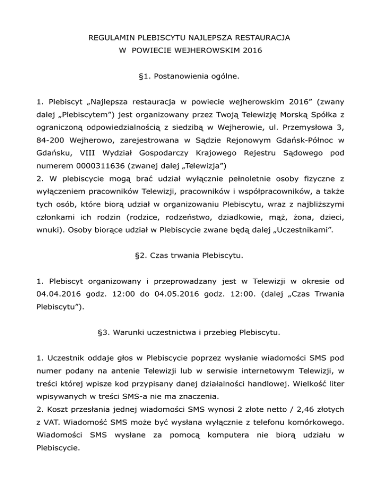 REGULAMIN PLEBISCYTU NAJLEPSZA RESTAURACJA W POWIECIE WEJHEROWSKIM 2016 §1. Postanowienia ogólne. 1. Plebiscyt „Najlepsza restauracja w powiecie wejherowskim 2016” (zwany dalej „Plebiscytem”) jest organizowany przez Twoją Telewizję Morską Spółka z ograniczoną odpowiedzialnością z siedzibą w Wejherowie, ul. Przemysłowa 3, 84-200 Wejherowo, zarejestrowana w Sądzie Rejonowym Gdańsk-Północ w Gdańsku, VIII Wydział Gospodarczy Krajowego Rejestru Sądowego pod numerem 0000311636 (zwanej dalej „Telewizja”) 2. W plebiscycie mogą brać udział wyłącznie pełnoletnie osoby fizyczne z wyłączeniem pracowników Telewizji, pracowników i współpracowników, a także tych osób, które biorą udział w organizowaniu Plebiscytu, wraz z najbliższymi członkami ich rodzin (rodzice, rodzeństwo, dziadkowie, mąż, żona, dzieci, wnuki). Osoby biorące udział w Plebiscycie zwane będą dalej „Uczestnikami”. §2. Czas trwania Plebiscytu. 1. Plebiscyt organizowany i przeprowadzany jest w Telewizji w okresie od 04.04.2016 godz. 12:00 do 04.05.2016 godz. 12:00. (dalej „Czas Trwania Plebiscytu”). §3. Warunki uczestnictwa i przebieg Plebiscytu. 1. Uczestnik oddaje głos w Plebiscycie poprzez wysłanie wiadomości SMS pod numer podany na antenie Telewizji lub w serwisie internetowym Telewizji, w treści której wpisze kod przypisany danej działalności handlowej. Wielkość liter wpisywanych w treści SMS-a nie ma znaczenia. 2. Koszt przesłania jednej wiadomości SMS wynosi 2 złote netto / 2,46 złotych z VAT. Wiadomość SMS może być wysłana wyłącznie z telefonu komórkowego. Wiadomości SMS wysłane za Plebiscycie. pomocą komputera nie biorą udziału w 3. Głosy są przyjmowane i rejestrowane przez automatyczny system zgłoszeń, który określa czas odbioru Wiadomości SMS, mierzony według zegara Telewizji. 4. Dane zarejestrowane przez automatyczny system zgłoszeń są rozstrzygające dla ustalenia prawa uczestnictwa w Plebiscycie. Wyniki Plebiscytu będą prezentowane na antenie Telewizji, stronie internetowej Telewizji i mogą być przekazane innym podmiotom w celu publikacji wyników Plebiscytu, a w szczególności portal nadmorski24.pl oraz radio Norda FM. Podczas trwania Plebiscytu, wyniki będą prezentowane w sposób interaktywny – tj. będą uwzględniały bieżący procentowy rozkład oddanych głosów w Plebiscycie w kolejności od największej do najmniejszej liczby. 5. Lokal, który uzbiera najwięcej głosów otrzyma tytuł zwycięzcy i dyplom. Informacja dot. rozstrzygnięcia plebiscytu zostanie przygotowana z udziałem właściciela zwycięskiego lokalu lub jego przedstawiciela. Informacja pojawi się w Serwisie Informacyjnym TTM, programie radia Norda FM i na łamach portalu Nadmorski24.pl. §4. Postanowienia końcowe. 1. Administratorem danych osobowych udostępnianych przez Uczestników Plebiscytu jest Telewizja. Uczestnik Plebiscytu wyraża zgodę na przetwarzanie jego danych osobowych w postaci numeru telefonu przez Telewizję dla celów organizacji Plebiscytu. Uczestnik może w każdej chwili uzyskać dostęp do swoich danych osobowych i żądać ich poprawienia, zmiany lub usunięcia. Oddając głos w Plebiscycie i biorąc w nim udział Uczestnik, potwierdza, że wyraża zgodę na zasady Plebiscytu zawarte w niniejszym Regulaminie. Podanie danych jest dobrowolne, lecz ich brak uniemożliwia wzięcie udziału w Plebiscycie. 2. Wszelkie reklamacje w związku z Plebiscytem należy zgłaszać do Telewizji na jej adres Siedziby na piśmie wraz z opisem reklamacji i jej szczegółowym uzasadnieniem w terminie nie dłuższym niż 7 dni od daty zaistnienia podstawy reklamacji, pod rygorem wygaśnięcia roszczeń takiego Uczestnika związanych z jego udziałem w Plebiscycie, a w każdym razie nie później niż w terminie 7 dni od dnia zakończenia Plebiscytu, albo w terminie 7 dni od dnia otrzymania odpowiedzi na reklamację, jeżeli została ona zgłoszona w terminie. 3. Telewizja nie ponosi odpowiedzialności za skuteczność dostarczenia wiadomości SMS. Głosy SMS-owe nie spełniające wymogów określonych w Regulaminie, w szczególności niepełne, przerwane, zawieszone, zniekształcone, nienależytej jakości lub o złych innych parametrach technicznych w stopniu uniemożliwiającym lub utrudniającym jego czytelność lub możliwość weryfikacji umieszczonych na nim danych są nieważne i zostaną wykluczone z Plebiscytu. 4. Operatorzy GSM odpowiadają jedynie za usługi telekomunikacyjne umożliwiające realizację Plebiscytu. Upusty cenowe dla grup abonentów na opłaty abonamentowe oraz usługi dodatkowe nie mają zastosowania. 5. Oddając głos w Plebiscycie i biorąc w nim udział uczestnik podporządkowuje się postanowieniom Regulaminu Plebiscytu i wyraża zgodę na jego treść. 6. Regulamin Plebiscytu jest dostępny dla uczestników w Siedzibie Telewizji oraz na stronie internetowej Telewizji. 8. Postanowienia Regulaminu są wyłączną podstawą prowadzenia Plebiscytu.