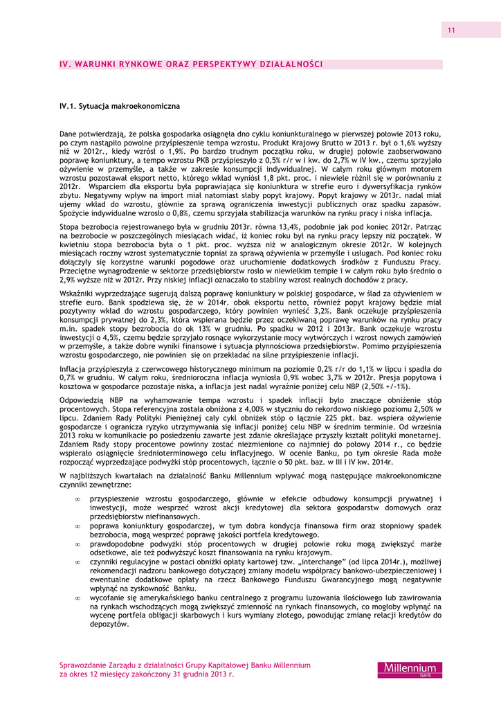 11 IV. WARUNKI RYNKOWE ORAZ PERSPEKTYWY DZIAŁALNOŚCI IV.1. Sytuacja makroekonomiczna Dane potwierdzają, że polska gospodarka osiągnęła dno cyklu koniunkturalnego w pierwszej połowie 2013 roku, po czym nastąpiło powolne przyśpieszenie tempa wzrostu. Produkt Krajowy Brutto w 2013 r. był o 1,6% wyższy niż w 2012r., kiedy wzrósł o 1,9%. Po bardzo trudnym początku roku, w drugiej połowie zaobserwowano poprawę koniunktury, a tempo wzrostu PKB przyśpieszyło z 0,5% r/r w I kw. do 2,7% w IV kw., czemu sprzyjało ożywienie w przemyśle, a także w zakresie konsumpcji indywidualnej. W całym roku głównym motorem wzrostu pozostawał eksport netto, którego wkład wyniósł 1,8 pkt. proc. i niewiele różnił się w porównaniu z 2012r. Wsparciem dla eksportu była poprawiająca się koniunktura w strefie euro i dywersyfikacja rynków zbytu. Negatywny wpływ na import miał natomiast słaby popyt krajowy. Popyt krajowy w 2013r. nadal miał ujemy wkład do wzrostu, głównie za sprawą ograniczenia inwestycji publicznych oraz spadku zapasów. Spożycie indywidualne wzrosło o 0,8%, czemu sprzyjała stabilizacja warunków na rynku pracy i niska inflacja. Stopa bezrobocia rejestrowanego była w grudniu 2013r. równa 13,4%, podobnie jak pod koniec 2012r. Patrząc na bezrobocie w poszczególnych miesiącach widać, iż koniec roku był na rynku pracy lepszy niż początek. W kwietniu stopa bezrobocia była o 1 pkt. proc. wyższa niż w analogicznym okresie 2012r. W kolejnych miesiącach roczny wzrost systematycznie topniał za sprawą ożywienia w przemyśle i usługach. Pod koniec roku dołączyły się korzystne warunki pogodowe oraz uruchomienie dodatkowych środków z Funduszu Pracy. Przeciętne wynagrodzenie w sektorze przedsiębiorstw rosło w niewielkim tempie i w całym roku było średnio o 2,9% wyższe niż w 2012r. Przy niskiej inflacji oznaczało to stabilny wzrost realnych dochodów z pracy. Wskaźniki wyprzedzające sugerują dalszą poprawę koniunktury w polskiej gospodarce, w ślad za ożywieniem w strefie euro. Bank spodziewa się, że w 2014r. obok eksportu netto, również popyt krajowy będzie miał pozytywny wkład do wzrostu gospodarczego, który powinien wynieść 3,2%. Bank oczekuje przyśpieszenia konsumpcji prywatnej do 2,3%, która wspierana będzie przez oczekiwaną poprawę warunków na rynku pracy m.in. spadek stopy bezrobocia do ok 13% w grudniu. Po spadku w 2012 i 2013r. Bank oczekuje wzrostu inwestycji o 4,5%, czemu będzie sprzyjało rosnące wykorzystanie mocy wytwórczych i wzrost nowych zamówień w przemyśle, a także dobre wyniki finansowe i sytuacja płynnościowa przedsiębiorstw. Pomimo przyśpieszenia wzrostu gospodarczego, nie powinien się on przekładać na silne przyśpieszenie inflacji. Inflacja przyśpieszyła z czerwcowego historycznego minimum na poziomie 0,2% r/r do 1,1% w lipcu i spadła do 0,7% w grudniu. W całym roku, średnioroczna inflacja wyniosła 0,9% wobec 3,7% w 2012r. Presja popytowa i kosztowa w gospodarce pozostaje niska, a inflacja jest nadal wyraźnie poniżej celu NBP (2,50% +/-1%). Odpowiedzią NBP na wyhamowanie tempa wzrostu i spadek inflacji było znaczące obniżenie stóp procentowych. Stopa referencyjna została obniżona z 4,00% w styczniu do rekordowo niskiego poziomu 2,50% w lipcu. Zdaniem Rady Polityki Pieniężnej cały cykl obniżek stóp o łącznie 225 pkt. baz. wspiera ożywienie gospodarcze i ogranicza ryzyko utrzymywania się inflacji poniżej celu NBP w średnim terminie. Od września 2013 roku w komunikacie po posiedzeniu zawarte jest zdanie określające przyszły kształt polityki monetarnej. Zdaniem Rady stopy procentowe powinny zostać niezmienione co najmniej do połowy 2014 r., co będzie wspierało osiągnięcie średnioterminowego celu inflacyjnego. W ocenie Banku, po tym okresie Rada może rozpocząć wyprzedzające podwyżki stóp procentowych, łącznie o 50 pkt. baz. w III i IV kw. 2014r. W najbliższych kwartałach na działalność Banku Millennium wpływać mogą następujące makroekonomiczne czynniki zewnętrzne: • • • • • przyspieszenie wzrostu gospodarczego, głównie w efekcie odbudowy konsumpcji prywatnej i inwestycji, może wesprzeć wzrost akcji kredytowej dla sektora gospodarstw domowych oraz przedsiębiorstw niefinansowych. poprawa koniunktury gospodarczej, w tym dobra kondycja finansowa firm oraz stopniowy spadek bezrobocia, mogą wesprzeć poprawę jakości portfela kredytowego. prawdopodobne podwyżki stóp procentowych w drugiej połowie roku mogą zwiększyć marże odsetkowe, ale też podwyższyć koszt finansowania na rynku krajowym. czynniki regulacyjne w postaci obniżki opłaty kartowej tzw. „interchange” (od lipca 2014r.), możliwej rekomendacji nadzoru bankowego dotyczącej zmiany modelu współpracy bankowo-ubezpieczeniowej i ewentualne dodatkowe opłaty na rzecz Bankowego Funduszu Gwarancyjnego mogą negatywnie wpłynąć na zyskowność Banku. wycofanie się amerykańskiego banku centralnego z programu luzowania ilościowego lub zawirowania na rynkach wschodzących mogą zwiększyć zmienność na rynkach finansowych, co mogłoby wpłynąć na wycenę portfela obligacji skarbowych i kurs wymiany złotego, powodując zmianę relacji kredytów do depozytów. Sprawozdanie Zarządu z działalności Grupy Kapitałowej Banku Millennium za okres 12 miesięcy zakończony 31 grudnia 2013 r. 12 IV.2. Polski sektor bankowy i pozycja Grupy Banku Millennium Rok 2013 przyniósł trudne warunki makroekonomiczne dla polskiego sektora bankowego. Wynikało to nie tylko z niskiego wzrostu gospodarczego w pierwszej połowie roku, ale w szczególności z najniższego w historii poziomu stóp procentowych. Mimo tego polskie banki osiągnęły relatywnie dobre wyniki. Według danych KNF, w 2013 r. zysk netto wszystkich banków obniżył się nieco o 0,3% w stosunku do roku 2012, głównie ze względu wynik z pozycji odsetek, który w skali roku obniżył się o 