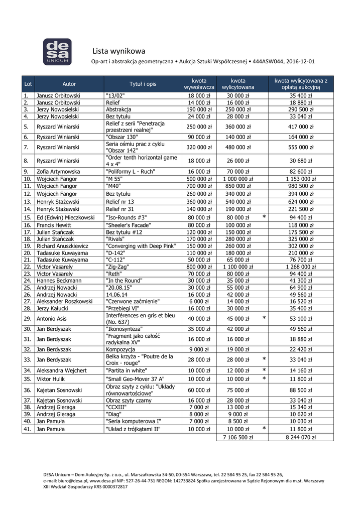 Lista wynikowa Op-art i abstrakcja geometryczna • Aukcja Sztuki Współczesnej • 444ASW044, 2016-12-01 Lot Autor 1. 2. 3. 4. Janusz Orbitowski Janusz Orbitowski Jerzy Nowosielski Jerzy Nowosielski 5. Ryszard Winiarski 6. Ryszard Winiarski 7. Ryszard Winiarski 8. Ryszard Winiarski 9. 10. 11. 12. 13. 14. Zofia Artymowska Wojciech Fangor Wojciech Fangor Wojciech Fangor Henryk Stażewski Henryk Stażewski 15. 16. 17. 18. 19. 20. 21. 22. 23. 24. 25. 26. 27. 28. Ed (Edwin) Mieczkowski Francis Hewitt Julian Stańczak Julian Stańczak Richard Anuszkiewicz Tadasuke Kuwayama Tadasuke Kuwayama Victor Vasarely Victor Vasarely Hannes Beckmann Andrzej Nowacki Andrzej Nowacki Aleksander Roszkowski Jerzy Kałucki 29. Antonio Asis 30. Jan Berdyszak 31. Jan Berdyszak 32. Jan Berdyszak 33. Jan Berdyszak 34. Aleksandra Wejchert 35. Viktor Hulik 36. Kajetan Sosnowski 37. 38. 39. 40. 41. Kajetan Sosnowski Andrzej Gieraga Andrzej Gieraga Jan Pamuła Jan Pamuła kwota wywoławcza kwota wylicytowana kwota wylicytowana z opłatą aukcyjną "13/02" Relief Abstrakcja Bez tytułu Relief z serii "Penetracja przestrzeni realnej" "Obszar 130" Seria ośmiu prac z cyklu "Obszar 142" "Order tenth horizontal game 4 x 4" "Poliformy L - Ruch" "M 55" "M40" Bez tytułu Relief nr 13 Relief nr 31 18 000 zł 14 000 zł 190 000 zł 24 000 zł 30 000 zł 16 000 zł 250 000 zł 28 000 zł 35 400 zł 18 880 zł 290 500 zł 33 040 zł 250 000 zł 360 000 zł 417 000 zł 90 000 zł 140 000 zł 164 000 zł 320 000 zł 480 000 zł 555 000 zł 18 000 zł 26 000 zł 30 680 zł 16 000 zł 500 000 zł 700 000 zł 260 000 zł 360 000 zł 140 000 zł 70 000 zł 1 000 000 zł 850 000 zł 340 000 zł 540 000 zł 190 000 zł 82 600 zł 1 153 000 zł 980 500 zł 394 000 zł 624 000 zł 221 500 zł "Iso-Rounds #3" "Sheeler's Facade" Bez tytułu #12 "Rivals" "Converging with Deep Pink" "D-142" "C-112" "Zig-Zag" "Reth" "In the Round" "20.08.15" 14.06.14 "Czerwone zaćmienie" "Przebiegi VI" Interférences en gris et bleu (No. 637) "Ikonosynteza" "Fragment jako całość radykalna XV" Kompozycja Belka krzyża - "Poutre de la Croix - rouge" "Partita in white" 80 000 zł 80 000 zł 120 000 zł 170 000 zł 150 000 zł 110 000 zł 50 000 zł 800 000 zł 70 000 zł 30 000 zł 30 000 zł 16 000 zł 6 000 zł 16 000 zł 80 000 zł 100 000 zł 150 000 zł 280 000 zł 260 000 zł 180 000 zł 65 000 zł 1 100 000 zł 80 000 zł 35 000 zł 55 000 zł 42 000 zł 14 000 zł 30 000 zł * 94 400 zł 118 000 zł 175 500 zł 325 000 zł 302 000 zł 210 000 zł 76 700 zł 1 268 000 zł 94 400 zł 41 300 zł 64 900 zł 49 560 zł 16 520 zł 35 400 zł 40 000 zł 45 000 zł * 53 100 zł 35 000 zł 42 000 zł 49 560 zł 16 000 zł 16 000 zł 18 880 zł 9 000 zł 19 000 zł 22 420 zł 28 000 zł 28 000 zł * 33 040 zł 10 000 zł 12 000 zł 14 160 zł "Small Geo-Mover 37 A" Obraz szyty z cyklu: "Układy równowartościowe" Obraz szyty czarny "CCXIII" "Diag" "Seria komputerowa I" "Układ z trójkątami II" 10 000 zł 10 000 zł * * 60 000 zł 75 000 zł 88 500 zł 16 000 zł 7 000 zł 8 000 zł 7 000 zł 10 000 zł 28 000 zł 13 000 zł 9 000 zł 8 500 zł 10 000 zł 33 15 10 10 11 Tytuł i opis 7 106 500 zł * 11 800 zł 040 340 620 030 800 zł zł zł zł zł 8 244 070 zł DESA Unicum – Dom Aukcyjny Sp. z o.o., ul. Marszałkowska 34-50, 00-554 Warszawa, tel. 22 584 95 25, fax 22 584 95 26, e-mail: [email protected], www.desa.pl NIP: 527-26-44-731 REGON: 142733824 Spółka zarejestrowana w Sądzie Rejonowym dla m.st. Warszawy XIII Wydział Gospodarczy KRS 0000372817