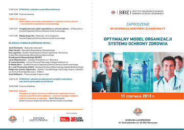12:30-12:45 Ù1+#-+"ÖÄRÄM<RA9Ŷ=EÄM;R=KLFACĨOÄCGF>=J=F;BA Ä (JR=JO9ÄC9OGO9 Ä +=KB9Ä!!Ä Ä Ä Ä Ä *GD9ÄAÄR9<9FA9ÄK9EGJRĹ<MÄOGB=OĨ<RLO9ÄOÄKQKL=EA=ÄG;@JGFQÄR<JGOA9Ä Ä Ä Ä Ä ]ÄF9ÄHJRQCŶ9<RA=ÄOGB=OĨ<RLO9ÄE9RGOA=;CA=?G 13:00-13:15 0RZEGLļDÀOBECNYCHÀZADAŻÀWOJEWīDZTWAÀWÀOCHRONIEÀZDROWIA - dr Maciej Dercz, À À À À )NSTYTUTÀ/RGANIZACJIÀ/CHRONYÀ:DROWIAÀ5CZELNIÀŸAZARSKIEGO 13:15-14:00 $EBATAÀEKSPERCKA - Moderator: Jerzy Gryglewicz, À À À À )NSTYTUTÀ/RGANIZACJIÀ/CHRONYÀ:DROWIAÀ5CZELNIÀŸAZARSKIEGO ZAPROSZENIE &ÖÄÚ#+(Ú*Ø#ĸÄ#'&ÛÚ*Ú&Ø"ŌÄ&Ö-#'/ĸÄ(, '(,1%Ö$&1Ä%'ÙÚ$Ä'*ÜÖ&!2ÖØ"!Ä +1+,Ú%-Ä'Ø *'&1Ä2Ù*'/!Ö Ù'Ä-Ù2!Öŵ-Ä/ÄÙÚ×ÖØ!ÚÄ2Ö(*'+2Ú&!Ä2'+,Ö$! *ACEKÀ+OZŹOWSKIÀÀ7OJEWODAÀMAZOWIECKI !DAMÀ3TRUZIKÀÀ-ARSZAŹEKÀ7OJEWīDZTWAÀÀ-AZOWIECKIEGO %WAÀŸAGOŻSKAÀÀ$YREKTORÀ$EPARTAMENTUÀ0OLITYKIÀ3POŹECZNEJÀIÀ:DROWOTNEJÀ 5RZŐDUÀ-ARSZAŹKOWSKIEGOÀ7OJEWīDZTWAÀ-AZOWIECKIEGO 0RZEDSTAWICIELÀ-AZOWIECKIEGOÀ/7À.&: *ACEKÀ7OJCIECHOWICZÀÀ:ASTŐPCAÀ0REZYDENTAÀMSTÀ7ARSZAWY $RÀ)WONAÀ+OWALSKAÀÀ)NSTYTUTÀ:DROWIAÀ0UBLICZNEGOÀ#OLLEGIUMÀ-EDICUMÀ5* $RÀ-ACIEJÀ$ERCZÀÀÀ$YREKTORÀ)NSTYTUTUÀ/RGANIZACJIÀ/CHRONYÀ:DROWIAÀ5CZELNIÀŸAZARSKIEGO $RÀNÀMEDÀ0RZEMYSŹAWÀ3IELICKIÀÀ:ASTŐPCAÀ$YREKTORAÀ-AZOWIECKIEGOÀ3ZPITALAÀ"RīDNOWSKIEGO -AŹGORZATAÀ:AŹAWA$ļBROWSKAÀ À$YREKTORÀ3AMODZIELNEGOÀ0UBLICZNEGOÀ:ESPOŹUÀ:AKŹADīWÀ ,ECZNICTWAÀ/TWARTEGOÀ7ARSZAWAÀÀƭOLIBORZ !NNAÀ2ULKIEWICZÀ À0REZESÀZARZļDUÀ'RUPAÀ,UXÀ-ED 14:00-14:30 Ù1+#-+"ÖÄRÄM<RA9Ŷ=EÄHJR=<KL9OA;A=DAÄR9JRĹ<ĨOÄOGB=OĨ<RLOÄ Ä Ä Ä Ä GJ9RÄAFFQ;@ÄK9EGJRĹ<ĨOÄL=JQLGJA9DFQ;@ Ä (JR=JO9ÄG:A9<GO9 Ä Ä Ä Ä Ä Ä Ä Ä Ä Ä Ä Ä Ä À À À À +=KB9Ä!!!Ä &9JRō<RA9ÄR9JRĹ<;R=ÄCDM;RGO=ÄOÄ=>=CLQOF=BÄGJ?9FAR9;BAÄG;@JGFQÄ R<JGOA9ÄF9ÄHGRAGEA=ÄK9EGJRĹ<GOQEÄ]ÄO9JKRL9LÄMC9RMBĹ;QÄF9BD=HKR=Ä HJ9CLQCAÄKLGKGO9F=ÄOÄJ=?AGF9;@ÄÄÄ-AREKÀ7ESOŹOWSKIÀ EKSPERTÀ)NSTYTUTUÀ/RGANIZACJIÀ/CHRONYÀ:DROWIAÀ5CZELNIÀŸAZARSKIEGO Ä;R=JO;9ÄÄJÄ 0ATRONÀMEDIALNY 5#:%,.)!ÀŸ!:!23+)%'/ 5LÀƏWIERADOWSKAÀÀÀ7ARSZAWA 3ZANOWNI0AŶSTWO 3ERDECZNIEÀZAPRASZAMYÀNAÀ%KSPERCKļÀ+ONFERENCJŐÀ.AUKOWļÀPTÀÇ'HLQE9DFQÄEG<=DÄ GJ?9FAR9;BAÄKQKL=EMÄG;@JGFQÄR<JGOA9a /CHRONAÀ ZDROWIAÀ TOÀSEKTORÀ OÀ STRATEGICZNYMÀ ZNACZENIUÀ DLAÀ ROZWOJUÀ GOSPODARCZEGOÀ IÀSPOŹECZNEGOÀPAŻSTWAÀ*EGOÀSPRAWNOƐľÀJESTÀMIARļÀNOWOCZESNOƐCIÀKRAJUÀIÀSPOŹECZEŻSTWAÀ4YMCZASEMÀTRWAJļCYÀODÀWIELUÀLATÀPROCESÀREFORMOWANIAÀPOLSKIEJÀOCHRONYÀZDROWIAÀ NIEÀPRZYNIīSŹÀOCZEKIWANYCHÀROZWIļZAŻÀSYSTEMOWYCHÀIÀWCIļƮÀSTANOWIÀJEDENÀZÀNAJBARDZIEJÀƮARLIWYCHÀIÀEMOCJONUJļCYCHÀWļTKīWÀWÀDEBACIEÀPUBLICZNEJÀ/DÀZAPOWIEDZIANYCHÀ PRZEZÀ-:ÀKOLEJNYCHÀZMIANÀLEGISLACYJNYCHÀOCZEKUJEÀSIŐÀCZYTELNYCHÀSPīJNYCHÀIÀPRECYZYJNYCHÀ ROZWIļZAŻÀ ORGANIZACYJNOPRAWNYCHÀ KTīREÀ WYNIKAŹYBYÀ ZÀ DOCELOWEGOÀ MODELUÀ SYSTEMUÀOCHRONYÀZDROWIAÀWÀ0OLSCEÀ0ROBLEMEMÀJESTÀJEDNAKÀBRAKÀJEDNOZNACZNIEÀZDE˰NIOWANYCHÀRAMÀDOCELOWEGOÀMODELU 2Ö(*Ö+2ÖÄ&ÖÄÚ#+(Ú*Ø#ĸÄ#'&ÛÚ*Ú&Ø"ŌÄ&Ö-#'/ĸ '(,1%Ö$&1Ä%'ÙÚ$Ä'*ÜÖ&!2ÖØ"!Ä+1+,Ú%-Ä'Ø *'&1Ä2Ù*'/!Ö Ä;R=JO;9ÄÄJÄ-;R=DFA9Äŵ9R9JKCA=?GÄ9MD9Ä Ä +=KB9ÄOHJGO9<R9BĹ;9 10:00-10:30 $WAÀLATAÀPOÀWEJƐCIUÀWÀƮYCIEÀUSTAWYÀOÀDZIAŹALNOƐCIÀLECZNICZEJÀ ÀPREZENTACJAÀ À À À À 2APORTUÀ07#À5CZELNIÀŸAZARSKIEGOÀ+ANCELARIIÀ$:0 10:30-10:45 DYSKUSJA 2EALIZUJļCÀMISJŐÀOƐRODKAÀNAUKOWEGOÀIÀEKSPERCKIEGOÀZAPRASZAMYÀDOÀWZIŐCIAÀUDZIAŹUÀ WÀDYSKUSJIÀNADÀDOCELOWļÀIÀCAŹOƐCIOWļÀWIZJļÀREORGANIZACJIÀSYSTEMUÀOCHRONYÀZDROWIAÀ ZEÀWSKAZANIEMÀPRECYZYJNEGOÀPODZIAŹUÀRīLÀIÀZADAŻÀPOSZCZEGīLNYCHÀJEGOÀUCZESTNIKīWÀ ZGODNIEÀZÀZASADAMIÀPOMOCNICZOƐCIÀIÀDECENTRALIZACJI *ESTEƐMYÀPRZEKONANIÀIƮÀINTEGRUJļCÀKOMPETENCJEÀƐRODOWISKAÀAKADEMICKIEGOÀZÀWIEDZļÀ EKSPERTīWÀSAMORZļDOWCīWÀORAZÀPRAKTYKīWÀRYNKUÀZDROWIAÀMOƮLIWEÀJESTÀWYPRACOWANIEÀ NAJLEPSZYCHÀ ROZWIļZAŻÀ +ONFERENCJAÀ JESTÀ ADRESOWANAÀ DOÀZARZļDīWÀ SAMORZļDīWÀ WOJEWīDZKICHÀ PRZEDSTAWICIELIÀ INNYCHÀ SZCZEBLIÀ SAMORZļDīWÀ TERYTORIALNYCHÀ KLUCZOWYCHÀINSTYTUCJIÀRYNKUÀZDROWIAÀORAZÀPODMIOTīWÀZAINTERESOWANYCHÀTļÀTEMATYKļÀ5DZIAŹÀ WÀ KONFERENCJIÀ KTīRAÀ ODBŐDZIEÀ SIŐÀ NAÀNEUTRALNYMÀ AKADEMICKIMÀ FORUMÀ POTWIERDZILIÀ PRZEDSTAWICIELEÀ-:À.&:ÀZARZļDīWÀWOJEWīDZTWÀSAMORZļDUÀTERYTORIALNEGOÀƐWIADCZENIODAWCYÀIÀREPREZENTANCIÀORGANIZACJIÀPACJENCKICH Ä +=KB9Ä!Ä Ä Ä Ä Ä +QKL=EÄG;@JGFQÄR<JGOA9ÄÄÄÄ;=D=ÄKLJ9L=?A;RF=ÄAÄB=?GÄGJ?9FAR9;B9ÄÄH=JKH=CLQO9Ä Ä Ä Ä Ä H9ŸKLO9ÄOŶ9<RÄJ=?AGF9DFQ;@ÄHŶ9LFAC9ÄƍOA9<;R=FAG<9O;ĨOÄH9;B=FL9 10:45-11:00 /ÀREFORMOWANIUÀSYSTEMUÀOCHRONYÀZDROWIAÀ ÀCZYÀTOÀJUƮÀKONIECÀREFORMYÀ À À À À CZYÀSZANSAÀƮEÀTAÀPRAWDZIWAÀWÀKOŻCUÀNASTļPIÀ ÀPROFÀDRÀHABÀ#EZARYÀ7ŹODARCZYKÀ À À À À )NSTYTUTÀ:DROWIAÀ0UBLICZNEGOÀ#OLLEGIUMÀ-EDICUMÀ5* 11:00-11:15 À À À À +IERUNKIÀREFORMYÀSYSTEMUÀOCHRONYÀZDROWIAÀÀ À3ŹAWOMIRÀ.EUMANNÀ 0ODSEKRETARZÀ3TANUÀWÀ-INISTERSTWIEÀ:DROWIA 11:15-11:30 3AMORZļDOWYÀMODELÀORGANIZACJIÀSYSTEMUÀ ÀZAÀIÀPRZECIW - dr Maciej Dercz, À À À ÀÀ )NSTYTUTÀ/RGANIZACJIÀ/CHRONYÀ:DROWIAÀ5CZELNIÀŸAZARSKIEGO 11:30-12:30 $EBATAÀEKSPERCKAÀÀ-ODERATORÀDRÀ-AŹGORZATAÀ'AŹļZKA3OBOTKAÀ À À À À )NSTYTUTÀ/RGANIZACJIÀ/CHRONYÀ:DROWIAÀ5CZELNIÀŸAZARSKIEGOÀCZŹONEKÀ2ADYÀ.&: 'WARANTUJEMYÀMERYTORYCZNļÀEKSPERCKļÀDEBATŐ ,ICZYMYÀNAÀ0AŻSTWAÀAKTYWNYÀUDZIAŹ $OÀZOBACZENIA À À À À À À À À À À $RÀ-AŹGORZATAÀ'AŹļZKA3OBOTKA Instytut Organizacji Ochrony Zdrowia 5CZELNIAÀŸAZARSKIEGO Ù'Ä-Ù2!Öŵ-Ä/ÄÙÚ×ÖØ!ÚÄ2Ö(*'+2Ú&!Ä2'+,Ö$! 3ŹAWOMIRÀ.EUMANNÀÀ3EKRETARZÀ3TANUÀWÀ-INISTERSTWIEÀ:DROWIAÀ !GNIESZKAÀ0ACHCIARZÀÀ0REZESÀ.&:À "EATAÀ,IBERA-AŹECKAÀ À0OSEŹÀNAÀ3EJMÀ2ZECZYPOSPOLITEJÀ0OLSKIEJ !DAMÀ3TRUZIKÀ À-ARSZAŹEKÀ7OJEWīDZTWAÀ-AZOWIEC