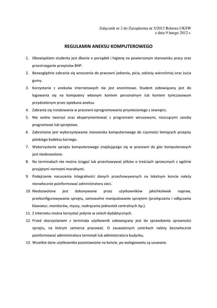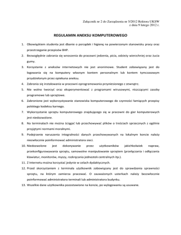 Załącznik nr 2 do Zarządzenia nr 5/2012 Rektora UKSW z dnia 9 lutego 2012 r. REGULAMIN ANEKSU KOMPUTEROWEGO 1. Obowiązkiem studenta jest dbanie o porządek i higienę na powierzonym stanowisku pracy oraz przestrzeganie przepisów BHP. 2. Bezwzględnie zabrania się wnoszenia do pracowni jedzenia, picia, odzieży wierzchniej oraz żucia gumy. 3. Korzystanie z aneksów internetowych nie jest anonimowe. Student zobowiązany jest do logowania się na komputery własnym kontem personalnym lub kontem tymczasowym przydzielonym przez opiekuna aneksu. 4. Zabrania się instalowania w pracowni oprogramowania przyniesionego z zewnątrz. 5. Nie wolno tworzyć oraz eksperymentować z programami wirusowymi, niszczącymi zasoby programowe lub sprzętowe. 6. Zabronione jest wykorzystywanie stanowiska komputerowego do czynności łamiących przepisy polskiego kodeksu karnego. 7. Wykorzystanie sprzętu komputerowego znajdującego się w pracowni do gier komputerowych jest niedozwolone. 8. Na terminalach nie można ściągać lub przechowywać plików o treściach sprzecznych z ogólnie przyjętymi normami moralnymi. 9. Podejrzenie naruszenia integralności danych przechowywanych na lokalnym koncie należy niezwłocznie poinformować administratora sieci. 10. Niedozwolone jest dokonywanie przez użytkowników jakichkolwiek napraw, przekonfigurowywania sprzętu, samowolne manipulowanie sprzętem (przełączania i odłączania klawiatur, monitorów, myszy, rozkręcania jednostek centralnych itp.). 11. Z Internetu można korzystać jedynie w celach dydaktycznych. 12. Przed skorzystaniem z terminala użytkownik zobowiązany jest do sprawdzenia sprawności sprzętu, na którym zamierza pracować. O zauważonych usterkach należy bezzwłocznie poinformować administratora terminali lub administratora budynku. 13. Wszelkie dane użytkownika pozostawione na koncie, po wylogowaniu są usuwane.