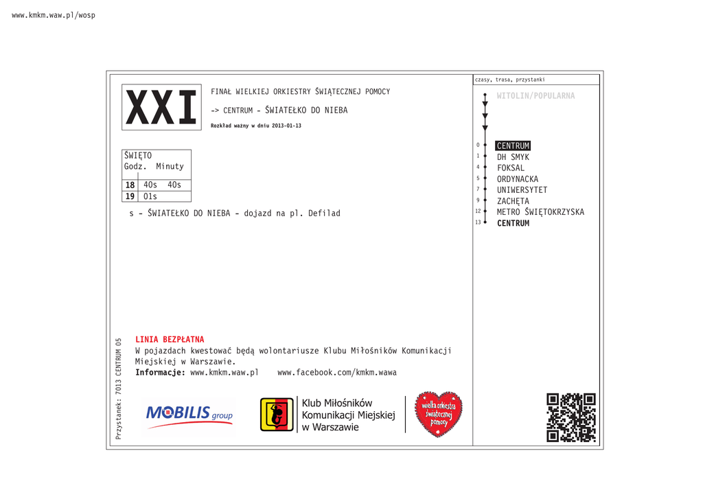 www.kmkm.waw.pl/wosp czasy, trasa, przystanki XXI FINAŁ WIELKIEJ ORKIESTRY ŚWIĄTECZNEJ POMOCY WITOLIN/POPULARNA . -> CENTRUM - ŚWIATEŁKO DO NIEBA . Rozkład ważny w dniu 2013-01-13 0 ŚWIĘTO Godz. Minuty 18 40s 19 01s 40s s - ŚWIATEŁKO DO NIEBA - dojazd na pl. Defilad 1 4 5 7 9 12 Przystanek: 7013 CENTRUM 05 13 LINIA BEZPŁATNA W pojazdach kwestować będą wolontariusze Klubu Miłośników Komunikacji Miejskiej w Warszawie. Informacje: www.kmkm.waw.pl www.facebook.com/kmkm.wawa CENTRUM DH SMYK FOKSAL ORDYNACKA UNIWERSYTET ZACHĘTA METRO ŚWIĘTOKRZYSKA CENTRUM www.kmkm.waw.pl/wosp czasy, trasa, przystanki XXI FINAŁ WIELKIEJ ORKIESTRY ŚWIĄTECZNEJ POMOCY -> CENTRUM - ŚWIATEŁKO DO NIEBA . Rozkład ważny w dniu 2013-01-13 ŚWIĘTO Godz. Minuty 18 41s 19 01s WITOLIN/POPULARNA . 41s s - ŚWIATEŁKO DO NIEBA - dojazd na pl. Defilad 0 3 4 6 8 11 Przystanek: 7033 DH SMYK 01 12 LINIA BEZPŁATNA W pojazdach kwestować będą wolontariusze Klubu Miłośników Komunikacji Miejskiej w Warszawie. Informacje: www.kmkm.waw.pl www.facebook.com/kmkm.wawa CENTRUM DH SMYK FOKSAL ORDYNACKA UNIWERSYTET ZACHĘTA METRO ŚWIĘTOKRZYSKA CENTRUM www.kmkm.waw.pl/wosp czasy, trasa, przystanki XXI FINAŁ WIELKIEJ ORKIESTRY ŚWIĄTECZNEJ POMOCY -> CENTRUM - ŚWIATEŁKO DO NIEBA . Rozkład ważny w dniu 2013-01-13 ŚWIĘTO Godz. Minuty 18 44s 19 04s WITOLIN/POPULARNA . 44s s - ŚWIATEŁKO DO NIEBA - dojazd na pl. Defilad 0 1 3 5 8 Przystanek: 7042 FOKSAL 02 9 LINIA BEZPŁATNA W pojazdach kwestować będą wolontariusze Klubu Miłośników Komunikacji Miejskiej w Warszawie. Informacje: www.kmkm.waw.pl www.facebook.com/kmkm.wawa CENTRUM DH SMYK FOKSAL ORDYNACKA UNIWERSYTET ZACHĘTA METRO ŚWIĘTOKRZYSKA CENTRUM www.kmkm.waw.pl/wosp czasy, trasa, przystanki XXI FINAŁ WIELKIEJ ORKIESTRY ŚWIĄTECZNEJ POMOCY WITOLIN/POPULARNA . -> CENTRUM - ŚWIATEŁKO DO NIEBA . Rozkład ważny w dniu 2013-01-13 ŚWIĘTO Godz. Minuty 18 45s 19 05s 45s s - ŚWIATEŁKO DO NIEBA - dojazd na pl. Defilad 0 2 4 7 Przystanek: 7049 ORDYNACKA 02 8 LINIA BEZPŁATNA W pojazdach kwestować będą wolontariusze Klubu Miłośników Komunikacji Miejskiej w Warszawie. Informacje: www.kmkm.waw.pl www.facebook.com/kmkm.wawa CENTRUM DH SMYK FOKSAL ORDYNACKA UNIWERSYTET ZACHĘTA METRO ŚWIĘTOKRZYSKA CENTRUM www.kmkm.waw.pl/wosp czasy, trasa, przystanki XXI FINAŁ WIELKIEJ ORKIESTRY ŚWIĄTECZNEJ POMOCY WITOLIN/POPULARNA . -> CENTRUM - ŚWIATEŁKO DO NIEBA . Rozkład ważny w dniu 2013-01-13 ŚWIĘTO Godz. Minuty 18 47s 19 07s 47s s - ŚWIATEŁKO DO NIEBA - dojazd na pl. Defilad 0 2 5 Przystanek: 7044 UNIWERSYTET 02 6 LINIA BEZPŁATNA W pojazdach kwestować będą wolontariusze Klubu Miłośników Komunikacji Miejskiej w Warszawie. Informacje: www.kmkm.waw.pl www.facebook.com/kmkm.wawa CENTRUM DH SMYK FOKSAL ORDYNACKA UNIWERSYTET ZACHĘTA METRO ŚWIĘTOKRZYSKA CENTRUM www.kmkm.waw.pl/wosp czasy, trasa, przystanki XXI FINAŁ WIELKIEJ ORKIESTRY ŚWIĄTECZNEJ POMOCY WITOLIN/POPULARNA . -> CENTRUM - ŚWIATEŁKO DO NIEBA . Rozkład ważny w dniu 2013-01-13 ŚWIĘTO Godz. Minuty 18 49s 19 09s 49s s - ŚWIATEŁKO DO NIEBA - dojazd na pl. Defilad 0 3 Przystanek: 7028 ZACHĘTA 02 4 LINIA BEZPŁATNA W pojazdach kwestować będą wolontariusze Klubu Miłośników Komunikacji Miejskiej w Warszawie. Informacje: www.kmkm.waw.pl www.facebook.com/kmkm.wawa CENTRUM DH SMYK FOKSAL ORDYNACKA UNIWERSYTET ZACHĘTA METRO ŚWIĘTOKRZYSKA CENTRUM www.kmkm.waw.pl/wosp czasy, trasa, przystanki XXI FINAŁ WIELKIEJ ORKIESTRY ŚWIĄTECZNEJ POMOCY WITOLIN/POPULARNA . -> CENTRUM - ŚWIATEŁKO DO NIEBA . Rozkład ważny w dniu 2013-01-13 ŚWIĘTO Godz. Minuty 18 52s 19 12s 52s s - ŚWIATEŁKO DO NIEBA - dojazd na pl. Defilad 0 Przystanek: 7014 METRO ŚWIĘTOKRZYSKA 01 1 LINIA BEZPŁATNA W pojazdach kwestować będą wolontariusze Klubu Miłośników Komunikacji Miejskiej w Warszawie. Informacje: www.kmkm.waw.pl www.facebook.com/kmkm.wawa CENTRUM DH SMYK FOKSAL ORDYNACKA UNIWERSYTET ZACHĘTA METRO ŚWIĘTOKRZYSKA CENTRUM