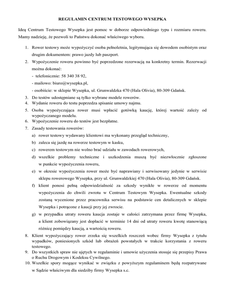 REGULAMIN CENTRUM TESTOWEGO WYSEPKA Ideą Centrum Testowego Wysepka jest pomoc w doborze odpowiedniego typu i rozmiaru roweru. Mamy nadzieję, że pozwoli to Państwu dokonać właściwego wyboru. 1. Rower testowy może wypożyczyć osoba pełnoletnia, legitymująca się dowodem osobistym oraz drugim dokumentem: prawo jazdy lub paszport. 2. Wypożyczenie roweru powinno być poprzedzone rezerwacją na konkretny termin. Rezerwacji można dokonać: - telefonicznie: 58 340 38 92, - mailowo: [email protected], - osobiście: w sklepie Wysepka, ul. Grunwaldzka 470 (Hala Olivia), 80-309 Gdańsk. 3. Do testów udostępniane są tylko wybrane modele rowerów. 4. Wydanie roweru do testu poprzedza spisanie umowy najmu. 5. Osoba wypożyczająca rower musi wpłacić gotówką kaucję, której wartość zależy od wypożyczanego modelu. 6. Wypożyczenie roweru do testów jest bezpłatne. 7. Zasady testowania rowerów: a) rower testowy wydawany klientowi ma wykonany przegląd techniczny, b) zaleca się jazdę na rowerze testowym w kasku, c) rowerem testowym nie wolno brać udziału w zawodach rowerowych, d) wszelkie problemy techniczne i uszkodzenia muszą być niezwłocznie zgłoszone w punkcie wypożyczenia roweru, e) w okresie wypożyczenia rower może być naprawiany i serwisowany jedynie w serwisie sklepu rowerowego Wysepka, przy ul. Grunwaldzkiej 470 (Hala Olivia), 80-309 Gdańsk. f) klient ponosi pełną odpowiedzialność za szkody wynikłe w rowerze od momentu wypożyczenia do chwili zwrotu w Centrum Testowym Wysepka. Ewentualne szkody zostaną wycenione przez pracownika serwisu na podstawie cen detalicznych w sklepie Wysepka i potrącone z kaucji przy jej zwrocie. g) w przypadku utraty roweru kaucja zostaje w całości zatrzymana przez firmę Wysepka, a klient zobowiązany jest dopłacić w terminie 14 dni od utraty roweru kwotę stanowiącą różnicę pomiędzy kaucją, a wartością roweru. 8. Klient wypożyczający rower zrzeka się wszelkich roszczeń wobec firmy Wysepka z tytułu wypadków, poniesionych szkód lub obrażeń powstałych w trakcie korzystania z roweru testowego. 9. Do wszystkich spraw nie ujętych w regulaminie i umowie użyczenia stosuje się przepisy Prawa o Ruchu Drogowym i Kodeksu Cywilnego. 10. Wszelkie spory mogące wynikać w związku z powyższym regulaminem będą rozpatrywane w Sądzie właściwym dla siedziby firmy Wysepka s.c.