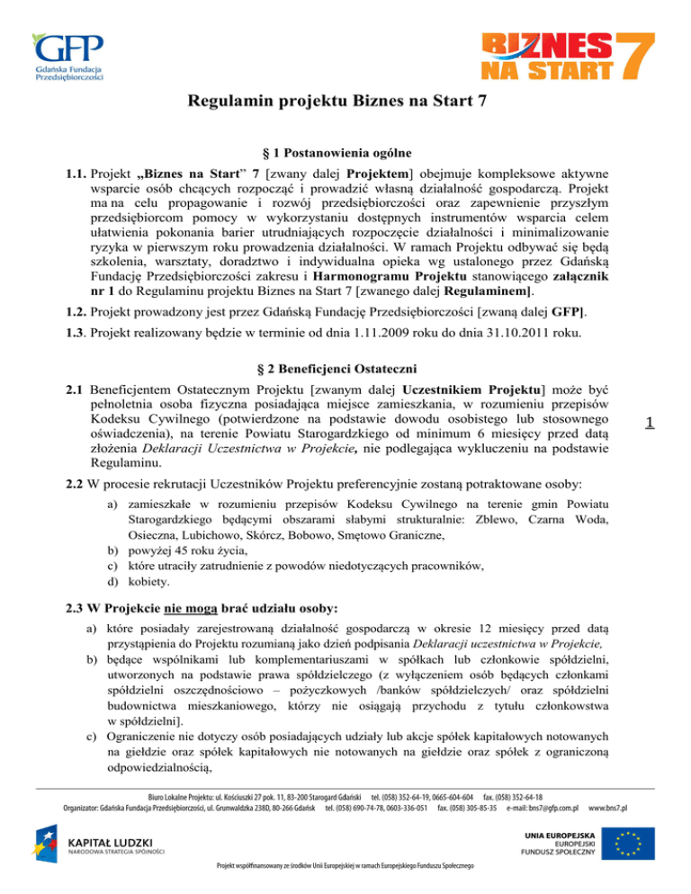 Regulamin projektu Biznes na Start 7 § 1 Postanowienia ogólne 1.1. Projekt „Biznes na Start” 7 [zwany dalej Projektem] obejmuje kompleksowe aktywne wsparcie osób chcących rozpocząć i prowadzić własną działalność gospodarczą. Projekt ma na celu propagowanie i rozwój przedsiębiorczości oraz zapewnienie przyszłym przedsiębiorcom pomocy w wykorzystaniu dostępnych instrumentów wsparcia celem ułatwienia pokonania barier utrudniających rozpoczęcie działalności i minimalizowanie ryzyka w pierwszym roku prowadzenia działalności. W ramach Projektu odbywać się będą szkolenia, warsztaty, doradztwo i indywidualna opieka wg ustalonego przez Gdańską Fundację Przedsiębiorczości zakresu i Harmonogramu Projektu stanowiącego załącznik nr 1 do Regulaminu projektu Biznes na Start 7 [zwanego dalej Regulaminem]. 1.2. Projekt prowadzony jest przez Gdańską Fundację Przedsiębiorczości [zwaną dalej GFP]. 1.3. Projekt realizowany będzie w terminie od dnia 1.11.2009 roku do dnia 31.10.2011 roku. § 2 Beneficjenci Ostateczni 2.1 Beneficjentem Ostatecznym Projektu [zwanym dalej Uczestnikiem Projektu] może być pełnoletnia osoba fizyczna posiadająca miejsce zamieszkania, w rozumieniu przepisów Kodeksu Cywilnego (potwierdzone na podstawie dowodu osobistego lub stosownego oświadczenia), na terenie Powiatu Starogardzkiego od minimum 6 miesięcy przed datą złożenia Deklaracji Uczestnictwa w Projekcie, nie podlegająca wykluczeniu na podstawie Regulaminu. 2.2 W procesie rekrutacji Uczestników Projektu preferencyjnie zostaną potraktowane osoby: a) zamieszkałe w rozumieniu przepisów Kodeksu Cywilnego na terenie gmin Powiatu Starogardzkiego będącymi obszarami słabymi strukturalnie: Zblewo, Czarna Woda, Osieczna, Lubichowo, Skórcz, Bobowo, Smętowo Graniczne, b) powyżej 45 roku życia, c) które utraciły zatrudnienie z powodów niedotyczących pracowników, d) kobiety. 2.3 W Projekcie nie mogą brać udziału osoby: a) które posiadały zarejestrowaną działalność gospodarczą w okresie 12 miesięcy przed datą przystąpienia do Projektu rozumianą jako dzień podpisania Deklaracji uczestnictwa w Projekcie, b) będące wspólnikami lub komplementariuszami w spółkach lub członkowie spółdzielni, utworzonych na podstawie prawa spółdzielczego (z wyłączeniem osób będących członkami spółdzielni oszczędnościowo – pożyczkowych /banków spółdzielczych/ oraz spółdzielni budownictwa mieszkaniowego, którzy nie osiągają przychodu z tytułu członkowstwa w spółdzielni]. c) Ograniczenie nie dotyczy osób posiadających udziały lub akcje spółek kapitałowych notowanych na giełdzie oraz spółek kapitałowych nie notowanych na giełdzie oraz spółek z ograniczoną odpowiedzialnością, 1 d) karane za przestępstwa skarbowe w rozumieniu ustawy z dnia 6 czerwca 1997 r. Kodeks Karny oraz o korzystaniu z pełni praw publicznych i posiadaniu pełnej zdolności do czynności prawnych, e) zatrudnione u Beneficjenta (GFP) lub wykonawcy w ramach Projektu, f) uczestniczące w innym Projekcie w ramach Działania 6.2 PO KL licząc od dnia złożenia Deklaracji uczestnictwa w Projekcie do dnia zakończenia lub rezygnacji udziału w Projekcie, g) których pomysł na działalność gospodarczą jest niezgodny z obszarami które zostały wyszczególnione w Załączniku Nr 1 do Traktatu Ustanawiającego WE (załącznik nr 21 do Regulaminu), h) zamieszkałe na terenie Powiatu Starogardzkiego krócej niż 6 miesięcy przed datą złożenia Deklaracji uczestnictwa w Projekcie oraz mieszkające poza Powiatem Starogardzkim. 2.4 Weryfikacja kwalifikowalności Kandydatów na Uczestników Projektu zostanie dokonana na etapie rekrutacji i potwierdzona formalnie przez osoby zakwalifikowane do uczestnictwa w Projekcie za pomocą dokumentów wskazanych w § 4 ust. 1 w momencie złożenia Deklaracji uczestnictwa w Projekcie. 2.5 Udział Uczestników Projektu w Projekcie jest bezpłatny. § 3 Rekrutacja Uczestników Projektu 3.1 Szczegółowe zasady i procedura wyboru Uczestników Projektu zostały objęte niniejszym Regulaminem i wskazane w osobnym Regulaminie Rekrutacji Projektu Biznes na Start 7, który stanowi załącznik nr 2 do niniejszego Regulaminu. § 4 Realizacja I Etapu Projektu 4.1 Osoby zakwalifikowane do uczestnictwa w Projekcie, w przeciągu 5 dni roboczych licząc od dnia podania do publicznej wiadomości listy rankingowej, są zobowiązane do dostarczenia w wersji pisemnej podpisanej Deklaracji uczestnictwa w Projekcie, której wzór stanowi załącznik nr 3 do niniejszego Regulaminu do Biura Lokalnego Projektu: ul. Kościuszki 27 pok. 11 Starogard Gdański. Wraz ze wskazaną wyżej Deklaracją uczestnictwa w Projekcie osoba zakwalifikowana jest zobowiązana dostarczyć w formie pisemnej podpisane następujące dokumenty: a) Oświadczenie o nieposiadaniu zarejestrowanej działalności gospodarczej przez okres co najmniej 12 miesięcy poprzedzających przystąpienie do projektu, które stanowi załącznik nr 4 do Regulaminu, b) Oświadczenie o niekaralności za przestępstwa skarbowe w rozumieniu ustawy z dnia 6 czerwca 1997 r. Kodeks Karny oraz o korzystaniu z pełni praw publicznych i posiadaniu pełnej zdolności do czynności prawnych, które stanowi załącznik nr 5 do Regulaminu, c) Oświadczenie o niepozostawaniu w stosunku pracy lub innym (np. umowa zlecenie, umowa o dzieło) z GFP lub wykonawcą w ramach Projektu, które stanowi załącznik nr 6 do Regulaminu, 2 d) Oświadczenie o nieotrzymaniu pomocy dotyczącej tych samych kosztów kwalifikowanych lub tego samego projektu na realizację którego jest udzielana pomoc de minimis, które stanowi załącznik nr 7 do Regulaminu, e) Deklaracja objęta załącznikiem nr 8 do Regulaminu, f) Oświadczenie o miejscu zamieszkania na terenie Powiatu Starogardzkiego, zawarte w załączniku nr 22 do Regulaminu, g) Oświadczenie o przetwarzaniu danych osobowych, zawarte w załączniku nr 23 do Regulaminu, h) R