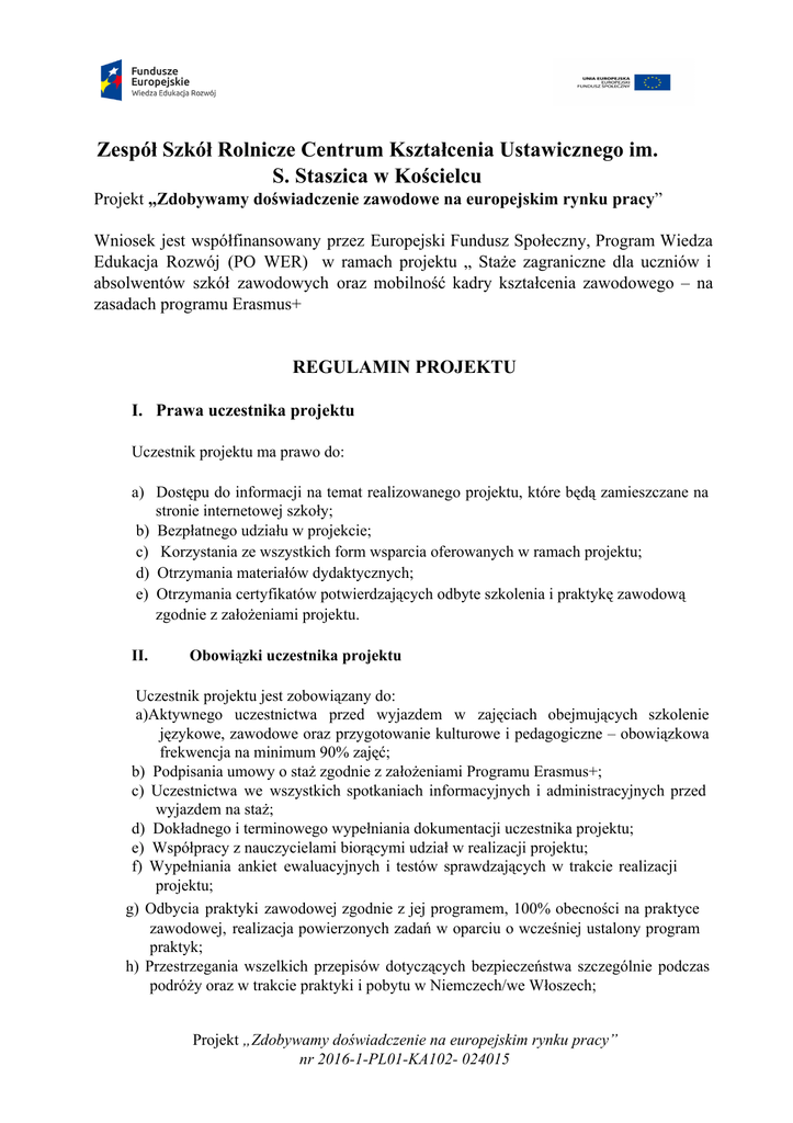 Zespół Szkół Rolnicze Centrum Kształcenia Ustawicznego im. S. Staszica w Kościelcu Projekt „Zdobywamy doświadczenie zawodowe na europejskim rynku pracy” Wniosek jest współfinansowany przez Europejski Fundusz Społeczny, Program Wiedza Edukacja Rozwój (PO WER) w ramach projektu „ Staże zagraniczne dla uczniów i absolwentów szkół zawodowych oraz mobilność kadry kształcenia zawodowego – na zasadach programu Erasmus+ REGULAMIN PROJEKTU I. Prawa uczestnika projektu Uczestnik projektu ma prawo do: a) Dostępu do informacji na temat realizowanego projektu, które będą zamieszczane na stronie internetowej szkoły; b) Bezpłatnego udziału w projekcie; c) Korzystania ze wszystkich form wsparcia oferowanych w ramach projektu; d) Otrzymania materiałów dydaktycznych; e) Otrzymania certyfikatów potwierdzających odbyte szkolenia i praktykę zawodową zgodnie z założeniami projektu. II. Obowiązki uczestnika projektu Uczestnik projektu jest zobowiązany do: a)Aktywnego uczestnictwa przed wyjazdem w zajęciach obejmujących szkolenie językowe, zawodowe oraz przygotowanie kulturowe i pedagogiczne – obowiązkowa frekwencja na minimum 90% zajęć; b) Podpisania umowy o staż zgodnie z założeniami Programu Erasmus+; c) Uczestnictwa we wszystkich spotkaniach informacyjnych i administracyjnych przed wyjazdem na staż; d) Dokładnego i terminowego wypełniania dokumentacji uczestnika projektu; e) Współpracy z nauczycielami biorącymi udział w realizacji projektu; f) Wypełniania ankiet ewaluacyjnych i testów sprawdzających w trakcie realizacji projektu; g) Odbycia praktyki zawodowej zgodnie z jej programem, 100% obecności na praktyce zawodowej, realizacja powierzonych zadań w oparciu o wcześniej ustalony program praktyk; h) Przestrzegania wszelkich przepisów dotyczących bezpieczeństwa szczególnie podczas podróży oraz w trakcie praktyki i pobytu w Niemczech/we Włoszech; Projekt „Zdobywamy doświadczenie na europejskim rynku pracy” nr 2016-1-PL01-KA102- 024015 i) Bezwzględnego przestrzegania poleceń opiekuna i zasad regulaminu stażu zawodowego; j) Przestrzegania bezwzględnego zakazu spożywania alkoholu, palenia tytoniu i zażywania narkotyków w czasie podróży oraz w czasie trwania praktyki zawodowej; k) Uczestnictwa w realizacji programu kulturowego realizowanego podczas pobytu za granicą; l) Przygotowania raportu końcowego z uczestnictwa w Projekcie oraz sporządzenie pisemnego podsumowania odbytego stażu zaraz po zakończeniu stażu; m) Uczestnictwa w spotkaniu podsumowującym po zakończeniu mobilności; n) Aktywnego udziału w rozpowszechnianiu rezultatów projektu, pomoc przy przygotowaniu prezentacji multimedialnej na konferencję podsumowującą działania projektowe; o) Wyrażenia zgody na przetwarzanie danych osobowych i wizerunku na potrzeby projektu. III. Zakres wsparcia uczestnika projektu W ramach projektu każdy uczestnik objęty zostanie następującymi formami wsparcia: a) Przygotowanie w kraju: językowe, pedagogiczne i kulturowe: − bezpłatne zajęcia z języka niemieckiego/angielskiego (35 godz. lekcyjnych), − bezpłatne zajęcia dotyczące kultury Niemiec/Włoch (5 godzin lekcyjnych), − bezpłatne zajęcia pedagogiczne ( 2 godz. lekcyjne). Zajęcia odbywać się będą przed wyjazdem, po lekcjach, w soboty lub inne dni wolne od zajęć lekcyjnych, zgodnie z wspólnie ustalonym harmonogramem spotkań. − Słowniki i rozmówki z języka niemieckiego/angielskiego. − Certyfikat potwierdzający odbycie kursów przygotowawczych. b) Wsparcie w kraju praktyk − Dwutygodniowe tygodniowe praktyki zawodowe w Niemczech lub we Włoszech. − Polisa ubezpieczeniowa grupowa (ubezpieczenie OC, NNW, KL). Podróż do kraju odbywania praktyk i powrót do Polski. − Zakwaterowanie i wyżywienie podczas pobytu za granicą. Bilety na transport lokalny w kraju stażu. − Opieka nauczycieli na miejscu oraz wsparcie ze strony partnera zagranicznego. − Program kulturowy na miejscu praktyki ( wycieczki). − Kieszonkowe. − Certyfikaty i dokument Europass Mobility. IV. Rezygnacja uczestnika z udziału w projekcie Projekt „Zdobywamy doświadczenie na europejskim rynku pracy” nr 2016-1-PL01-KA102- 024015 1. Uczestnik ma prawo do rezygnacji z udziału w projekcie bez ponoszenia odpowiedzialności finansowej w terminie do 7 dni po zakończeniu procesu rekrutacyjnego bez podania przyczyny. Rezygnację należy zgłosić na piśmie skierowanym do dyrektora Zespołu Szkół RCKU w Kościelcu, w przypadku osób niepełnoletnich wraz z podpisem rodzica/ prawnego opiekuna. 2. Rezygnacja w trakcie przygotowań do projektu jest możliwa wyłącznie w przypadku bardzo ważnych przyczyn osobistych, zdrowotnych lub losowych. Rezygnację należy zgłosić na piśmie skierowanym do dyrektora Zespołu Szkół RCKU w Kościelcu, w przypadku osób niepełnoletnich wraz z podpisem rodzica/prawnego opiekuna oraz dołączyć odpowiednie zaświadczenie potwierdzające powód rezygnacji. 3. W przypadku rezygnacji z udziału w projekcie uczestnik jest zobowiązany do zwrotu kosztów poniesionych przez organizatorów przy przygotowaniu projektu oraz zwrotu otrzymanych pomocy dydaktycznych (słowniki, rozmówki), w dniu złożenia rezygnacji. V. Wykluczenie uczestnika z udziału w projekcie Zespół projektowy może wykluczyć uczestnika z udziału w projekcie w przypadku: a) Naruszenia przez uczestnika regulaminu uczestnictwa w projekcie; b) Nieobecności na zajęciach przygotowawczych do mobilności w ilości przekraczającej 20% liczby zajęć. Uczestnik, który ze względów dyscyplinarnych zostanie wykluczony z udziału w projekcie ponosi pełne skutki finansowe związane z tym faktem, tzn. jest zobowiązany do zwrotu kosztów poniesionych przez organizatorów przy przygotowaniu projektu oraz zwrotu otrzymanych pomocy dydaktycznych (słowniki, rozmówki). IV. Postanowienia końcowe Koordynatorzy projektu oraz dyrektor Zespołu Szkół RCKU w Kościelcu zas