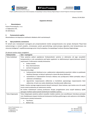 Projekt współfinansowany przez Unię Europejską z Europejskiego Funduszu Rozwoju Regionalnego w ramach Programu Innowacyjna Gospodarka Gliwice, 01.04.2014 Zapytanie ofertowe I. Zleceniodawca Future Processing Sp. z o.o. ul. Bojkowska 37A, 44-100 Gliwice II. Postanowienia ogólne Zleceniodawca nie dopuszcza możliwości składania ofert wariantowych. III. Opis przedmiotu zamówienia W ramach prac rozwojowych wymagane jest przeprowadzenie testów oprogramowania oraz sprzętu (komputer Player-box) wytworzonego w ramach projektu „Innowacyjny system geomarketingu wykorzystujący algorytmy wizji komputerowej oraz sztucznej inteligencji” współfinansowanego przez Unię Europejską z Europejskiego Funduszu Rozwoju Regionalnego. W zakresie testów należy uwzględnić: Rodzaj testów Opis + wymagania Testy modułowe Testy powinny pokryć pojedyncze funkcjonalności systemu w oderwaniu od jego wszystkich komponentów w celu sprawdzenia pod kątem zgodności ze zdefiniowanym typem/zakresem danych wejściowych. Preferowane metody testowania: analiza ścieżek; klasy równoważności; wartości brzegowych. Testy powinny objąć: funkcjonalności lokalizacji wraz z pobieraniem odpowiedniej zawartości reklam na podstawie lokalizacji (bazując na danych zapisanych w bazie dla danej lokalizacji); wyświetlania w odpowiednim formacie reklamy oraz przełączania reklam pomiędzy sobą w zależności od lokalizacji; algorytmów rozpoznawania odbiorców w kontekście poprawnego rozpoznawania ilości odbiorców, ich płci oraz wieku (dodatkowe charakterystyki odbiorców). Każdy z testów wymaga wygenerowania danych testowych. Dane testowe, opis testów oraz ich wyniki musza zostać przekazane po zakończeniu testów. Do testów modułowych zostaną przekazane skrypty przygotowane przez zespół badawczy Spółki opisujące możliwe wykorzystanie konkretnych modułów systemu. Testy integracyjne Testy integracyjne powinny pokryć wszystkie moduły systemu oraz weryfikować interakcje pomiędzy nimi. Dodatkowym etapem testów jest testowanie interfejsu graficznego w celu wykrycia w nim błędów. Preferowane metody testowania: Future Processing Sp. z o. o. Biuro projektu ul. Bojkowska 37 A 44-100 Gliwice Top-Down; Bottom-Up; Kontakt: Te|: +48 32 461 23 01 Fax: +48 32 461 23 09 [email protected] 1 Projekt współfinansowany przez Unię Europejską z Europejskiego Funduszu Rozwoju Regionalnego w ramach Programu Innowacyjna Gospodarka Big Bang. Testy powinny objąć zarówno aspekty funkcjonalne jak i wydajnościowe. Testy powinny objąć: urządzenie Player-box wraz z akcesoriami (wyświetlacz, kamera służąca do rozpoznawania charakterystyki odbiorców, odbiornik GPS). Urządzenie musi zostać wstępnie przygotowane (instalacja oprogramowania, konfiguracja oraz instalacja w środowisku testowym), a oprogramowanie zainstalowane oraz skonfigurowane do działania w oparciu o centralny serwer (zapewniane przez Future Processing). Testy powinny uwzględnić poprawność funkcjonowania całości systemu zgodnie z wytycznymi jak w przypadku testów modułowych (testy wyświetlania reklam w oparciu o lokalizację bazując na charakterystyce odbiorców) jak i testy wydajnościowe pokrywające: o wykorzystanie mocy obliczeniowej, zajętości pamięci RAM oraz wykorzystania dysku twardego urządzenia w zależności od wykorzystywanej funkcjonalności (wyświetlanie reklam na podstawie lokalizacji, wyświetlanie reklam na podstawie lokalizacji wraz z przetwarzaniem obrazu z kamery do identyfikacji odbiorców); o wykorzystanie przepustowości łącz w kontekście przesyłania danych (reklamy na podstawie lokalizacji, cechy wyekstrahowane z obrazów charakterystyczne dla odbiorców) pomiędzy urządzeniem Player-box a centralnym serwer. Każdy z testów wymaga wygenerowania danych testowych. Dane testowe, opis testów oraz ich wyniki musza zostać przekazane po zakończeniu testów. W ramach testów integracyjnych mogą zostać wykorzystane dane wygenerowane dla testów modułowych. Do testów integracyjnych zostaną przekazane skrypty przygotowane przez zespół badawczy Spółki opisujące przypadki wykorzystania systemu jako całości. Testy systemowe Testy systemowe mają na celu upewnienie się, że zintegrowany już system spełnia jako całość wymagania zawarte w specyfikacji. Innymi słowy system ma zostać przetestowany całościowo z użyciem technik czarnej skrzynki. Testy muszą pokryć przede wszystkim instalację systemu (możliwość wdrożenia komputera Player-box w planowanym miejscu użytkowania – autobusy oraz inne środki komunikacji, ustalenie przypadków szczególnych oraz ograniczeń konstrukcji), funkcjonalność systemu (test z udziałem grupy testowej odbiorców w celu weryfikacji funkcjonowania systemu w docelowym miejscu użytkowania), wydajnościowe (zapewnienie odpowiednich parametrów działania komputera w środowisku docelowym) oraz bezpieczeństwa (przetestowanie możliwości uzyskania nieautoryzowanego dostępu do systemu przez osoby trzecie). W przypadku testów związanych z instalacją systemu należy przeprowadzić także dodatkowe testy odporności urządzenia będącego częścią systemu na różne czynniki fizyczne takie jak: Future Processing Sp. z o. o. Biuro projektu ul. Bojkowska 37 A 44-100 Gliwice skrajne temperatury (w zakresie od -30 do +60 st. Celsjusza); wilgoć zanieczyszczenia (pył, kurz, sadza); wstrząsy (krótko jak i długotrwałe). Kontakt: Te|: +48 32 461 23 01 Fax: +48 32 461 23 09 [email protected] 2 Projekt współfinansowany przez Unię Europejską z Europejskiego Funduszu Rozwoju Regionalnego w ramach Programu Innowacyjna Gospodarka Wyniki testów muszą zostać zebrane w raport zawierający rekomendację usprawnień systemu (zarówno na warstwie oprogramowania jak i sprzętu), które mogą zostać wykorzystane do zmian w systemie geomarketingu. IV. Termin wykonania zamówienia Realizacja zamówienia powinna nastąpić od 01.06.2014 do 30.09.20