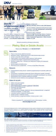 Aktualnie prowadzimy rekrutację na stanowisko: Płatny Staż w Dziale Analiz Miejsce pracy: Warszawa | nr ref. ISS-GAS-INT/2017 Nasza oferta Praca w nowoczesnej, globalnej korporacji. Możliwości rozwoju i współtworzenia firmy w fazie dynamicznego wzrostu. Umowa o pracę (bez okresu próbnego). Pakiet socjalny, w tym prywatna opieka medyczna i karta sportowa. Lekcje Business English i międzynarodowe środowisko pracy. Szkolenia, projekty cross - funkcyjne oraz dedykowane Programy dla najlepszych Pracowników. Bardzo przyjazna atmosfera pracy. Nowoczesne biuro na Mokotowie – 10 minut od stacji Metra Wilanowska. Wyzwania Przeprowadzanie analizy danych i raportów przygotowywanych na potrzeby spółki oraz Klientów. Procesowanie i kontrolowanie poprawności danych dotyczących wysyłek i zamówień. Aktualizowanie zestawów danych w systemach w przypadku pojawiających się odchyleń. Wprowadzanie zmian w obszarze znalezionych odchyleń. Określanie wzorców działania w celu zapobiegania nieprawidłowościom. Dołącz do nas jeśli… dobrze znasz język angielski, jesteś w trakcie studiów, jesteś dyspozycyjny we wtorki w godzinach 13:00-20:00, interesujesz się analizą danych, znasz pakiet MS Office, umiejętność pracy w zespole, dokładność, poczucie odpowiedzialności i umiejętność nadawania priorytetów – to Twoje cechy, i posiadasz wysokie umiejętności interpersonalne, szukasz wyzwań i możliwości rozwoju, chcesz pracować w przyjaznej atmosferze i tworzyć ją razem z nami. Prosimy o przysłanie CV, z zaznaczeniem numeru referencyjnego, na adres: [email protected] W dokumentach aplikacyjnych prosimy o dopisanie następującej klauzuli „Wyrażam zgodę na przetwarzanie moich danych osobowych przez DSV International Shared Services sp. z o.o. z siedzibą w Ołtarzewie dla potrzeb obecnych i przyszłych rekrutacji oraz weryfikacji moich kompetencji, a nadto do przekazania moich danych osobowych innym spółkom z grupy kapitałowej DSV ISS na potrzeby rekrutacji prowadzonych w przyszłości.” DSV – Global Transport and Logistics With offices and facilities in more than 80 countries on six continents, we provide and run supply chain solutions for thousands of companies on a daily basis. Our reach is global yet our presence is local and close to our customers. Read more at www.dsv.com 1. 2. 3. 4. 5. 6. Informujemy, że administratorem danych osobowych zawartych w przesłanych przez Pana\Panią dokumentach aplikacyjnych jest spółka DSV International Shared Services sp. z o.o. z siedzibą w Ołtarzewie przy ul. Południowej 2 (dalej: „DSV ISS”). Powyższe dane osobowe będą przetwarzane w celu przeprowadzenia procesu rekrutacyjnego, w ramach którego przesyła Pan/Pani dokumenty aplikacyjne, weryfikacji Pana/Pani kompetencji, a nadto w celu prowadzenia procesów rekrutacyjnych w przyszłości. Dane osobowe w związku z prowadzonym przez DSV ISS procesem rekrutacyjnym będę przekazane przez DSV ISS – DSV. W ramach prowadzonych w przyszłości rekrutacji dane osobowe mogą być także przekazane innym spółkom z grupy kapitałowej DSV ISS. Przysługuje Panu/Pani prawo wglądu i poprawiania danych osobowych. Podanie danych w zakresie określonym przepisami ustawy z dnia 26 czerwca 1974 r. Kodeks pracy jest obowiązkowe. Podanie dodatkowych danych jest dobrowolne. W przypadkach, o których mowa w art. 32 ust. 1 pkt 7 i 8 ustawy o ochronie danych osobowych z dnia 29.08.1997 r., przysługuje Panu/Pani prawo zgłoszenia sprzeciwu wobec przetwarzania Pana/Pani danych osobowych.