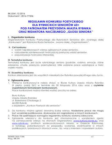 BK.0541.12.2016 Dokument : 2016-77206 REGULAMIN KONKURSU POETYCKIEGO DLA RYBNICKICH SENIORÓW 60+ POD PATRONATEM PREZYDENTA MIASTA RYBNIKA ORAZ REDAKTORA NACZELNEGO „GŁOSU SENIORA” I. Organizator konkursu Organizatorem Konkursu Poetyckiego dla Rybnickich Seniorów 60+, zwanego dalej „Konkursem” jest Rybnicka Rada Seniorów , zwana dalej „Organizatorem”. II. Cel konkursu • wybór najciekawszych wierszy zgłoszonych przez seniorów, • rozbudzenie zainteresowań twórczością poetycką wśród seniorów, • popularyzacja twórczości literackiej. III. Tematyka konkursu Tematyką konkursu jest życie rybnickiego seniora (podróże, rodzina, emocje, różne zdarzenia, chwile, przeżycia, przemyślenia). Mile widziane prace wplatające w treść wątek miasta. IV. Uczestnicy konkursu Konkurs skierowany jest do wszystkich mieszkańców Rybnika powyżej 60-ego roku życia. V. Zgłaszanie prac 1. Wiersz/-e konkursowy/-e należy złożyć w Biurze Kultury Urzędu Miasta Rybnika (II piętro, pokój 261) w terminie do 30 listopada 2016 roku wraz z czytelnie wypełnionym formularzem konkursowym. Prace konkursowe można również wysłać pocztą na adres: Biuro Kultury Urzędu Miasta Rybnika ul. Bolesława Chrobrego 2 44-200 Rybnik z dopiskiem: „Konkurs Poetycki dla seniorów” 2. Do konkursu można zgłosić dowolną liczbę wierszy. Nadesłane prace nie mogą być wcześniej publikowane, drukowane ani nagradzane w innych konkursach. 3. Prace nie spełniające wymogów regulaminu konkursu zostaną odrzucone. 4. Zgłoszenie wiersza/-y do konkursu jest równoznaczne z wyrażeniem zgody na zamieszczenie wierszy na stronach Organizatora: www.kultura.rybnik.eu oraz www.rybnik.eu, profilach społecznościowych Miasta, w Gazecie Rybnickiej, w katalogu pokonkursowym (w przypadku wydania), ewentualnie w innych publikacjach, branżowych stronach www., itp. wraz z imieniem i nazwiskiem autora, NESOD: 2016-77206 Przyg.: BK/201 1/2 VI. Ocena prac i rozstrzygnięcie konkursu 1. Wszystkie wiersze nadesłane do Konkursu podlegają ocenie Jury, w skład którego wchodzą: 1. Piotr Masłowski - Zastępca Prezydenta Miasta Rybnika, 2. Jolanta Groborz – Przewodnicząca Rybnickiej Rady Seniorów, 3. Wacław Troszka – Redaktor Naczelny Gazety Rybnickiej, 4. Elżbieta Wolny-Luks – Kierownika Biura Kultury, 5. Alicja Godlewska, 6. Sylwia Blazel-Kolar, 7. Jan Majer, biorąc pod uwagę takie kryteria jak wartość artystyczna, jakość, oryginalność i przesłanie płynące z wiersza. Decyzje Jury są ostateczne i wiążące dla wszystkich uczestników Konkursu. 2. Ogłoszenie wyników i wręczenie nagród rzeczowych dla laureatów odbędzie się na Otwartym Spotkaniu Poetyckim w Teatrze Ziemi Rybnickiej. Termin spotkania zostanie podany do publicznej wiadomości w terminie późniejszym. Wyniki konkursu zostaną również opublikowane na stronach www. miasta oraz w Gazecie Rybnickiej. 3. Dla zwycięzców przewidziano nagrody rzeczowe. VII. Postanowienia końcowe 1. Regulamin Konkursu dostępny jest w Biurze Kultury Urzędu Miasta Rybnika, w rybnickich instytucjach kultury, w radach dzielnic, na stronie internetowej www.kultura.rybnik.eu. 2. W sprawach nieuregulowanych niniejszym regulaminem zastosowanie znajdą odpowiednie przepisy prawa polskiego. 3. Konkurs nie jest „grą losową” w rozumieniu ustawy z 29 lipca 1992 r. o grach losowych i zakładach wzajemnych (tekst jednolity Dz. U. z 2016, poz. 471). 4. Zgłoszenie wiersza do Konkursu i wysłanie Formularza Zgłoszeniowego Konkursu jest jednoznaczne z przyjęciem przez uczestnika Konkursu warunków niniejszego regulaminu. NESOD: 2016-77206 Przyg.: BK/201 2/2
