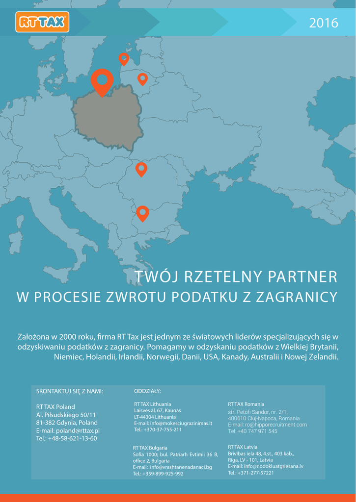 2016 T WÓJ RZETELNY PARTNER W PROCESIE ZWROTU PODATKU Z ZAGRANICY Założona w 2000 roku, firma RT Tax jest jednym ze światowych liderów specjalizujących się w odzyskiwaniu podatków z zagranicy. Pomagamy w odzyskaniu podatków z Wielkiej Brytanii, Niemiec, Holandii, Irlandii, Norwegii, Danii, USA, Kanady, Australii i Nowej Zelandii. SKONTAKTUJ SIĘ Z NAMI: ODDZIAŁY: RT TAX Poland Al. Piłsudskiego 50/11 81-382 Gdynia, Poland E-mail: [email protected] Tel.: +48-58-621-13-60 RT TAX Lithuania Laisves al. 67, Kaunas LT-44304 Lithuania E-mail: [email protected] Tel.: +370-37-755-211 RT TAX Romania str. Petofi Sandor, nr. 2/1, 400610 Cluj-Napoca, Romania E-mail: [email protected] Tel: +40 747 971 545 RT TAX Bulgaria Sofia 1000; bul. Patriarh Evtimii 36 B, office 2, Bulgaria E-mail: [email protected] Tel.: +359-899-925-992 RT TAX Latvia Brīvības iela 48, 4.st., 403.kab., Rīga, LV - 101, Latvia E-mail: [email protected] Tel.: +371-277-57221 ZOSTAŃ PARTNEREM RT TAX Naszym głównym celem jest bycie blisko naszych Klientów, lepsze zrozumienie ich potrzeb i zapewnienie im profesjonalnych usług. Każdego dnia dzielimy się swoim doświadczeniem z naszymi Partnerami , dzięki czemu poziom naszych usług jet coraz bardziej doskonały, a nasi Klienci są zadowoleni. Zapraszamy Cię! Dołącz do sieci Partnerów RT Tax i skorzystaj z naszej wiedzy i doświadczenia. J A K TO D Z I A Ł A 1 2 3 4 5 Podpisz umowę o współpracy z RT Tax. Oferuj nasze usługi Klientom. Przyjmij Klienta w biurze i udostępnij mu nasz formularz rejestracyjny do wypełnienia. Przekaż nam otrzymane od Klienta dokumenty. RT Tax wypłaci zwrot podatku bezpośrednio Klientowi, a Ty, jako nasz Partner otrzymasz prowizję. JAK POZYSKAĆ KLIENTÓW: Umieść informację o naszej współpracy na stronie internetowej. Rozpowszechnij informację o naszej współpracy za pomocą specjalnego linku na Facebooku i innych portalach społecznościowych; Przekaż nam dane kontaktowe do potencjalnych klientów, byśmy mogli skontaktować się z nimi bezpośrednio. KO R Z YŚ C I Z E W S P Ó Ł P R AC Y: Przypisany specjalista, który wyszkoli, a także udzieli wsparcia Twoim pracownikom. Interaktywne konto ze statusem każdej przekazanej sprawy oraz informacją o należnej prowizji. Przystępny formularz zgłoszeniowy wraz ze szczegółową instrukcją. Specjalny link, za pomocą którego Twoi Klienci będą mogli zgłaszać chęć rozliczenia on-line jak również korzystać z bezpłatnego kalkulatora zwrotu itd. Wsparcie w trakcie internetowych i tradycyjnych akcji marketingowych. Darmowe materiały marketingowe. Darmowe usługi kurierskie do przekazywania dokumentów. KORZYŚCI DLA TWOJEJ FIRMY Dodatkowy dochód Zadowoleni Klienci Dodatkowa usługa dla Twoich Klientów CO MOGĄ ZYSKAĆ TWOI KLIENCI? Profesjonalne usługi zwrotu podatku realizowane zgodnie z prawem Najwyższą możliwą kwotę zwrotu podatku Żadnych kosztów w przypadku braku zwrotu podatku Bezpośredni przelew zwrotu podatku na konto Klienta S TAT YS T YK I LICZBA PARTNERÓW 445 350 50 120 2000 2005 2010 2015 Jesteśmy dumni z posiadania ponad 445 przedstawicieli w 59 krajach, którzy pomogli obsłużyć nam ponad 250 000 zadowolonych klientów w trakcie 15 lat naszej ciężkiej pracy.