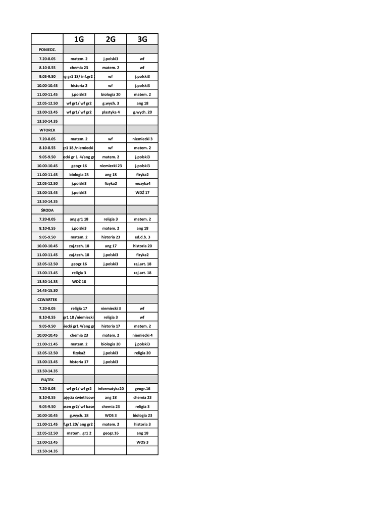 1G 2G 3G matem. 2 j.polski3 wf 8.10-8.55 chemia 23 matem. 2 wf 9.05-9.50 ang gr1 18/ inf.gr2 20 wf j.polski3 10.00-10.45 historia 2 wf j.polski3 11.00-11.45 j.polski3 biologia 20 matem. 2 12.05-12.50 wf gr1/ wf gr2 g.wych. 3 ang 18 13.00-13.45 wf gr1/ wf gr2 plastyka 4 g.wych. 20 13.50-14.35 zkk 1-3GP zkk 1-3GP zkk 1-3GP matem. 2 wf niemiecki 3 PONIEDZ. 7.20-8.05 WTOREK 7.20-8.05 8.10-8.55ang gr1 18 /niemiecki gr 2 4 wf matem. 2 9.05-9.50 niemiecki gr 1 4/ang gr 2 18matem. 2 j.polski3 10.00-10.45 geogr.16 niemiecki 23 j.polski3 11.00-11.45 biologia 23 ang 18 fizyka2 12.05-12.50 j.polski3 fizyka2 muzyka4 13.00-13.45 j.polski3 WDŻ 17 13.50-14.35 ŚRODA 7.20-8.05 ang gr1 18 religia 3 matem. 2 8.10-8.55 j.polski3 matem. 2 ang 18 9.05-9.50 matem. 2 historia 23 ed.d.b. 3 10.00-10.45 zaj.tech. 18 ang 17 historia 20 11.00-11.45 zaj.tech. 18 j.polski3 fizyka2 12.05-12.50 geogr.16 j.polski3 zaj.art. 18 13.00-13.45 religia 3 13.50-14.35 WDŻ 18 zaj.art. 18 14.45-15.30 CZWARTEK 7.20-8.05 religia 17 niemiecki 3 wf 8.10-8.55ang gr1 18 /niemiecki gr2 4religia 3 wf 9.05-9.50niemiecki gr1 4/ang gr2 18historia 17 matem. 2 10.00-10.45 chemia 23 matem. 2 niemiecki 4 11.00-11.45 matem. 2 biologia 20 j.polski3 12.05-12.50 fizyka2 j.polski3 religia 20 13.00-13.45 historia 17 j.polski3 7.20-8.05 wf gr1/ wf gr2 informatyka20 geogr.16 8.10-8.55 zajęcia świetlicowe ang 18 chemia 23 13.50-14.35 PIĄTEK 9.05-9.50wf basen gr2/ wf basen gr1chemia 23 10.00-10.45 g.wych. 18 WOS 3 11.00-11.45 inf.gr1 20/ ang gr2 18 matem. 2 12.05-12.50 13.00-13.45 13.50-14.35 matem. gr1 2 geogr.16 religia 3 biologia 23 historia 3 ang 18 WOS 3
