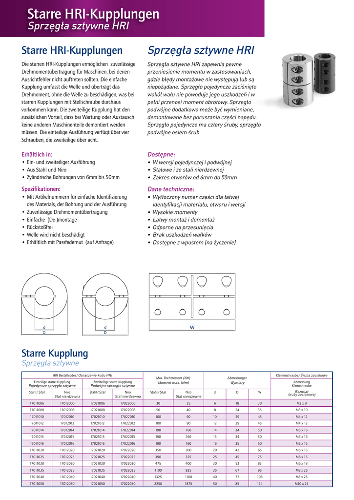 Starre HRI-Kupplungen Sprzęgła sztywne HRI Starre HRI-Kupplungen Sprzęgła sztywne HRI Die starren HRI-Kupplungen ermöglichen zuverlässige Drehmomentübertragung für Maschinen, bei denen Ausrichtfehler nicht auftreten sollten. Die einfache Kupplung umfasst die Welle und überträgt das Drehmoment, ohne die Welle zu beschädigen, was bei starren Kupplungen mit Stellschraube durchaus vorkommen kann. Die zweiteilige Kupplung hat den zusätzlichen Vorteil, dass bei Wartung oder Austausch keine anderen Maschinenteile demontiert werden müssen. Die einteilige Ausführung verfügt über vier Schrauben, die zweiteilige über acht. Sprzęgła sztywne HRI zapewnia pewne przeniesienie momentu w zastosowaniach, gdzie błędy montażowe nie występują lub są niepożądane. Sprzęgło pojedyncze zaciśnięte wokół wału nie powoduje jego uszkodzeń i w pełni przenosi moment obrotowy. Sprzęgło podwójne dodatkowo może być wymieniane, demontowane bez poruszania części napędu. Sprzęgło pojedyncze ma cztery śruby, sprzęgło podwójne osiem śrub. Erhältlich in: Dostępne: • Ein- und zweiteiliger Ausführung • Aus Stahl und Niro • Zylindrische Bohrungen von 6mm bis 50mm • W wersji pojedynczej i podwójnej • Stalowe i ze stali nierdzewnej • Zakres otworów od 6mm do 50mm Spezifikationen: Dane techniczne: • Mit Artikelnummern für einfache Identifizierung des Materials, der Bohrung und der Ausführung • Zuverlässige Drehmomentübertragung • Einfache (De-)montage • Rückstoßfrei • Welle wird nicht beschädigt • Erhältlich mit Passfedernut (auf Anfrage) • Wytłoczony numer części dla łatwej identyfikacji materiału, otworu i wersji • Wysokie momenty • Łatwy montaż i demontaż • Odporne na przesunięcia • Brak uszkodzeń wałków • Dostępne z wpustem (na życzenie) Starre Kupplung Sprzęgła sztywne HRI Bestellcodes/Oznaczenie kodu HRI Max. Drehmoment (Nm) Moment max. (Nm) Klemmschraube/Śruba zaciskowa Abmessungen Wymiary Einteilige starre Kupplung Pojedyncze sprzęgło sztywne Zweiteilige starre Kupplung Podwójne sprzęgło sztywne Abmessung Klemschraube Stahl/Stal Niro Stal nierdzewna Stahl/Stal Niro Stal nierdzewna Stahl/Stal Niro Stal nierdzewna d 17011006 17012006 17021006 17022006 30 25 17011008 17012008 17021008 17022008 50 40 17011010 17012010 17021010 17022010 100 90 10 29 45 M4 x 12 17011012 17012012 17021012 17022012 100 90 12 29 45 M4 x 12 17011014 17012014 17021014 17022014 190 160 14 34 50 M5 x 16 17011015 17012015 17021015 17022015 190 160 15 34 50 M5 x 16 17011016 17012016 17021016 17022016 190 160 16 35 50 M5 x 16 Rozmiar śruby zaciskowej D W 6 18 30 M3 x 8 8 24 35 M3 x 10 17011020 17012020 17021020 17022020 350 300 20 42 65 M6 x 16 17011025 17012025 17021025 17022025 390 325 25 45 75 M6 x 16 17011030 17012030 17021030 17022030 475 400 30 53 83 M6 x 18 17011035 17012035 17021035 17022035 1100 925 35 67 95 M8 x 25 17011040 17012040 17021040 17022040 1325 1100 40 77 108 M8 x 25 17011050 17012050 17021050 17022050 2250 1875 50 85 124 M10 x 25