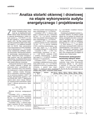 mb0846 – TEMAT WYDANIA Jerzy Żurawski* Analiza stolarki okiennej i drzwiowej na etapie wykonywania audytu energetycznego i projektowania Z azwyczaj podczas wykonywania audytu energetycznego przyjmuje się, że współczynnik przenikania ciepła drewnianej stolarki okiennej dwuszybowej w stanie dobrym wynosi Uwo = 2,6 W/m2K, a w stanie złym wartość Uwo można zwiększyć nawet o 20%. Tak więc wartość współczynnika przenikania ciepła może osiągnąć nawet 3,1, a w niektórych przypadkach 3,2 W/m2K. Takie uproszczenie może doprowadzić do dużej niedokładności w obliczeniach Uokna, a w konsekwencji rozbieżności pomiędzy wartością rzeczywistą i obliczeniową wskaźnika sezonowego zapotrzebowania na ciepło. Wykonanie audytu energetycznego powinno więc być poprzedzone wizją lokalną, na podstawie której ocenia się m.in. izolacyjność termiczną i szczelność stolarki okiennej i drzwiowej. Izolacyjność termiczna okien zależy od: rodzaju materiału z jakiego jest wykonana rama i przeszklenie; grubości, szerokości ramy oraz parametrów izolacyjnych, a także od geometrii okien i wartości mostka liniowego. Aby to udowodnić, wykonano obliczenia za pomocą programu „GAP-i” wg metody obliczeniowej zgodnej z normą PN-EN ISO 10077-1 Właściwości cieplne okien, drzwi i żaluzji. Obliczenie współczynnika przenikania ciepła. Część 1: Metoda uproszczona. Zgodnie z normą: Uw = 4/6/4 bez powłoki niskoemisyjnej i bez gazu szlachetnego Ug = 3,3 W/m2K; • przykład 3 (P1) – z drewna miękkiego o grubości 50 mm i szerokości 60 mm – Uf = 2,0 W/m2K, oszklenie 4/9/4 bez powłoki niskoemisyjnej i bez gazu szlachetnego Ug = 3,0 W/m2K; • przykład 4 (P1’) – okna wykonane z drewna grubości 75 mm i szerokości 70 mm – Uf = 1,5 W/m2K, oszklenie 4/16/4 z powłoką niskoemisyjną, z gazem typu argon Ug = 1,0 W/m2K i z mostkiem liniowym Ψ = 0,06 W/m2K; • przykład 5 (P2’) – z PVC trzykomorowego szerokości 73 mm – Uf = 1,59 W/m2K, oszklenie 4/16/4 z powłoką niskoemisyjną, z gazem typu argon Ug = 1,0 W/m2K i mostkiem liniowym Ψ = 0,06 W/m2K; • przykład 6 (P3’) – z PVC trzykomorowego z wkładką termiczną, szerokość profili 73 mm – Uf = 1,21 W/m2K, oszklenie 4/14/4/14/4 z powłoką niskoemisyjną, z gazem typu argon Ug = 0,6 W/m2K i mostkiem liniowym Ψ = 0,04 W/m2K. W podanych przykładach wartości Uwo są bardzo zbliżone. W praktyce często zdarza się, że wartości te znacznie się różnią, szczególnie dla okien o znacznie różnych wymiarach, np. w przypadku: okna małego 600 x 900 mm jednokwaterowego przy Uf = 1,9 i Ug = 1,1 W/m2K – Uw okna wynosi Uw = 1,83 W/m2K; okno duże o wymiarach 2200 x 2400 mm czterokwaterowe o tych samych Uf i Ug daje współczynnik przenikania ciepła okna Uw = 1,58 W/m2K, czyli wartość Uw jest o 16% mniejsza tylko ze względu na wielkość okna i liczbę kwater. Porównanie izolacyjności termicznej różnych okien Okna wykonane z tego samego materiału mają różną izolacyjność termiczną (tabela 1). Jak wynika z wartości U, okna bez szprosów, słupków i innych elementów konst- Tabela 1. Uw badanych okien, przykłady( P1, P2, P3, P4, P5, P6) w zależności od rodzaju ramy, szyby i schematu liczby kwater Typ Wymiary [mm] Schemat Szt. (P1) Uwo (P2) Uwo (P3) Uwo (P4) Uwo (P5) Uwo (P6) Uwo [W/m2K] [W/m2K] [W/m2K] [W/m2K] [W/m2K] [W/m2K] Ok1 2040x1500 9 3,09 2,95 2,76 1,60 1,46 0,99 Ok2 860x1500 15 3,09 2,96 2,77 1,54 1,40 0,91 Ok3 1470x1500 17 3,09 2,95 2,76 1,58 1,44 0,94 DZ1 1080x2200 2 3,09 2,95 2,76 1,55 1,41 0,91 Wartość średnioważona U dla całej stolarki Uwośr. 3,09 2,95 2,76 1,58 1,43 0,95 Różnica wartości Uwśr [%] 112 107 100 166 153 100 AgUg + Af Uf + IgΨ g Ag + Af Badania dotyczyły następujących okien: • przykład 1 (P1) – z drewna twardego o grubości 50 mm i szerokości 50 mm – Uf = 2,36 W/m2K, oszklenie 4/6/4 bez powłoki niskoemisyjnej i bez gazu szlachetnego Ug = 3,3 W/m2K; • przykład 2 (P2) – z drewna miękkiego o grubości 50 mm i szerokości 50 mm – Uf = 2,0 W/m2K, oszklenie * Dolnośląska Agencja Energii i Środowiska 8 ’2007 (nr 420) 1 TEMAT WYDANIA – rukcyjnych charakteryzują się lepszą izolacyjnością termiczną. Na rysunku pokazano wpływ budowy okna na straty ciepła w budynku. Jest to wartość bieżąca netto oceny efektywności ekonomicznej inwestycji rzeczowej. Wskaźnik NPV stanowi różnicę pomiędzy zdyskontowanymi przepływami pieniężnymi a nakładami początkowymi i jest określony wzorem: n NPV = ∑ (1 + r ) CFt t − I0 t =1 Wpływ budowy okna na straty ciepła w budynku Wnioski z obliczeń są następujące: 1) izolacyjność okien zależy od zastosowanych materiałów oraz od schematu – podziału okna i liczby kwater. W projektowaniu konieczne jest uwzględnianie wpływu podziału okna na jego izolacyjność termiczną; 2) izolacyjność termiczna okien wykonanych z profili pieciokomorowych z wkładką termiczną oraz z szybą 0,6 W/(m2K) (P3’) jest o 66% wyższa od okien trzykomorowych, co oznacza, że konieczne jest precyzyjne określenie parametrów stolarki okiennej na etapie projektu (tzn. z czego okno powinno być wykonane oraz parametry końcowe stolarki okiennej); 3) cena okien (P3’) jest o 50% wyższa od okien (P1’). Wycenę stolarki okiennej należy wykonywać na podstawie cen konkretnego producenta spełniającego założenia projektu lub skorzystać np. z programu GAP-i; 4) konieczne jest określenie Uwo i Uw1 każdego okna oraz wartości średnioważonej Uw całej stolarki okiennej. Audytor na etapie wykonywania audytu powinien skonsultować się z architektem co do podziału przewidzianych do wymiany okien oraz obliczyć przewidywaną ich izolacyjność, wycenić, a następnie wykonać analizę ekonomiczną. W projekcie obliczenia te powinny być wykonane ponownie, aby potwierdzić zaprojektowaną izolacyjność okien. Projektowanie stolarki okiennej należy zakończyć wykonaniem opisu ko