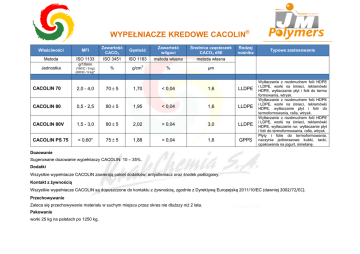 WYPEŁNIACZE KREDOWE CACOLIN® Właściwości MFI Metoda ISO 1133 Jednostka g/10min (190°C / 5 kg) (200°C / 5 kg)* Zawartość CACO3 ISO 3451 ISO 1183 % g/cm Gęstość 3 Zawartość wilgoci metoda własna Średnica cząsteczek CACO3 d50 metoda własna % µm Rodzaj nośnika CACOLIN 70 2,0 - 4,0 70 ± 5 1,70 < 0,04 1,6 LLDPE CACOLIN 80 0,5 - 2,5 80 ± 5 1,95 < 0,04 1,6 LLDPE CACOLIN 80V 1,5 - 3,0 80 ± 5 2,02 < 0,04 3,0 LLDPE CACOLIN PS 75 < 0,60* 75 ± 5 1,88 < 0,04 1,6 GPPS Typowe zastosowanie Wytłaczanie z rozdmuchem folii HDPE i LDPE, worki na śmieci, reklamówki HDPE, wytłaczanie płyt i folii do termo formowania, wtrysk. Wytłaczanie z rozdmuchem folii HDPE i LDPE, worki na śmieci, reklamówki HDPE, wytłaczanie płyt i folii do termoformowania, rafia, wtrysk. Wytłaczanie z rozdmuchem folii HDPE i LDPE, worki na śmieci, reklamówki HDPE, wytłaczanie rur, wytłaczanie płyt i folii do termoformowania, rafia, wtrysk. Płyty i folie do termoformowania, naczynia jednorazowe kubki, tacki, opakowania na jogurt, śmietanę. Dozowanie Sugerowane dozowanie wypełniaczy CACOLIN: 10 – 35%. Dodatki Wszystkie wypełniacze CACOLIN zawierają pakiet dodatków: antyutleniacz oraz środek poślizgowy. Kontakt z żywnością Wszystkie wypełniacze CACOLIN są dopuszczone do kontaktu z żywnością, zgodnie z Dyrektywą Europejską 2011/10/EC (dawniej 2002/72/EC). Przechowywanie Zaleca się przechowywanie materiału w suchym miejscu przez okres nie dłuższy niż 2 lata. Pakowanie worki 25 kg na paletach po 1250 kg.