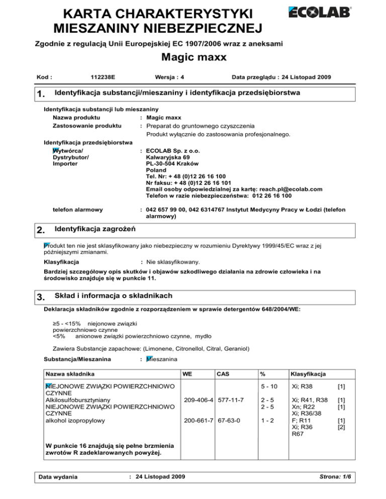 KARTA CHARAKTERYSTYKI MIESZANINY NIEBEZPIECZNEJ Zgodnie z regulacją Unii Europejskiej EC 1907/2006 wraz z aneksami Magic maxx Kod : 1. 112238E Wersja : 4 Data przeglądu : 24 Listopad 2009 Identyfikacja substancji/mieszaniny i identyfikacja przedsiębiorstwa Identyfikacja substancji lub mieszaniny Nazwa produktu : Magic maxx Zastosowanie produktu : Preparat do gruntownego czyszczenia Produkt wyłącznie do zastosowania profesjonalnego. Identyfikacja przedsiębiorstwa Wytwórca/ Dystrybutor/ Importer telefon alarmowy 2. : ECOLAB Sp. z o.o. Kalwaryjska 69 PL-30-504 Kraków Poland Tel. Nr: + 48 (0)12 26 16 100 Nr faksu: + 48 (0)12 26 16 101 Email osoby odpowiedzialnej za kartę: [email protected] Telefon w razie niebezpieczeństwa: 012 26 16 100 : 042 657 99 00, 042 6314767 Instytut Medycyny Pracy w Łodzi (telefon alarmowy) Identyfikacja zagrożeń Produkt ten nie jest sklasyfikowany jako niebezpieczny w rozumieniu Dyrektywy 1999/45/EC wraz z jej późniejszymi zmianami. Klasyfikacja : Nie sklasyfikowany. Bardziej szczegółowy opis skutków i objawów szkodliwego działania na zdrowie człowieka i na środowisko znajduje się w punkcie 11. 3. Skład i informacja o składnikach Deklaracja składników zgodnie z rozporządzeniem w sprawie detergentów 648/2004/WE: ≥5 - <15% niejonowe związki powierzchniowo czynne <5% anionowe związki powierzchniowo czynne, mydło Zawiera Substancje zapachowe: (Limonene, Citronellol, Citral, Geraniol) Substancja/Mieszanina : Mieszanina Nazwa składnika WE NIEJONOWE ZWIĄZKI POWIERZCHNIOWO CZYNNE Alkilosulfobursztyniany NIEJONOWE ZWIĄZKI POWIERZCHNIOWO CZYNNE alkohol izopropylowy CAS % Klasyfikacja 5 - 10 Xi; R38 [1] 209-406-4 577-11-7 2-5 2-5 [1] [1] 200-661-7 67-63-0 1-2 Xi; R41, R38 Xn; R22 Xi; R36/38 F; R11 Xi; R36 R67 [1] [2] W punkcie 16 znajdują się pełne brzmienia zwrotów R zadeklarowanych powyżej. Data wydania : 24 Listopad 2009 Strona: 1/6 Magic maxx Nie zawiera więcej składników, które w świetle obecnej wiedzy dostawcy oraz w danym stężeniu są klasyfikowane jako niebezpieczne dla zdrowia i otoczenia, nie ma więc wymogu wymieniania ich w niniejszym ustępie. [1] Substancja sklasyfikowana jako szkodliwa dla zdrowia lub środowiska [2] Substancja, dla której wyznaczono dpouszczalne stężenie w środowisku pracy [3] Substancja PBT [4] Substancja vPvB Najwyższe dopuszczalne stężenia i natężenia czynników szkodliwych dla zdrowia w środowisku pracy, jeśli są dostępne, są wymienione w punkcie 8. 4. Pierwsza pomoc Pierwsza pomoc Droga oddechowa : Wynieść narażoną osobę na świeże powietrze. Jeśli pojawią się objawy, zasięgnąć porady lekarskiej. : Przemyć usta wodą. Wynieść narażoną osobę na świeże powietrze. Nie wywoływać wymiotów, jeśli nie jest to zalecane przez personel medyczny. Jeśli pojawią się objawy, zasięgnąć porady lekarskiej. Droga pokarmowa Kontakt ze skórą Kontakt z oczami. : Spłukać skażoną skórę dużą ilością wody. Zdjąć skażoną odzież i buty. : Natychmiast przepłukać oczy dużą ilością wody, od czasu do czasu podnosząc górna i dolna powiekę. Zasięgnąć porady lekarskiej, jeśli pojawi się podrażnienie. Szczególne sposoby leczenia : Brak. Bardziej szczegółowy opis skutków i objawów szkodliwego działania na zdrowie człowieka i na środowisko znajduje się w punkcie 11. 5. Postępowanie w przypadku pożaru Środki gaśnicze - Odpowiednie : W przypadku pożaru zastosować zraszania wodą (mgłą), użyć piany oraz suchych środków chemicznych lub CO2. Środki gaśnicze : Nie używać strumienia wody. Nieodpowiednie Środki ochrony indywidualnej : Strażacy powinni nosić odpowiednie urządzenia ochronne oraz indywidualne aparaty oddechowe (SCBA) z maska zakrywającą całą twarz działająca w dla strażaków obszarze podwyższonego ciśnienia. 6. Postępowanie w przypadku niezamierzonego uwolnienia do środowiska Indywidualne środki ostrożności : Nie udzielać zezwolenia na wejście - niepotrzebnemu i nie zabezpieczonemu personelowi. Nie dotykać, ani nie przechodzić, po rozlanym materiale. Wyłączyć wszystkie źródła zapłonu. Unikać wdychania par lub mgły. Zapewnić właściwą wentylację. Zabezpieczenia środowiskowe : Należy unikać uwolnienia rozlanego/rozsypanego materiału, jego spływania/rozprzestrzeniania do gleby lub kontaktu z glebą, wodami powierzchniowymi i gruntowymi, drenami i kanalizacją. Małe rozlanie/rozproszenie : Rozcieńczyć wodą i zebrać ścierką jeżeli rozpuszcza się w wodzie lub zaadsorbować obojętnym suchym materiałem i umieścić we właściwym pojemniku na odpady. Należy używać narzędzi nie wytwarzających iskier oraz wyposażenia zapobiegającego wybuchom. Duże rozlanie : Zabezpieczyć ujścia kanalizacji, instalacji wodnych oraz wejścia do piwnic i obszarów zamkniętych. Rozlane lub rozsypane substancje, należy zebrać za pomocą niepalnych substancji, takich jak: piasek, ziemia, wermikulit, ziemia okrzemkowa. Następnie umieścić w pojemnikach i utylizować zgodnie z miejscowymi przepisami (patrz punkt 13). Należy używać narzędzi nie wytwarzających iskier oraz wyposażenia zapobiegającego wybuchom. Patrz także: punkt 8. zawiera informacje nt środków ochrony indywidualnej, a punkt 13. sposób postępowania z odpadami. Data wydania : 24 Listopad 2009 Strona: 2/6 Magic maxx 7. Postępowanie z substancją/mieszaniną i jej/jego magazynowanie Postępowanie z substancją lub : Nie spożywać. Unikać kontaktu z oczami, skórą i ubraniem. Przechowywać z dala od źródła ciepła, iskrzenia, otwartego płomienia lub innych źródeł preparatem zapłonu. Po pracy należy dokładnie umyć ręce mydłem i wodą. Magazynowanie : Należy przechowywać zgodnie z miejscowymi przepisami. Przechowywać w oryginalnym opakowaniu, zdala od promieni słonecznych; w suchym, chłodnym i dobrze wentylowanym pomieszczeniu; zdala od niezgodnych materiałów (patrz punkt 10), napojów i jedzenia. 