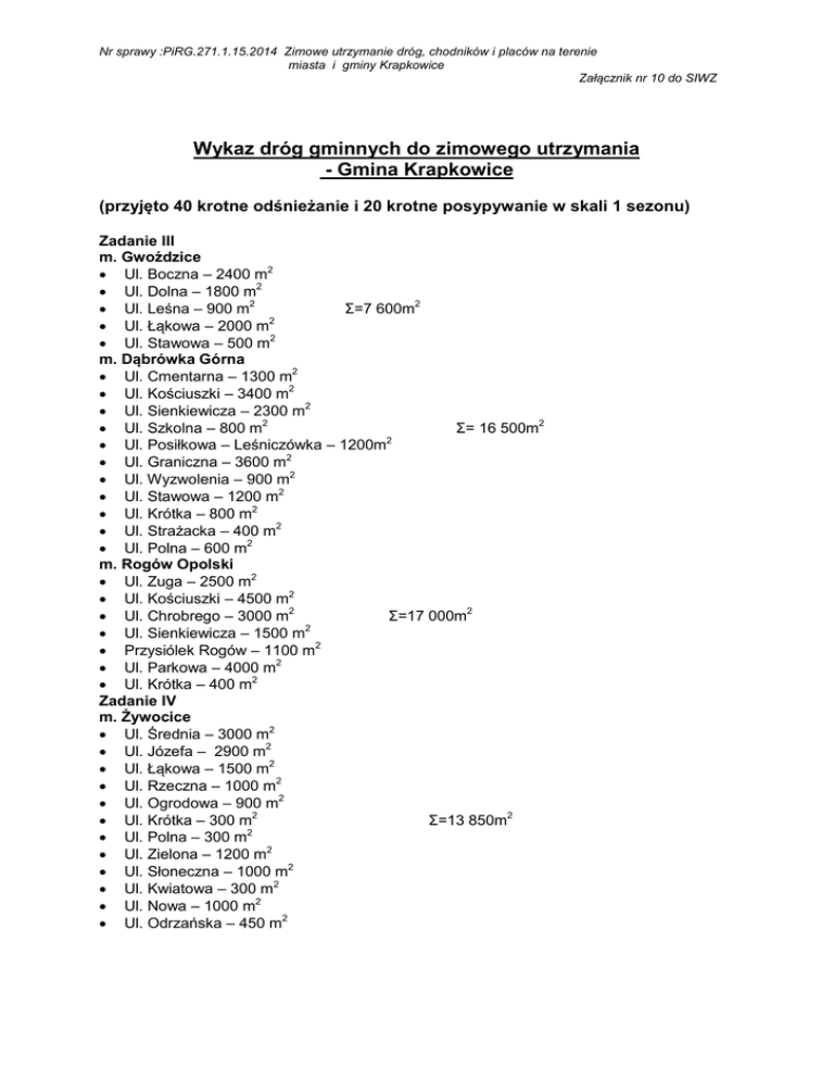 Nr sprawy :PiRG.271.1.15.2014 Zimowe utrzymanie dróg, chodników i placów na terenie miasta i gminy Krapkowice Załącznik nr 10 do SIWZ Wykaz dróg gminnych do zimowego utrzymania - Gmina Krapkowice (przyjęto 40 krotne odśnieżanie i 20 krotne posypywanie w skali 1 sezonu) Zadanie III m. Gwoździce Ul. Boczna – 2400 m2 Ul. Dolna – 1800 m2 Ul. Leśna – 900 m2 Σ=7 600m2 Ul. Łąkowa – 2000 m2 Ul. Stawowa – 500 m2 m. Dąbrówka Górna Ul. Cmentarna – 1300 m2 Ul. Kościuszki – 3400 m2 Ul. Sienkiewicza – 2300 m2 Ul. Szkolna – 800 m2 Σ= 16 500m2 2 Ul. Posiłkowa – Leśniczówka – 1200m Ul. Graniczna – 3600 m2 Ul. Wyzwolenia – 900 m2 Ul. Stawowa – 1200 m2 Ul. Krótka – 800 m2 Ul. Strażacka – 400 m2 Ul. Polna – 600 m2 m. Rogów Opolski Ul. Zuga – 2500 m2 Ul. Kościuszki – 4500 m2 Ul. Chrobrego – 3000 m2 Σ=17 000m2 Ul. Sienkiewicza – 1500 m2 Przysiólek Rogów – 1100 m2 Ul. Parkowa – 4000 m2 Ul. Krótka – 400 m2 Zadanie IV m. Żywocice Ul. Średnia – 3000 m2 Ul. Józefa – 2900 m2 Ul. Łąkowa – 1500 m2 Ul. Rzeczna – 1000 m2 Ul. Ogrodowa – 900 m2 Ul. Krótka – 300 m2 Σ=13 850m2 2 Ul. Polna – 300 m Ul. Zielona – 1200 m2 Ul. Słoneczna – 1000 m2 Ul. Kwiatowa – 300 m2 Ul. Nowa – 1000 m2 Ul. Odrzańska – 450 m2 Nr sprawy :PiRG.271.1.15.2014 Zimowe utrzymanie dróg, chodników i placów na terenie miasta i gminy Krapkowice Załącznik nr 10 do SIWZ m. Steblów Ul. Wiejska – 3500 m2 Ul. Ligonia – 3400 m2 Ul. Ogrodowa – 2500 m2 Ul. Cmentarna – 2000 m2 Ul. Szkolna – 1800 m2 Ul. Sienkiewicza – 2200 m2 Ul. Kopernika – 1500 m2 Ul. Mickiewicza – 1400 m2 Σ=27 900m2 2 Ul. Leśna – 1400 m Ul. Łąkowa – 1400 m2 Ul. Dworcowa – 2200 m2 Ul. Leśna – 1800 m2 Ul. Polna – 2000 m2 Ul. Krótka – 800 m2 m. Żużela Ul. Nowa – 900 m2 Ul. Szkolna – 1000 m2 Ul. Polna – 1800 m2 Ul. Ogrodowa – 1000 m2 Σ=12 560 m2 Ul. Osiedlowa – 5800 m2 Ul. Wodna – 1260 m2 Ul. Leśna – 800 m2 Zadanie V m. Ściborowice Ul. Polna – 1700 m2 Ul. Dębowa – 2800 m2 Σ=10 600m2 2 Ul. Szkolna – 1100 m Przysiółek Jarszowice – Wesoła – 5000m 2 m. Pietna Pl. Stawowy – 1800 m2 Ul. Łąkowa – 1200 m2 Ul. Leśna – 1000 m2 m. Kórnica Ul. Łąkowa – 1600 m2 (Rajdyna) Ul. Krótka – 1500 m2 Ul. Szkolna – 1500 m2 Ul. XXX-lecia - 2500 m2 Ul. Polna – 2000 m2 Ul. Nowa – 500 m2 m. Nowy Dwór – 6 200m2 m. Borek – 5 500 m2 Σ= 4000m2 Σ=9 600m2