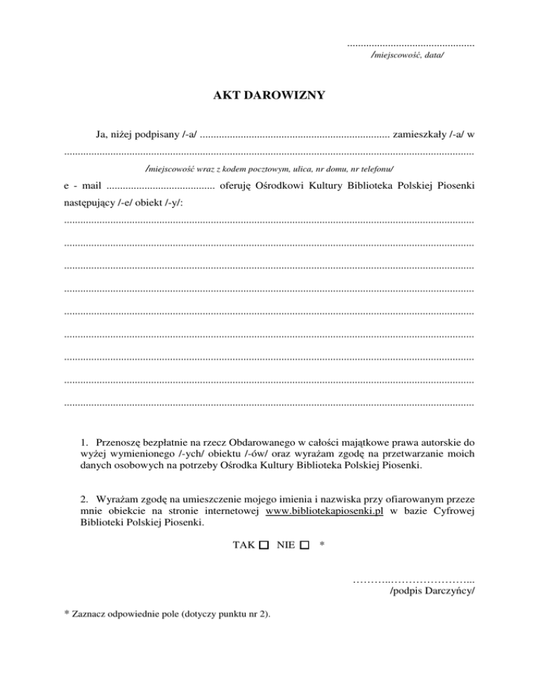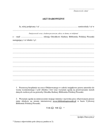 ............................................... /miejscowość, data/ AKT DAROWIZNY Ja, niżej podpisany /-a/ ...................................................................... zamieszkały /-a/ w ....................................................................................................................................................... /miejscowość wraz z kodem pocztowym, ulica, nr domu, nr telefonu/ e - mail ........................................ oferuję Ośrodkowi Kultury Biblioteka Polskiej Piosenki następujący /-e/ obiekt /-y/: ....................................................................................................................................................... ....................................................................................................................................................... ....................................................................................................................................................... ....................................................................................................................................................... ....................................................................................................................................................... ....................................................................................................................................................... ....................................................................................................................................................... ....................................................................................................................................................... ....................................................................................................................................................... 1. Przenoszę bezpłatnie na rzecz Obdarowanego w całości majątkowe prawa autorskie do wyżej wymienionego /-ych/ obiektu /-ów/ oraz wyrażam zgodę na przetwarzanie moich danych osobowych na potrzeby Ośrodka Kultury Biblioteka Polskiej Piosenki. 2. Wyrażam zgodę na umieszczenie mojego imienia i nazwiska przy ofiarowanym przeze mnie obiekcie na stronie internetowej www.bibliotekapiosenki.pl w bazie Cyfrowej Biblioteki Polskiej Piosenki. TAK NIE * ………..…………………... /podpis Darczyńcy/ * Zaznacz odpowiednie pole (dotyczy punktu nr 2).
