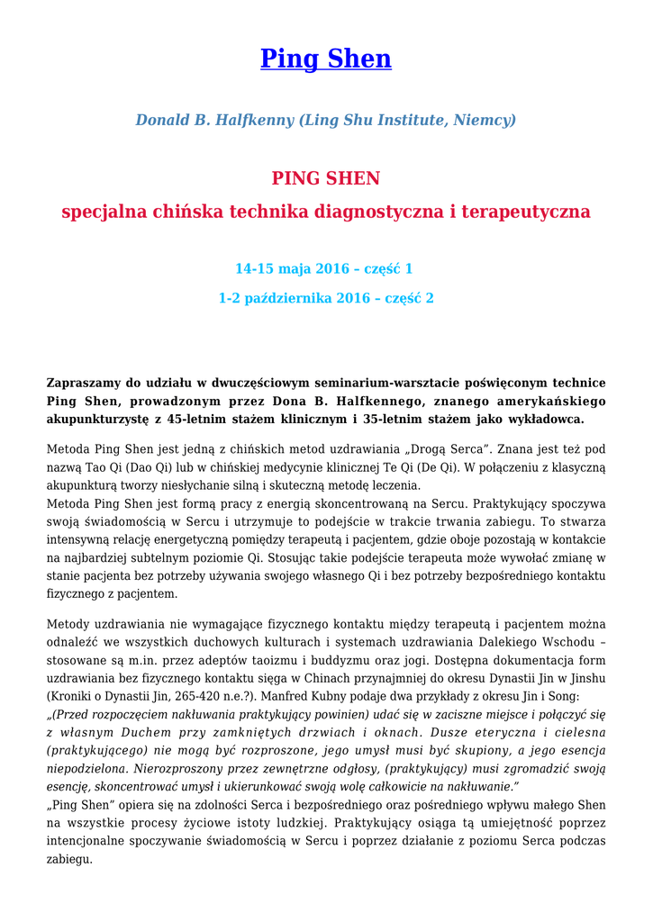 Ping Shen Donald B. Halfkenny (Ling Shu Institute, Niemcy) PING SHEN specjalna chińska technika diagnostyczna i terapeutyczna 14-15 maja 2016 – część 1 1-2 października 2016 – część 2 Zapraszamy do udziału w dwuczęściowym seminarium-warsztacie poświęconym technice Ping Shen, prowadzonym przez Dona B. Halfkennego, znanego amerykańskiego akupunkturzystę z 45-letnim stażem klinicznym i 35-letnim stażem jako wykładowca. Metoda Ping Shen jest jedną z chińskich metod uzdrawiania „Drogą Serca”. Znana jest też pod nazwą Tao Qi (Dao Qi) lub w chińskiej medycynie klinicznej Te Qi (De Qi). W połączeniu z klasyczną akupunkturą tworzy niesłychanie silną i skuteczną metodę leczenia. Metoda Ping Shen jest formą pracy z energią skoncentrowaną na Sercu. Praktykujący spoczywa swoją świadomością w Sercu i utrzymuje to podejście w trakcie trwania zabiegu. To stwarza intensywną relację energetyczną pomiędzy terapeutą i pacjentem, gdzie oboje pozostają w kontakcie na najbardziej subtelnym poziomie Qi. Stosując takie podejście terapeuta może wywołać zmianę w stanie pacjenta bez potrzeby używania swojego własnego Qi i bez potrzeby bezpośredniego kontaktu fizycznego z pacjentem. Metody uzdrawiania nie wymagające fizycznego kontaktu między terapeutą i pacjentem można odnaleźć we wszystkich duchowych kulturach i systemach uzdrawiania Dalekiego Wschodu – stosowane są m.in. przez adeptów taoizmu i buddyzmu oraz jogi. Dostępna dokumentacja form uzdrawiania bez fizycznego kontaktu sięga w Chinach przynajmniej do okresu Dynastii Jin w Jinshu (Kroniki o Dynastii Jin, 265-420 n.e.?). Manfred Kubny podaje dwa przykłady z okresu Jin i Song: „(Przed rozpoczęciem nakłuwania praktykujący powinien) udać się w zaciszne miejsce i połączyć się z własnym Duchem przy zamkniętych drzwiach i oknach. Dusze eteryczna i cielesna (praktykującego) nie mogą być rozproszone, jego umysł musi być skupiony, a jego esencja niepodzielona. Nierozproszony przez zewnętrzne odgłosy, (praktykujący) musi zgromadzić swoją esencję, skoncentrować umysł i ukierunkować swoją wolę całkowicie na nakłuwanie.” „Ping Shen” opiera się na zdolności Serca i bezpośredniego oraz pośredniego wpływu małego Shen na wszystkie procesy życiowe istoty ludzkiej. Praktykujący osiąga tą umiejętność poprzez intencjonalne spoczywanie świadomością w Sercu i poprzez działanie z poziomu Serca podczas zabiegu. „Uważny i odpowiednio skupiony Duch ludzki szybko i nieomylnie interpretuje raporty EsencjiDuchów (Jing-Shen). Dlatego podąża on od razu do źródła schorzenia, i na to miejsce wpływa… To pozwala praktykującemu podążyć ze swoimi Duchami do Duchów pacjenta… Za każdym razem, gdy ten głęboki poziom gdzie spoczywa Jing-Shen jest dotknięty przez uzdrowiciela, witalność ying qi zostaje przywrócona.” Program seminarium: Seminarium będzie miało formę warsztatu, z przewagą ćwiczeń praktycznych. Z powodu intensywnej natury energetycznej relacji powstałej pomiędzy terapeutą i pacjentem należy podkreślić, że ta metoda terapeutyczna wymaga wyjątkowej jasności umysłu i skupienia ze strony terapeuty, oraz jego świadomości o swojej roli w procesie terapeutycznym – metody, by takie umiejętności uzyskać, będą nauczane i ćwiczone podczas warsztatu. „Ping Shen” może być używany w połączeniu z różnorodnymi metodami terapeutycznymi, na przykład, ale nie tylko z: akupunkturą, masażem, Gua Sha, Moksą. Może być również stosowany jako osobna metoda terapeutyczna. Celem seminarium-warsztatu jest zapoznanie uczestników szkolenia z metodami terapeutycznymi Ping Shen, aby umożliwić im zintegrowanie ich w swojej codziennej praktyce terapeutycznej. Szkolenie odbywa się w języku angielskim i tłumaczone jest na język polski przez tłumacza dobrze znającego terminologię medycyny chińskiej i zachodniej. Miejsce seminarium: Kraków, SDH „Jubilat”, Al. Krasińskiego 1-3, VII piętro, sala konferencyjna Godziny zajęć: Sobota 10’00-18’00 (z przerwą na obiad w godz. 13’00-15’00), niedziela 9’00-16’00 (z krótką przerwą obiadową w godz. 12:00-13:00) – łącznie 15 godzin szkoleniowych. Cena seminarium: 1580 zł (łącznie za obie części) – termin wpłat do dnia 24 marca 2016 Cena zniżkowa: 1400 zł (łącznie za obie części) płatna w terminie do dnia 26 lutego 2016 Numer konta bankowego: Instytut Medycyny Chińskiej, 31-161 Kraków, ul. Szlak 14/12 Alior Bank, rachunek nr: 65 2490 0005 0000 4500 6348 0470 Prosimy o podanie tytułu wpłaty w treści: PING SHEN Cena kursu nie zawiera kosztów noclegu i wyżywienia. Uczestnicy otrzymują zaświadczenie udziału w seminarium. Na życzenie wystawiane są faktury bez VAT. Ilość miejsc ograniczona, udział wg kolejności wpłat. Donald B. Halfkenny jest znanym amerykańskim akupunkturzystą z ponad 40.letnim stażem. Był asystentem takich znanych chińskich akupunkturzystów jak: dr James Tin Yau So, dr Kenneth Chang, dr Yvonne Chen. Praktykę akupunktury rozpoczął w Bostonie w 1970 roku, a od 1976 roku wykładał na różnych amerykańskich koledżach i klinikach medycyny chińskiej. W latach 19771980 pełnił funkcję vice-dyrektora w New England School of Acupuncture, a w latach 1975-1982 był przewodniczącym Acupunture Foundation of New England. W latach 1980-1984 pracował jako dyrektor kliniki w South End Community Health Center Acupuncture and Chinese Medical Unit Boston City Hospital. Od 1986 roku mieszka, praktykuje i wykłada akupunkturę w Niemczech. Jest zapraszany na międzynarodowe kongresy TMC, gdzie prowadzi warsztaty i wykłady. Kieruje Ling Shu Institute w Sternberg i prowadzi praktykę akupunktury w Monachium. Don Halfkenny specjalizuje się m.in. w technice Ping Shen, Gua Sha, technice Jednej Igły oraz wspieraniu klasyczną akupunkturą osób terminalnie chorych. Jest członkiem Intercultural Cancer Council 