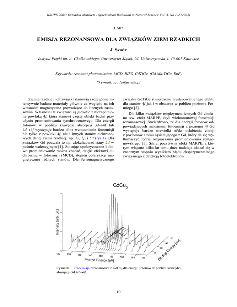 KSUPS 2005: Extended abstracts / Synchrotron Radiation in Natural Science Vol. 4, No 1-2 (2005) LA02 EMISJA REZONANSOWA DLA ZWIĄZKÓW ZIEM RZADKICH J. Szade Instytut Fizyki im. A. Chełkowskiego, Uniwersytet Śląski, Ul. Uniwersytecka 4, 40-007 Katowice Keywords: resonant photoemission, MCD, RIXS, GdTiGe, (Gd,Mn)TiGe, EuF3 *) e-mail: [email protected] związku GdTiGe stwierdzono występowanie tego efektu dla stanów 4f jak i w obszarze w pobliżu poziomu Fermiego [2]. Ziemie rzadkie i ich związki stanowią szczególnie intensywnie badane materiały głównie ze względu na ich własności magnetyczne prowadzące do licznych zastosowań. Własności te związane są głównie z niezapełnioną powłoką 4f, która stanowi częsty obiekt badań przy użyciu promieniowania synchrotronowego. Dla energii fotonów w pobliżu krawędzi absorpcji 3d→4f lub 4d→4f występuje bardzo silne wzmocnienie fotoemisji nie tylko z powłoki 4f, ale i innych stanów elektronowych danej ziemi rzadkiej, np. 5s, 5p i 5d (rys.1). Dla związków Gd pozwala to np. zlokalizować stany 5d w paśmie walencyjnym [1]. Stosując spolaryzowane kołowo promieniowanie można zbadać, dzięki efektowi dichroizmu w fotoemisji (MCD), stopień polaryzacji magnetycznej różnych stanów. Dla ferromagnetycznego Dla kilku związków międzymetalicznych Gd zbadano tzw. efekt MARPE, czyli wieloatomowej fotoemisji rezonansowej. Stwierdzono, że dla energii fotonów odpowiadających maksimum fotoemisji z poziomu 4f Gd występuje bardzo niewielki efekt osłabienia emisji z poziomów atomu sąsiadującego z Gd, który da się wytłumaczyć teorią rozpraszania promieniowania rentgenowskiego [1]. Silny, pozytywny efekt MARPE, z którym wiązano kilka lat temu duże nadzieje okazał się w znacznym stopniu wynikiem błędu eksperymentalnego związanego z detekcją fotoelektronów. Rysunek 1. Fotoemisja rezonansowa z GdCu2 dla energii fotonów w pobliżu krawędzi absorpcji Gd 4d→4f. 10 KSUPS 2005: Extended abstracts / Synchrotron Radiation in Natural Science Vol. 4, No 1-2 (2005) Na skutek oddziaływania wymiennego poziomów rdzeniowych ze spinem powłoki 4f fotoemisja z poziomów rdzeniowych Gd i innych ziem rzadkich przybiera formę rozbudowanych mutlipletów, których struktura, jak się okazuje zależy od energii fotonów. Pozwoliło to na zrozumienie pochodzenia fragmentów struktury multipletu 4d Gd i innych ziem rzadkich [3]. rzystana do zbadania emisji ze związków GdMnxTi1-xGe dla energii fotonów w pobliżu krawędzi absorpcji Gd 3d, Mn 2p i Ti 2p. Zaobserwowano emisję związaną z fluorescencją i przejścia związane ze wzbudzeniami rezonansowymi w paśmie 3d Ti i Mn [5]. Przejścia te są analizowane w porównaniu z obliczeniami struktury elektronowej dla GdTiGe i GdMnGe. Fotoemisja rezonansowa została wykorzystana do zbadania problemu mieszanej wartościowości Eu w ultra-cienkiej warstwie EuF3, gdzie zaobserwowano indukowane rezonansem stany końcowe fotoemisji równoważne dwuwartościowemu Eu [4]. Stany te nie są obserwowane w warstwie dla energii fotonów innych niż rejon przejścia 4d→4f. Ten nowy efekt można wyjaśnić zakładając transfer elektronu z liganda do atomu Eu w trakcie drugiego etapu fotoemisji rezonansowej. Emisja związana z przejściem na poziom Gd 3d3/2 (Rys. 2) wykazuje inne cechy niż dla metalicznego Gd co wskazuje na silny wpływ struktury pasmowej. Badanie emisji fotoelektronów i emisji rentgenowskiej wzbudzanych rezonansowo dostarcza cennych, często uzupełniających się informacji o strukturze elektronowej ziem rzadkich i metali przejściowych 3d. Obecność nieobsadzonych stanów 4f ziemi rzadkiej lub 3d metalu przejściowego umożliwia wykorzystanie innej rezonansowej spektroskopii emisyjnej – RIXS czyli rezonansowego nieelastycznego rozpraszania promieniowania rentgenowskiego. Technika ta została wyko- 10 Gd M5 10 d 8 8 6 Intensity [a. u.] Intensity [a. u.] Podziękowania: Wspomniane badania zostały wykonane na wiązkach VUV, SUPERESCA i BACH na synchrotronie ELETTRA w Trieście. b a 4 c 6 c 4 d b 2 2 1182 1186 1190 1194 a 0 0 2 4 6 8 Incident Photon Energy [eV] 0 10 0 1155 1 127 0 1 1 8 54 1 2 0 0 6 O u tg o in g P h oto n E n e rg y [eV ] XAS i RIXS dla GdTiGe (a) (b) Rysunek 2. Absorpcja promieniowania rentgenowskiego na krawędzi Gd 3d5/2 (a) i emisja dla wskazanych energii fotonów (b). Literatura [1] J. Szade, G. Skorek, M. Neumann, B. Schneider, F. Fangmeyer, A. Matteucci, G. Paolucci, A. Goldoni, Surf. Sci. 497 (2002) 29. [4] J. Szade, W. Burian, Z. Celinski, T. O'Keevan, M. Zangrando, F. Bondino, E. Magnano, Surf. Sci. 580 (2005) 163. [2] J. Szade, B. Tyszka, W. Burian, J. Alloys Compds. 401 (2005), w druku. [5] B. Tyszka, J. Szade, W. Burian, G. Skorek, J. Deniszczyk, M. Sikora, D. Zając, Cz. Kapusta, M. Matteucci, F. Bondino, M. Zacchigna, M. Zangrando, J. Alloys Compds. 401 (2005), w druku. [3] J. Szade, M. Neumann, I. Karla, B. Schneider, F. Fangmeyer, M. Matteucci, Solid State Commun. 113 (2000) 709. 11