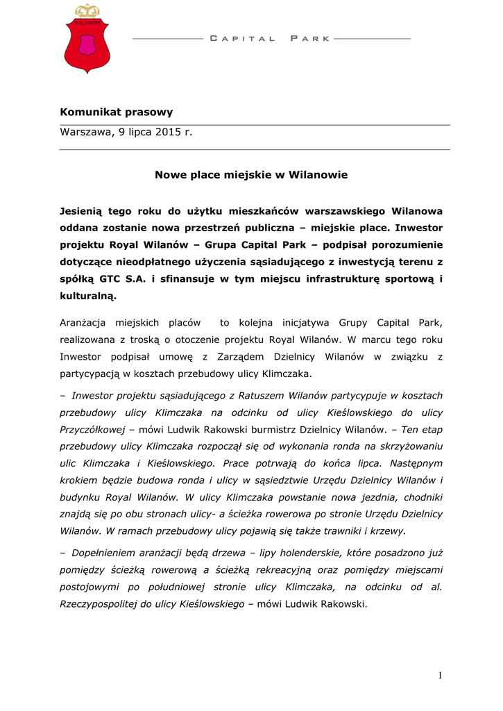 Komunikat prasowy Warszawa, 9 lipca 2015 r. INFORMACJA PRASOWA Nowe place miejskie w Wilanowie Jesienią tego roku do użytku mieszkańców warszawskiego Wilanowa oddana zostanie nowa przestrzeń publiczna – miejskie place. Inwestor projektu Royal Wilanów – Grupa Capital Park – podpisał porozumienie dotyczące nieodpłatnego użyczenia sąsiadującego z inwestycją terenu z spółką GTC S.A. i sfinansuje w tym miejscu infrastrukturę sportową i kulturalną. Aranżacja miejskich placów to kolejna inicjatywa Grupy Capital Park, realizowana z troską o otoczenie projektu Royal Wilanów. W marcu tego roku Inwestor podpisał umowę z Zarządem Dzielnicy Wilanów w związku z partycypacją w kosztach przebudowy ulicy Klimczaka. – Inwestor projektu sąsiadującego z Ratuszem Wilanów partycypuje w kosztach przebudowy ulicy Klimczaka na odcinku od ulicy Kieślowskiego do ulicy Przyczółkowej – mówi Ludwik Rakowski burmistrz Dzielnicy Wilanów. – Ten etap przebudowy ulicy Klimczaka rozpoczął się od wykonania ronda na skrzyżowaniu ulic Klimczaka i Kieślowskiego. Prace potrwają do końca lipca. Następnym krokiem będzie budowa ronda i ulicy w sąsiedztwie Urzędu Dzielnicy Wilanów i budynku Royal Wilanów. W ulicy Klimczaka powstanie nowa jezdnia, chodniki znajdą się po obu stronach ulicy- a ścieżka rowerowa po stronie Urzędu Dzielnicy Wilanów. W ramach przebudowy ulicy pojawią się także trawniki i krzewy. – Dopełnieniem aranżacji będą drzewa – lipy holenderskie, które posadzono już pomiędzy ścieżką rowerową a ścieżką rekreacyjną oraz pomiędzy miejscami postojowymi po południowej stronie ulicy Klimczaka, na odcinku od al. Rzeczypospolitej do ulicy Kieślowskiego – mówi Ludwik Rakowski. 1 Na mocy podpisanego między Grupą Capital Park, a spółką GTC S.A. porozumienia o nieodpłatnym użyczeniu terenu o powierzchni ponad 8 600 mkw. pomiędzy ulicami: Przyczółkową i Kieślowskiego powstaną dwa place miejskie. – Nasze projekty postrzegamy w kontekście wielofunkcyjnym. – mówi Kinga Nowakowska, Dyrektor Operacyjna Grupy Capital Park. – Royal Wilanów to dla nas nie tylko przestrzeń biurowa i handlowa, ale również społeczna, której istnienie chcemy wspierać tworząc miejsce spotkań i zachęcając do aktywnego spędzania czasu. Jest to projekt unikalny na skalę całej Warszawy, ponieważ jako Inwestor nie tylko aranżujemy przestrzeń komercyjną, ale również bezpłatnie udostępniamy infrastrukturę sportową i kulturalną. Mamy nadzieję, że będzie to również znakomite miejsce dla lokalnych inicjatyw dzielnicy i jej mieszkańców. Prace związane z zagospodarowaniem terenu przyszłych skwerów rozpoczęły się wraz z początkiem lipca. Ich zakończenie planowane jest na koniec września br., z wyjątkiem sceny multimedialnej, która powstanie do końca października. Łączny koszt wszystkich prac wyniesie około 1,5 mln złotych. Miejskie place przy Royal Wilanów staną się nie tylko miejscem spotkań, ale również przestrzenią nawiązywania więzi społecznych i aktywnego wypoczynku. Przestrzeń ta będzie otwarta i bezpłatnie dostępna dla wszystkich mieszkańców Wilanowa. Znajdą się tam: boiska do siatkówki plażowej i koszykówki, miniboisko do piłki nożnej, boule, szachy terenowe, ścianka wspinaczkowa, scena multimedialna z widownią, sześć trampolin zamontowanych na równi z podłożem i strefa streetworkout – przestrzeń do treningu crossfit. Na spotkanie ze znajomymi będzie można umówić się w jednym z ogródków restauracyjnych, spędzając czas w otoczeniu zieleni i fontann. W pobliżu sceny znajdzie się równiez wypożyczalnia sprzętu sportowego oraz sezonowe pop-up bary. Kontakt dla mediów: Urząd Dzielnicy Wilanów Elwira Wiechecka tel. 0 48 22 44 35 005 e-mail: [email protected] Biuro Prasowe Grupy Capital Park Katarzyna Mituła tel. 0 48 22 642 24 16, + 48 783 23 83 83 email: [email protected] 2