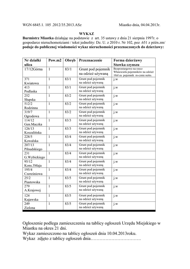 WGN 6845.1. 105 .2012/35.2013.ASz Miastko dnia, 04.04.2013r. WYKAZ Burmistrz Miastka działając na podstawie z art. 35 ustawy z dnia 21 sierpnia 1997r. o gospodarce nieruchomościami / tekst jednolity: Dz. U. z 2010 r. Nr 102, poz .651 z późn.zm/ podaje do publicznej wiadomości wykaz nieruchomości przeznaczonych do dzierżawy: Nr działki ulica 17/12Górna 371 Kwiatowa 413 Podlaska 252 Słupska 512/2 Rodzinna 319/7 Ogrodowa 114/12 Gen.Maczka 126/13 Koszalińska 228/5 Kowalska 207/13 Piłsudskiego 231 G.Wybickiego 95/12 Kons.3Maja 195/4 Czereśniowa 25/2 Piastowska 279 A.Krajowej 124 Kujawska 249 Zielona Pow.m2 Obręb Przeznaczenie Forma dzierżawy Stawka czynszu 1 83/1 Grunt pod pojemnik na odzież używaną Bezprzetargowo na rzecz Właściciela pojemników na odzież 10zł za pojemnik m-cznie netto. 1 83/1 j.w 1 83/1 1 83/2 1 83/2 1 83/2 1 83/3 1 83/3 1 83/4 1 83/4 1 83/4 1 83/4 1 83/4 1 83/5 1 83/5 Grunt pod pojemnik na odzież używaną Grunt pod pojemnik na odzież używaną Grunt pod pojemnik na odzież używaną Grunt pod pojemnik na odzież używaną Grunt pod pojemnik na odzież używaną Grunt pod pojemnik na odzież używaną Grunt pod pojemnik na odzież używaną Grunt pod pojemnik na odzież używaną Grunt pod pojemnik na odzież używaną Grunt pod pojemnik na odzież używaną Grunt pod pojemnik na odzież używaną Grunt pod pojemnik na odzież używaną Grunt pod pojemnik na odzież używaną Grunt pod pojemnik na odzież używaną 1 83/5 j.w 1 83/5 Grunt pod pojemnik na odzież używaną Grunt pod pojemnik na odzież używaną j.w j.w j.w j.w j.w j.w j.w j.w j.w j.w j.w j.w j.w j.w Ogłoszenie podlega zamieszczeniu na tablicy ogłoszeń Urzędu Miejskiego w Miastku na okres 21 dni. Wykaz zamieszczono na tablicy ogłoszeń dnia 10.04.2013roku. Wykaz zdjęto z tablicy ogłoszeń dnia…………………………….
