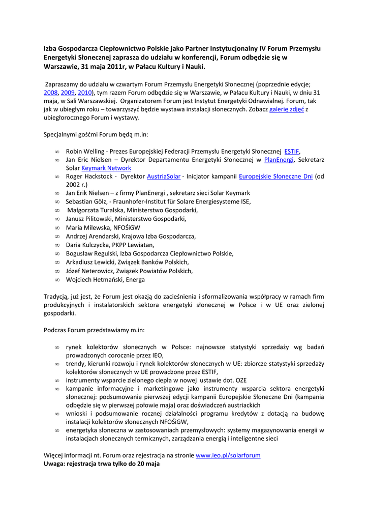 Izba Gospodarcza Ciepłownictwo Polskie jako Partner Instytucjonalny IV Forum Przemysłu Energetyki Słonecznej zaprasza do udziału w konferencji, Forum odbędzie się w Warszawie, 31 maja 2011r, w Pałacu Kultury i Nauki. Zapraszamy do udziału w czwartym Forum Przemysłu Energetyki Słonecznej (poprzednie edycje; 2008, 2009, 2010), tym razem Forum odbędzie się w Warszawie, w Pałacu Kultury i Nauki, w dniu 31 maja, w Sali Warszawskiej. Organizatorem Forum jest Instytut Energetyki Odnawialnej. Forum, tak jak w ubiegłym roku – towarzyszyć będzie wystawa instalacji słonecznych. Zobacz galerię zdjęć z ubiegłorocznego Forum i wystawy. Specjalnymi gośćmi Forum będą m.in: • • • • • • • • • • • • • • Robin Welling - Prezes Europejskiej Federacji Przemysłu Energetyki Słonecznej ESTIF, Jan Eric Nielsen – Dyrektor Departamentu Energetyki Słonecznej w PlanEnergi, Sekretarz Solar Keymark Network Roger Hackstock - Dyrektor AustriaSolar - Inicjator kampanii Europejskie Słoneczne Dni (od 2002 r.) Jan Erik Nielsen – z firmy PlanEnergi , sekretarz sieci Solar Keymark Sebastian Gölz, - Fraunhofer-Institut für Solare Energiesysteme ISE, Małgorzata Turalska, Ministerstwo Gospodarki, Janusz Pilitowski, Ministerstwo Gospodarki, Maria Milewska, NFOŚiGW Andrzej Arendarski, Krajowa Izba Gospodarcza, Daria Kulczycka, PKPP Lewiatan, Bogusław Regulski, Izba Gospodarcza Ciepłownictwo Polskie, Arkadiusz Lewicki, Związek Banków Polskich, Józef Neterowicz, Związek Powiatów Polskich, Wojciech Hetmański, Energa Tradycją, już jest, że Forum jest okazją do zacieśnienia i sformalizowania współpracy w ramach firm produkcyjnych i instalatorskich sektora energetyki słonecznej w Polsce i w UE oraz zielonej gospodarki. Podczas Forum przedstawiamy m.in: • • • • • • rynek kolektorów słonecznych w Polsce: najnowsze statystyki sprzedaży wg badań prowadzonych corocznie przez IEO, trendy, kierunki rozwoju i rynek kolektorów słonecznych w UE: zbiorcze statystyki sprzedaży kolektorów słonecznych w UE prowadzone przez ESTIF, instrumenty wsparcie zielonego ciepła w nowej ustawie dot. OZE kampanie informacyjne i marketingowe jako instrumenty wsparcia sektora energetyki słonecznej: podsumowanie pierwszej edycji kampanii Europejskie Słoneczne Dni (kampania odbędzie się w pierwszej połowie maja) oraz doświadczeń austriackich wnioski i podsumowanie rocznej działalności programu kredytów z dotacją na budowę instalacji kolektorów słonecznych NFOŚiGW, energetyka słoneczna w zastosowaniach przemysłowych: systemy magazynowania energii w instalacjach słonecznych termicznych, zarządzania energią i inteligentne sieci Więcej informacji nt. Forum oraz rejestracja na stronie www.ieo.pl/solarforum Uwaga: rejestracja trwa tylko do 20 maja