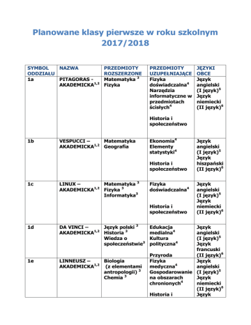 Planowane klasy pierwsze w roku szkolnym 2017/2018 SYMBOL NAZWA ODDZIAŁU 1a PITAGORAS AKADEMICKA1,2 PRZEDMIOTY ROZSZERZONE Matematyka 3 Fizyka PRZEDMIOTY UZUPEŁNIAJĄCE Fizyka doświadczalna4 Narzędzia informatyczne w przedmiotach ścisłych4 JĘZYKI OBCE Język angielski (I język)5 Język niemiecki (II język)6 Historia i społeczeństwo 1b VESPUCCI – Matematyka 1,2 AKADEMICKA Geografia Ekonomia4 Elementy statystyki4 Historia i społeczeństwo 1c LINUX – Matematyka 3 AKADEMICKA1,2 Fizyka 3 Informatyka3 Fizyka doświadczalna4 Historia i społeczeństwo 1d DA VINCI – Język polski 3 AKADEMICKA1,2 Historia 3 Wiedza o społeczeństwie3 1e LINNEUSZ – Biologia AKADEMICKA1,2 (z elementami antropologii) 3 Chemia 3 Edukacja medialna4 Kultura polityczna4 Język angielski (I język)5 Język hiszpański (II język)6 Język angielski (I język)5 Język niemiecki (II język)6 Język angielski (I język)5 Język francuski Przyroda (II język)6 Fizyka Język medyczna4 angielski Gospodarowanie (I język)5 na obszarach Język 4 chronionych niemiecki (II język)6 Historia i Język społeczeństwo 1F AVICENNA – Biologia AKADEMICKA1,2 (z elementami antropologii) 3 Chemia3 Fizyka medyczna4 Język łaciński w naukach medycznych i przyrodniczych4 Historia i społeczeństwo francuski (II język)6 Język angielski (I język)5 Język niemiecki (II język)6 Język francuski (II język)6 1 Zapoznaj się z charakterystyką klasy w zakładce „Opis klas pierwszych”. 2 Zapoznaj się z działalnością klas akademickich w zakładce „Liceum Akademickie”. 3 W klasach akademickich przedmioty rozszerzone realizowane na podstawie autorskich programów nauczania. 4 Przedmioty uzupełniające realizowane na podstawie autorskich programów nauczania. 5 I język: obowiązkowa kontynuacja nauki języka - grupy tworzone na podstawie stopnia zaawansowania znajomości I języka obcego (uczniowie klas pierwszych przypisywani będą do grup wg stopnia zaawansowania na podstawie diagnozy wiedzy i umiejętności z języka angielskiego przeprowadzanej w pierwszym dniu nauki roku szkolnego 2017/18). 6 II język: poziom nauczania w grupie uzależniony jest od stopnia zaawansowania znajomości II języka obcego (uczniowie klas pierwszych przypisywani będą do grup na podstawie informacji złożonej w formularzu wyboru drugiego języka obcego – do pobrania w zakładce „Formularz wyboru II j. obcego” lub w sekretariacie szkoły). Pierwszeństwo w zakresie przydzielania do grupy językowej posiada uczeń z wyższą punktacją. Minimalna liczba osób w grupie – 14 uczniów.