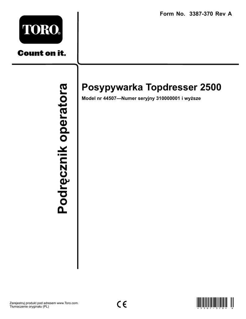 Form No. 3387-370 Rev A Posypywarka Topdresser 2500 Model nr 44507—Numer seryjny 310000001 i wyższe Zarejestruj produkt pod adresem www.Toro.com. Tłumaczenie oryginału (PL) *3387-370* A niebezpieczeństwo, mogące spowodować poważne obrażenia lub śmierć w razie zlekceważenia zalecanych środków ostrożności. Produkt jest zgodny z wszelkimi stosownymi dyrektywami europejskimi, szczegółowe informacje zostały podane w osobnym formularzu deklaracji zgodności dla danego produktu. Rysunek 2 Wprowadzenie 1. Symbol ostrzegawczy. Posypywarka TopDresser holowana jest przez pojazd typu Workman lub inny pojazd użytkowy. Jest ona przeznaczona do obsługi przez operatorów w zastosowaniach komercyjnych. Posypywarka została zasadniczo zaprojektowana pod kątem odmierzania i rozprowadzania materiałów w różnych warunkach wilgotności. Posypywarka nie jest podatna za zatykanie i nie ma znaczącego wpływu na rozprowadzanie materiałów. W niniejszej instrukcji obsługi stosowane są dwa terminy w celu podkreślenia stopnia ważności informacji. Ważne zwraca uwagę na szczególne informacje techniczne, a Uwaga podkreśla informacje ogólne wymagające uwagi. Należy przeczytać uważnie poniższe informacje, aby poznać zasady właściwej obsługi i konserwacji urządzenia, nie uszkodzić go i uniknąć obrażeń ciała. Odpowiedzialność za prawidłowe i bezpieczne użytkowanie produktu spoczywa na Tobie. Można skontaktować się z firmą Toro bezpośrednio poprzez: www.Toro.com aby uzyskać informacje na temat urządzenia i akcesoriów, znaleźć dealera lub zarejestrować swoje urządzenie. Aby skorzystać z serwisu, zakupić oryginalne części Toro lub uzyskać dodatkowe informacje, należy skontaktować się z przedstawicielem autoryzowanego serwisu lub biurem obsługi klienta firmy Toro, a także przygotować numer modelu i numer seryjny urządzenia. Rysunek 1 przedstawia położenie nazewnictwa modelu oraz numeru seryjnego na urządzeniu. Należy zapisać je w przewidzianym na to miejscu. Rysunek 1 1. Położenie numeru modelu i numeru seryjnego Model nr Numer seryjny Niniejsza instrukcja zawiera opis potencjalnych zagrożeń, a zawarte w niej ostrzeżenia zostały oznaczone symbolem ostrzegawczym (Rysunek 2), który sygnalizuje © 2014—The Toro® Company 8111 Lyndale Avenue South Bloomington, MN 55420 2 Napisz do nas pod adres www.Toro.com. Wydrukowano w Stanach Zjednoczonych. Wszelkie prawa zastrzeżone Spis treści Bezpieczeństwo Bezpieczeństwo ............................................................. 3 Przed rozpoczęciem eksploatacji ............................... 3 Podczas pracy z maszyną .......................................... 4 Konserwacja ........................................................... 4 Naklejki informacyjne i ostrzegawcze ........................ 5 Montaż ......................................................................... 7 1 Specjalne instrukcje dotyczące pojazdu Workman (3000/4000) i innych użytkowych pojazdów holowniczych (traktorów): .................................... 8 2 Zamontuj dyszel ................................................... 8 3 Zabezpiecz zaczep dyszla ....................................... 8 4 Zamocuj opcjonalną stopę podporową dyszla ................................................................. 9 5 Zamontuj wiązkę przewodów ................................. 9 6 Zamocuj płozy ....................................................10 Przegląd produktu .........................................................10 Elementy sterowania ..............................................10 Specyfikacje ..........................................................10 Wymagany osprzęt .................................................11 Akcesoria opcjonalne..............................................11 Zalecane akcesoria..................................................11 Osprzęt/akcesoria..................................................11 Działanie .....................................................................11 Sprawdź płyn w układzie hydraulicznym ....................11 Sprawdź ciśnienie w oponach ...................................13 Sprawdź moment obrotowy śrub koła. ......................13 Instrukcja obsługi...................................................13 Obsługa ................................................................15 Prędkość posypywania piasku...................................15 Środki ostrożności dotyczące piasku..........................15 Praca w niskich temperaturach .................................16 Konserwacja ................................................................17 Zalecany harmonogram konserwacji ............................17 Przed wykonaniem konserwacji ...................................17 Ustawianie stopy podporowej posypywarki ................17 Smarowanie ..............................................................18 Smarowanie łożysk i tulei.........................................18 Konserwacja układu napędowego ................................18 Regulacja napięcia łańcuchów napędowych ........................................................................18 Konserwacja pasków napędowych ...............................19 Regulacja taśmy przenośnika ....................................19 Wymiana taśmy przenośnika ....................................19 Konserwacja instalacji hydraulicznej .............................22 Wymiana płynu hydraulicznego ................................22 Wymiana filtra oleju hydraulicznego ..........................23 Sprawdzanie przewodów i węży hydraulicznych..................................................................23 Diagnostyka układu hydraulicznego ..........................23 Regulacja szczotki ......................................................25 Czyszczenie ..............................................................26 Przechowywanie ............................