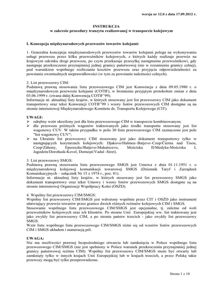 wersja nr 12.0 z dnia 17.09.2012 r. INSTRUKCJA w zakresie procedury tranzytu realizowanej w transporcie kolejowym I. Koncepcja międzynarodowych przewozów towarów kolejami: 1. Generalna koncepcja międzynarodowych przewozów towarów kolejami polega na wykonywaniu usługi przewozu przez kilku przewoźników kolejowych, z których kaŜdy realizuje przewóz na krajowym odcinku drogi przewozu, po czym przekazuje przesyłkę następnemu przewoźnikowi, gdy następuje przekroczenie przynajmniej jednej granicy państwowej (nie w rozumieniu granicy celnej), pod warunkiem wspólnego rozliczania kosztów przewozu oraz przyjęcia odpowiedzialności za powstanie ewentualnych nieprawidłowości (w tym za powstanie naleŜności celnych). 2. List przewozowy CIM: Podstawą prawną stosowania listu przewozowego CIM jest Konwencja z dnia 09.05.1980 r. o międzynarodowym przewozie kolejami (COTIF), w brzmieniu przyjętym protokołem zmian z dnia 03.06.1999 r. (zwana dalej Konwencją COTIF’99). Informacje nt. aktualnej listy krajów, w których stosowany jest list przewozowy CIM jako dokument transportowy oraz tekst Konwencji COTIF’99 i wzory listów przewozowych CIM dostępne są na stronie internetowej Międzynarodowego Komitetu ds. Transportu Kolejowego (CIT). UWAGI: odrębny wzór określony jest dla listu przewozowego CIM w transporcie kombinowanym; dla przewozu próŜnych wagonów traktowanych jako środki transportu stosowany jest list wagonowy CUV. W takim przypadku w polu 30 listu przewozowego CIM zaznaczone jest pole "list wagonowy CUV"; na Ukrainie list przewozowy CIM stosowany jest jako dokument transportowy tylko w następujących korytarzach kolejowych: Djakovo/Halmeu–Batjevo–Czop/Čierna nad Tisou, Czop/Záhony, Epereszke/Batjevo-Mukatscevo, Mościska II/Medyka-Mościska I, Jagodzin/Dorohusk-Kovel, Dorneşti/Vadul -Siret). 3. List przewozowy SMGS: Podstawą prawną stosowania listu przewozowego SMGS jest Umowa z dnia 01.11.1951 r. o międzynarodowej kolejowej komunikacji towarowej SMGS (Dziennik Taryf i Zarządzeń Komunikacyjnych – załącznik Nr 15 z 1974 r., poz. 81). Informacje nt. aktualnej listy krajów, w których stosowany jest list przewozowy SMGS jako dokument transportowy oraz tekst Umowy i wzory listów przewozowych SMGS dostępne są na stronie internetowej Organizacji Współpracy Kolei (OSśD). 4. Wspólny list przewozowy CIM/SMGS: Wspólny list przewozowy CIM/SMGS jest wdroŜony wspólnie przez CIT i OSśD jako instrument ułatwiający przewóz towarów przez granice dwóch róŜnych reŜimów kolejowych CIM i SMGS. Stosowanie wspólnego listu przewozowego CIM/SMGS jest opcjonalne, tj. zaleŜne od woli przewoźników kolejowych oraz ich klientów. Po stronie Unii Europejskiej ww. list traktowany jest jako zwykły list przewozowy CIM, a po stronie państw trzecich - jako zwykły list przewozowy SMGS. Wzór listu wspólnego listu przewozowego CIM/SMGS róŜni się od wzorów listów przewozowych CIM i SMGS układem i numeracją pól. UWAGA: Nie ma moŜliwości prawnej bezpośredniego otwarcia lub zamknięcia w Polsce wspólnego listu przewozowego CIM/SMGS (nie jest spełniony w Polsce warunek przekroczenia przynajmniej jednej granicy państwowej reŜimu CIM). Wspólny list przewozowy CIM/SMGS moŜe być otwarty lub zamknięty tylko w innych krajach Unii Europejskiej lub w krajach trzecich, a przez Polskę takie przewozy mogą być tylko przeprowadzone. Strona 1 z 10 wersja nr 12.0 z dnia 17.09.2012 r. II. Uproszczenie w procedurze tranzytu w transporcie kolejowym: UWAGA: PoniŜsze zasady dot. wyłącznie listu przewozowego CIM oraz, odpowiednio, wspólnego listu przewozowego CIM/SMGS. Co do zasady, list przewozowy SMGS nie moŜe być stosowany w Unii Europejskiej jako zgłoszenie tranzytowe. 1. Podstawą prawną dla stosowania uproszczenia są art. 412 – 425 oraz art. 441 - 442a rozporządzenia Komisji (EWG) nr 2454/93 z dnia 02.07.1993 r. ustanawiającego przepisy w celu wykonania rozporządzenia Rady (EWG) nr 2913/92 ustanawiającego Wspólnotowy Kodeks Celny (Dz. Urz. UE Polskie Wydanie Specjalne, rozdz. 2, t. 6, str. 3), zwanego dalej RWKC, oraz przepisy Konwencji z dnia 20.05.1987 r. o wspólnej procedurze tranzytowej (Dz. U. WE L 226 z 13.08.1987 r., str. 1; Dz. Urz. UE Polskie wydanie specjalne, rozdz. 2, t. 2, str. 291, z późn. zm.), zwanej dalej „Konwencją o wpt”. Stosowanie wspólnego listu przewozowego CIM/SMGS jako zgłoszenia tranzytowego oparte jest na tych samych przepisach, jak dla listu przewozowego CIM. 2. Warunki uzyskania uprawnienia do stosowania uproszczenia (muszą być spełnione łącznie): przedsiębiorstwo stosuje list przewozowy CIM jako dokument transportowy (informacje dostępne na stronie internetowej CIT); przedsiębiorstwa kolejowe współpracują ze sobą wykonując wspólnie usługę przewozu towarów w ramach tzw. łańcucha przewozowego, tzn. kaŜdy kolejny przewoźnik realizuje przewóz na krajowym odcinku, po czym przekazuje przesyłkę następnemu przewoźnikowi; uprawnione przedsiębiorstwa kolejowe prowadzą tzw. biura rachunkowe, w których oddzielnie rozliczają koszty (w tym nalezności celne) wg połączeń transportowych i miesięcy. Biura rachunkowe kolei są nadzorowane przez organy celne w poszczególnych krajach; uprawnione przedsiębiorstwa kolejowe stosują uzgodniony system kontroli i wyjaśniania nieprawidłowości, Aktualny wykaz przewoźników uprawnionych w Unii Europejskiej do stosowania uproszczenia opublikowany jest na stronie internetowej Ministerstwa Finansów w części dot. procedury tranzytu. 3. Zgodnie z art. 95 ust. 1 lit. d rozporządzenia Rady (EWG) nr 2913/92 z dnia 12.10.1992 r. ustanawiającego Wspólnotowy Kodeks Celny (Dz. Urz. WE L 302 z 19.10.1992, str. 1, z późn. zm.; Dz. Urz. UE Polskie wydanie specjalne, roz. 2, t. 4, str. 307), zwanego dalej WKC, oraz zgodnie z Konwencją o wpt, przewozy towarów w uproszczeniu w procedurze tranzytu w transporcie kolejowym zwolnione są z moc